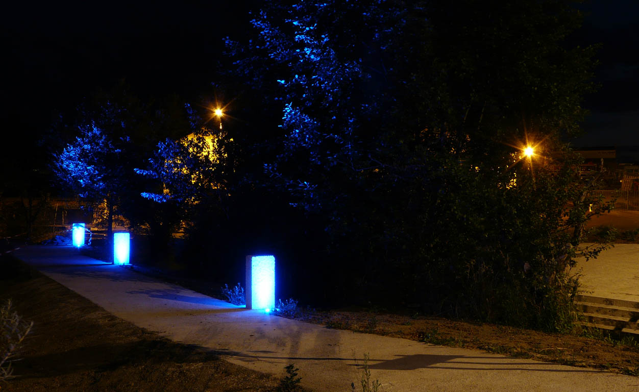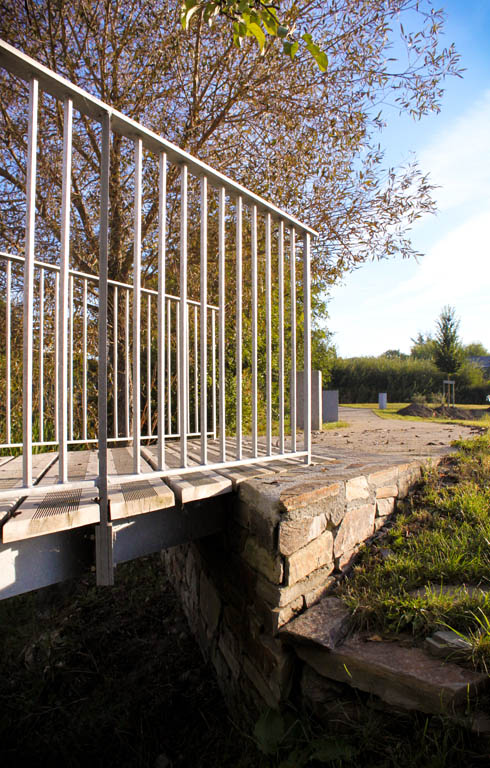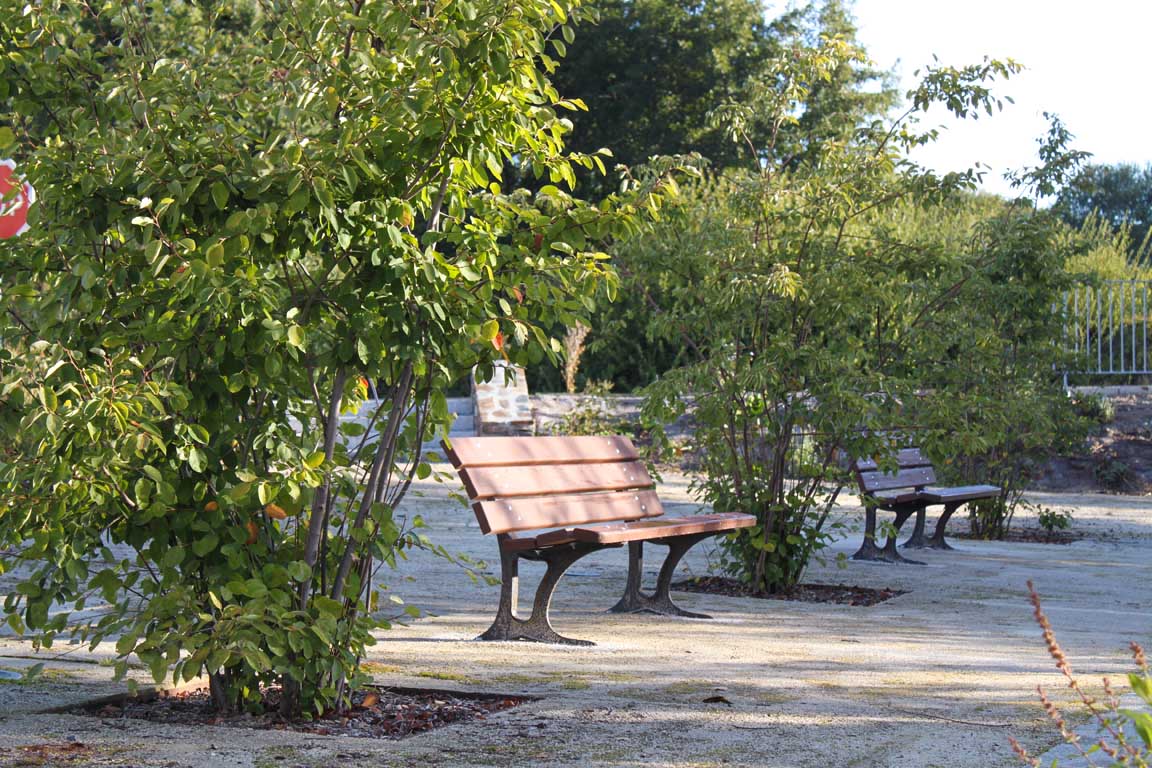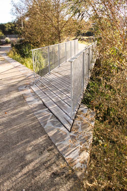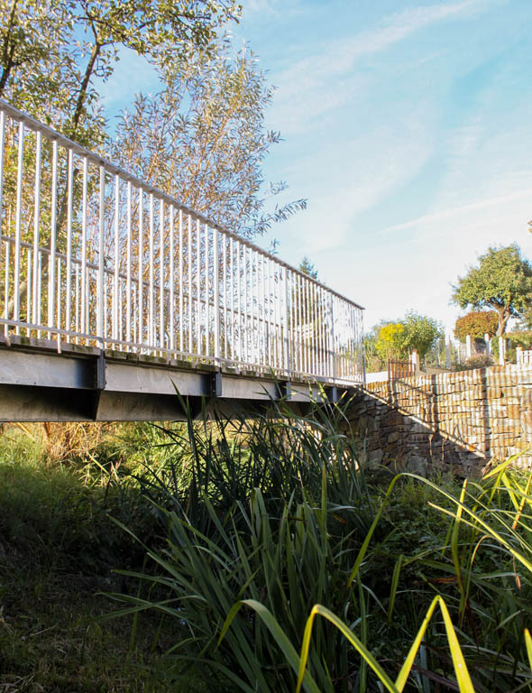 Réalisée en acier galvanisé et en bois, une nouvelle passerelle enjambe le Carofe, cours d’eau dont les berges sont revalorisées dans le projet. Retenue par un mur de soutènement en schiste, une placette favorise les perceptions visuelles sur le cours d’eau et la diversité floristique et faunistique qui la caractérise.