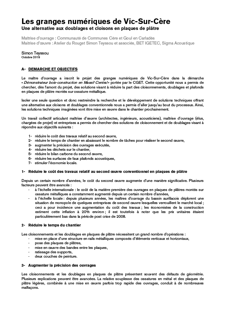 12 octobre 2019 Dans Écrits, Médias Catégories Les granges numériques de Vic-Sur-Cère, une alternative aux doublages et cloisons en plaques de plâtre Les granges numériques de Vic-Sur-Cère Une alternative aux doublages et cloisons en plaques de plâtre. Article de Simon Teyssou, Octobre 2019