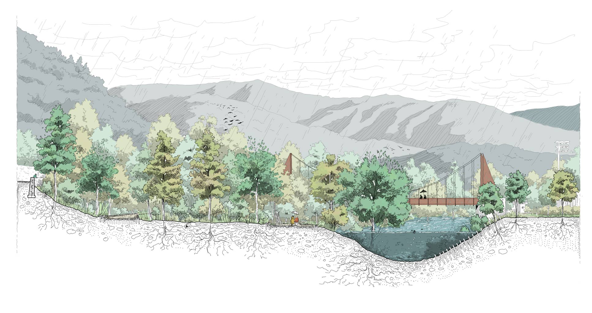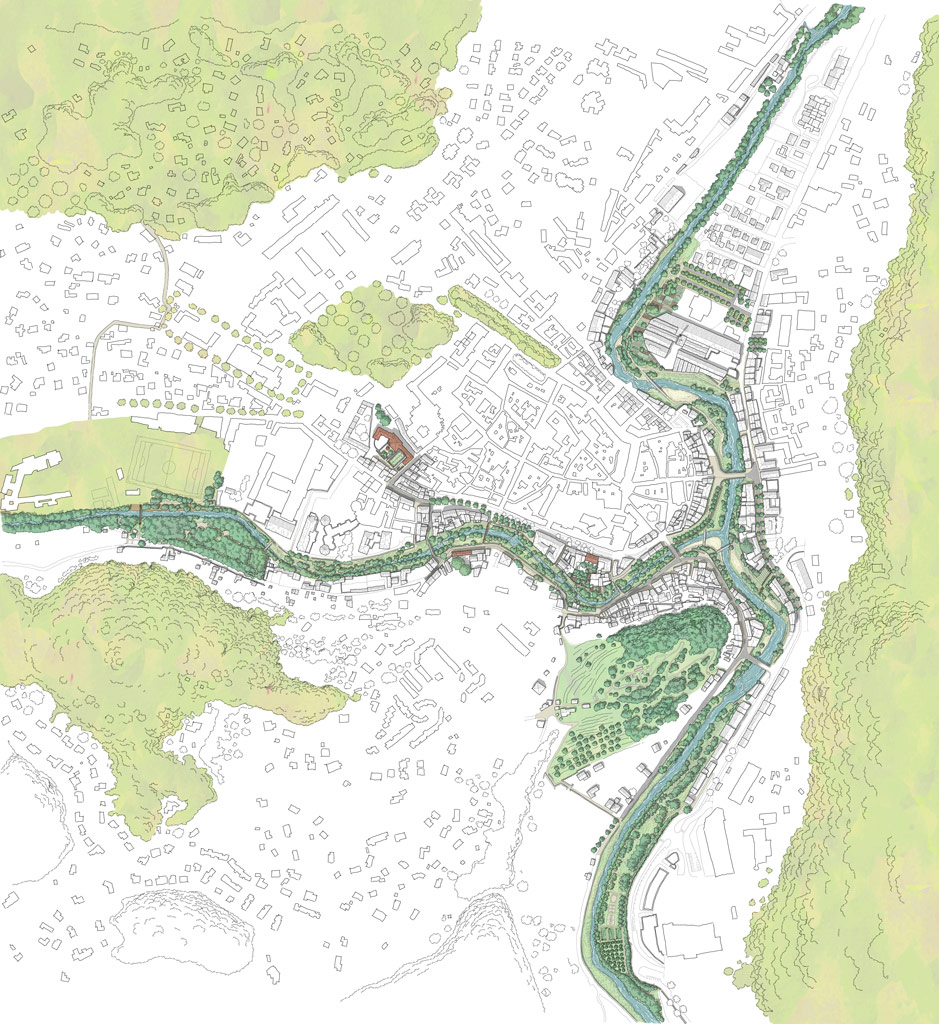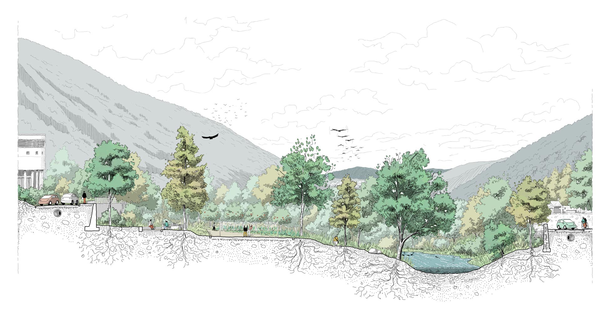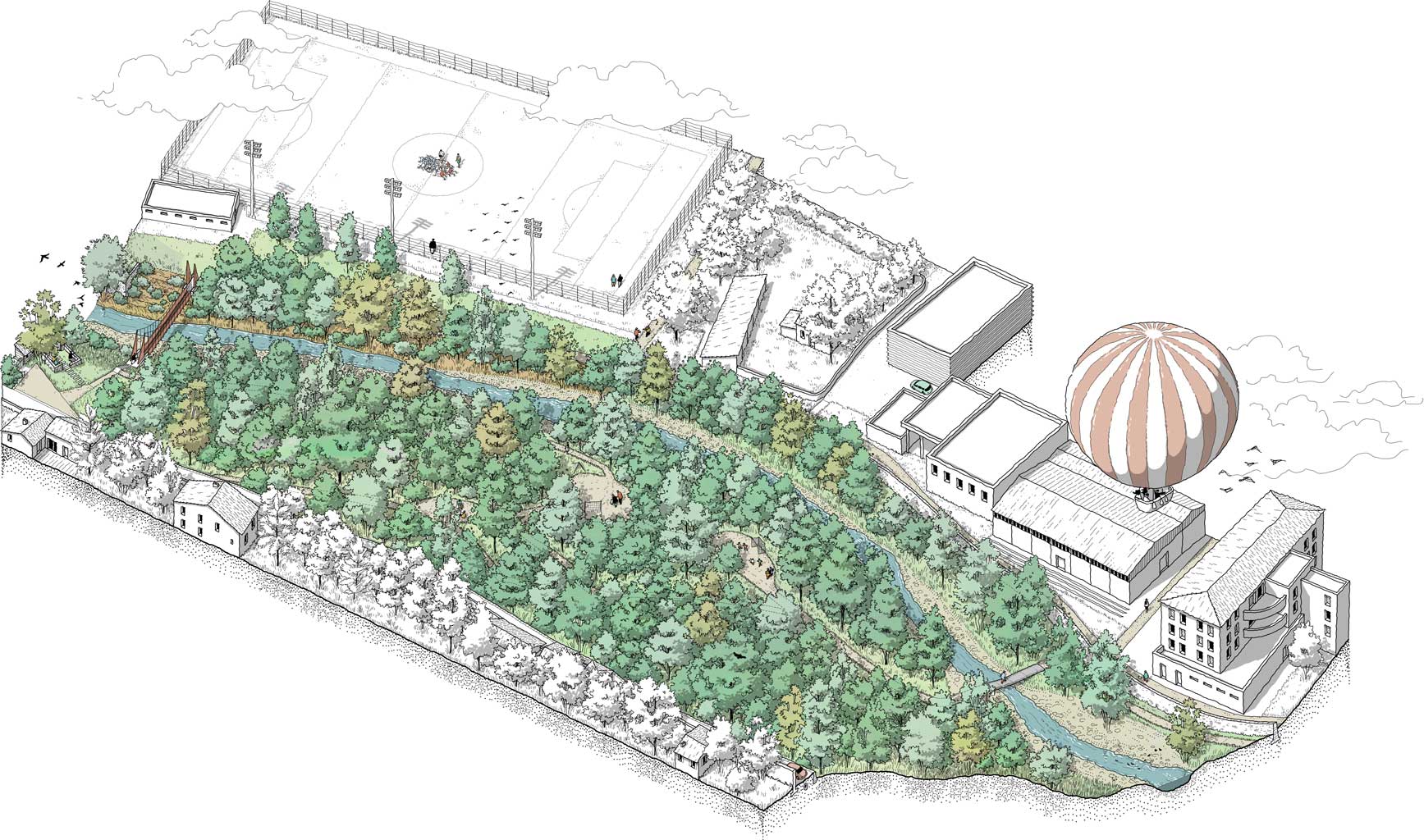 La transformation urbaine s’organise autour du parc fluvial de la Confluence. Chaque aménagement du parc devient un refuge climatique et un espace social, offrant ombre, nature et dignité à une population souvent privée de balcons, loggias ou jardins privatifs. En redonnant aux rivières leur rôle central, il devient une colonne vertébrale de mobilités douces, reliant les quartiers par des parcours en long et en travers. Le parc assume les crues, restitue une place aux milieux non humains et crée un espace de cohabitation entre habitants et biodiversité. Mais il est aussi un espace culturel informel, accessible à pied, accueillant promenade, sport, fêtes populaires et pratiques artistiques. En écho, la salle de spectacle prolonge cette dynamique dans un équipement structurant. Ensemble, parc et salle affirment que la culture se déploie dans les usages, les espaces publics, l’architecture et le paysage.