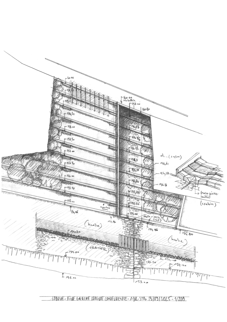 Lieu : 34700, Lodève Maître d’ouvrage : Ville de Lodève Équipe de maîtrise d’oeuvre : Architecte urbaniste paysagiste mandataire : Atelier du Rouget Simon Teyssou et ssociés Ingénierie VRD : Sud Infra Environnement Structure, fluides, économiste : IGETEC Acoustique : Sigma Acoustique Expertise hydraulique : Iddre Expertise écologique : Cabinet Ectare Scénographie : Catherine Marquet Illustrations : Gaëtan Amossé Maquettes : Maquette Madness - Quentin Barthe Responsable du projet : Simon Teyssou, Anaëlle Pacaud, Bertille Istasse Budget des travaux : 8 960 000€ HT (Infrastructe et paysage : 5 397 000€ HT / Salle de spectacle : 3 563 000€ HT) Statut : Lauréat 2025
