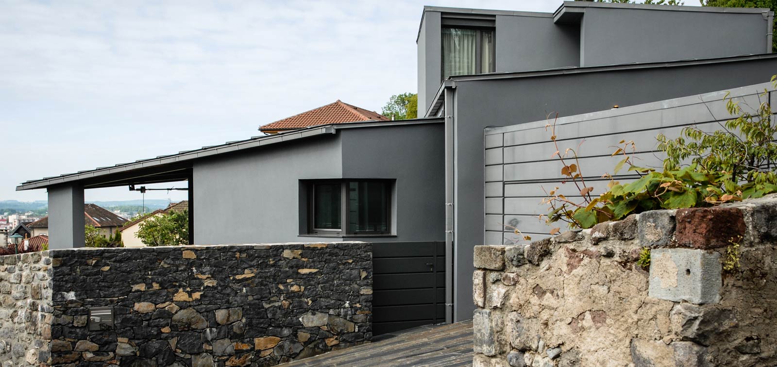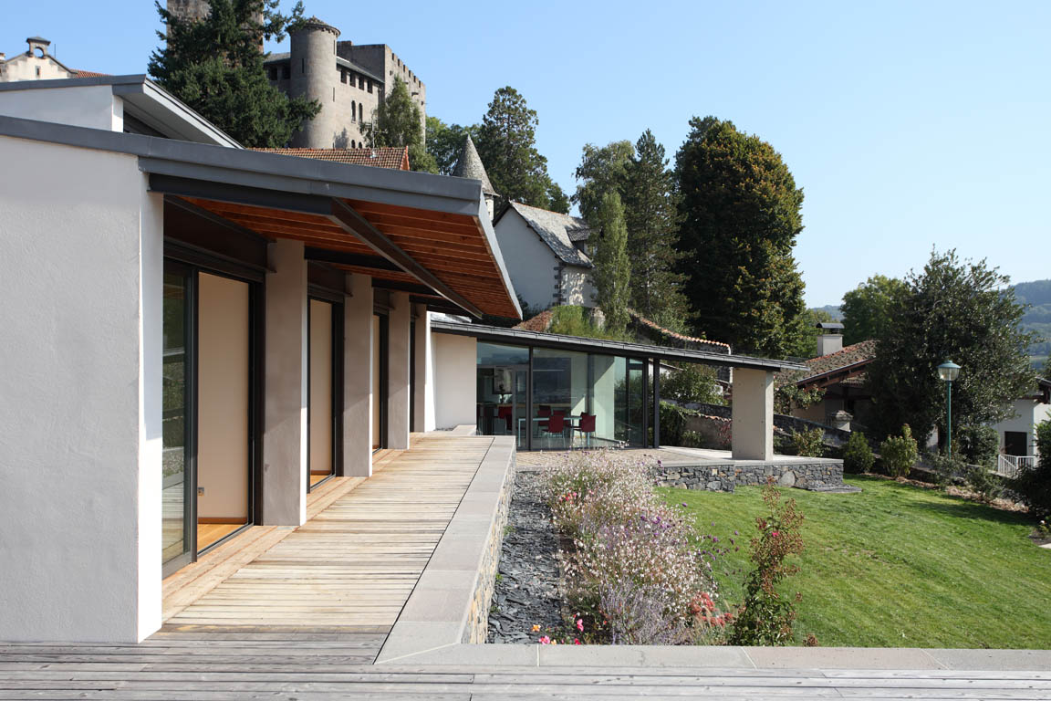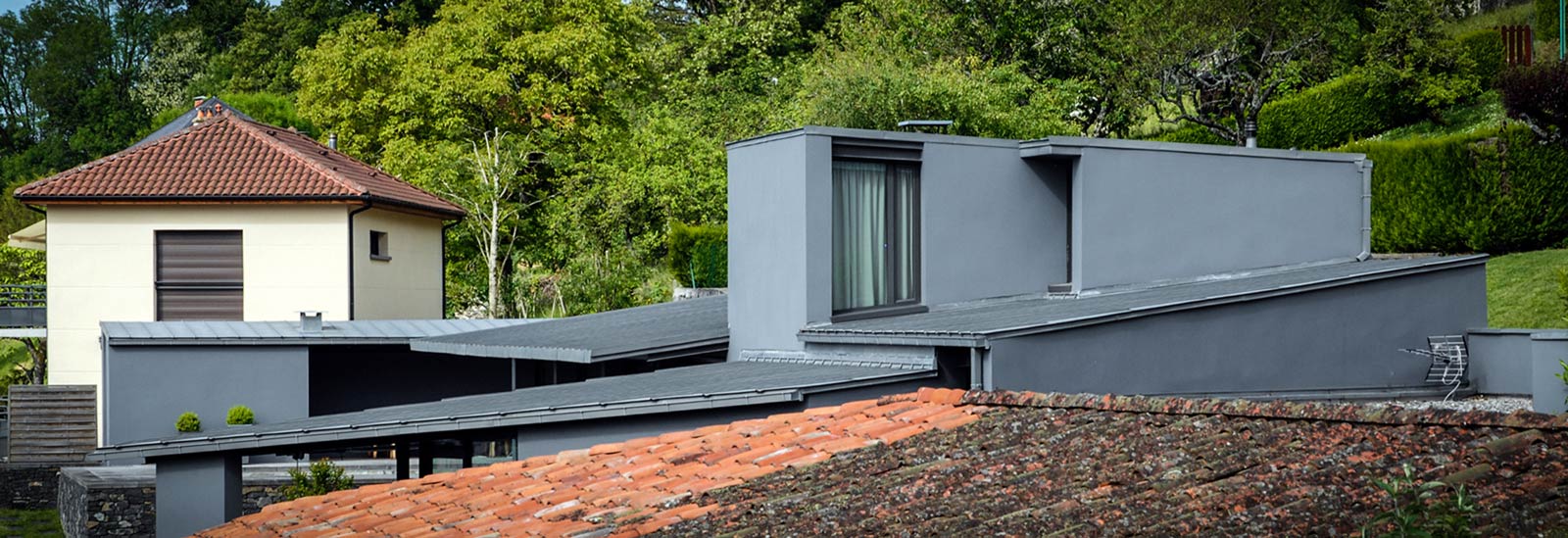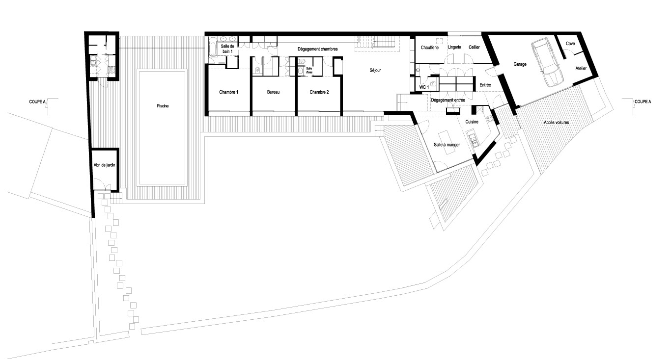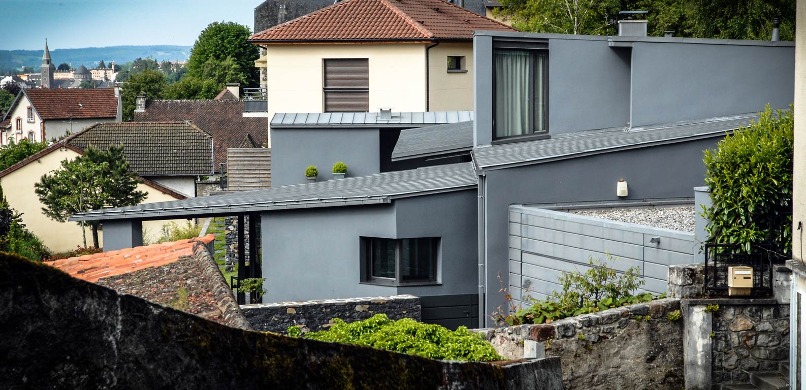 En contrebas du château Saint-Etienne à Aurillac, le site, autrefois occupé par le potager et le verger d’une propriété plus vaste, dispose de rares qualités exploitées dans le projet. L’habitation, basse, horizontale et linéaire, la piscine et le pool house occupent le nord de la parcelle pour libérer un maximum de terrain. L’habitation s’appuie sur un mur de soutènement existant et s’ouvre largement vers le sud et le sud-ouest pour profiter pleinement des vues lointaines sur le bassin d’Aurillac et d’Arpajon-sur-Cère. Les aménagements extérieurs prolongeant le bâti forment des plates-formes retenues par des murs de soutènement en pierres volcaniques établissant un dialogue avec les terrains avoisinants aussi cernés de murs. Une vaste toiture en zinc à la pente faible, reprenant le profil du terrain existant, recouvre les espaces intérieurs et partiellement les terrasses extérieures contiguës exacerbant la relation privilégiée entre l’intérieur et l’extérieur. Une surface dallée en ardoises précède le garage fermé par une porte basculante couverte de feuilles de zinc. Les terrasses extérieures sont réalisées avec un caillebotis en mélèze.