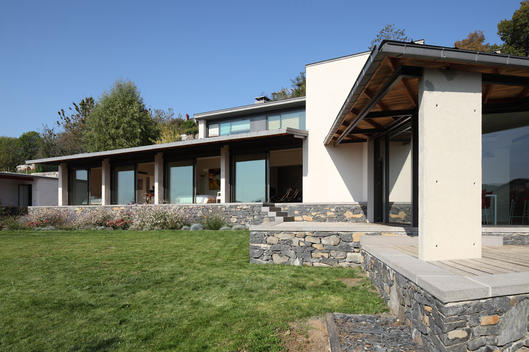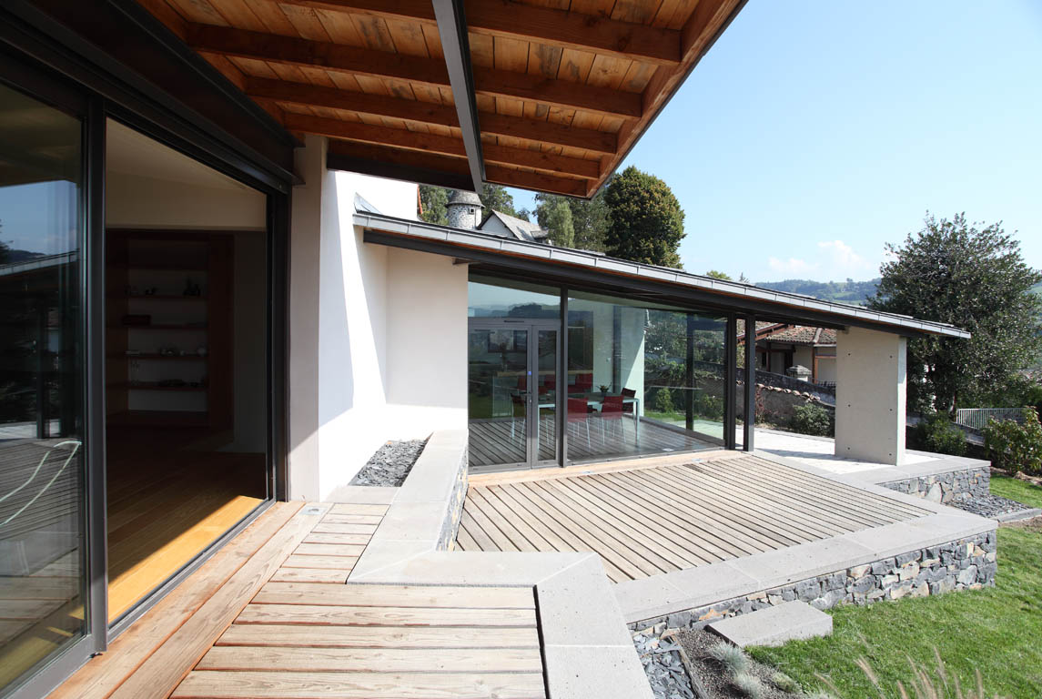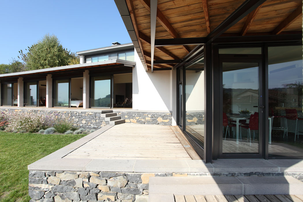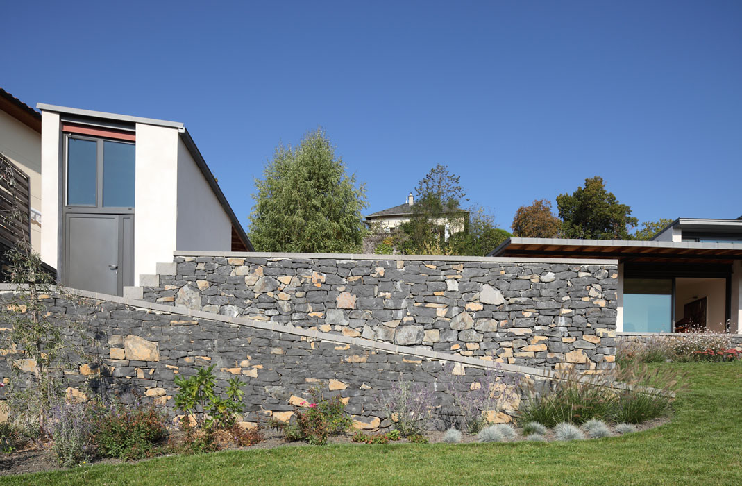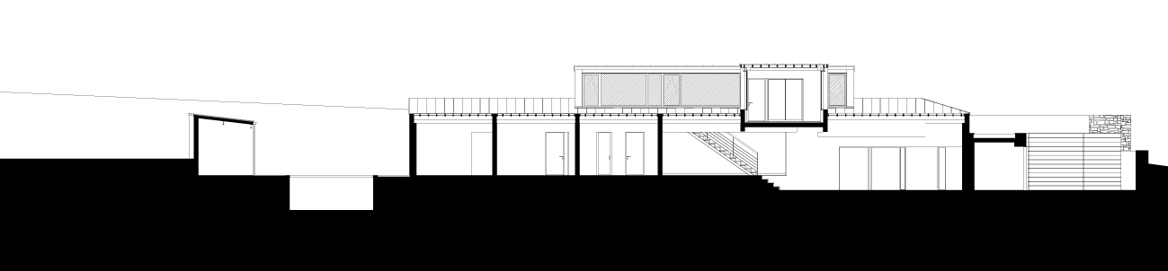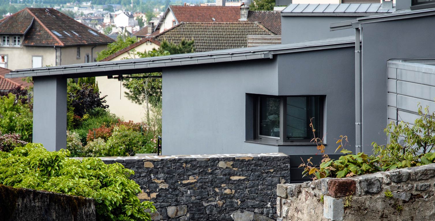 En contrebas du château Saint-Etienne à Aurillac, le site, autrefois occupé par le potager et le verger d’une propriété plus vaste, dispose de rares qualités exploitées dans le projet. L’habitation, basse, horizontale et linéaire, la piscine et le pool house occupent le nord de la parcelle pour libérer un maximum de terrain. L’habitation s’appuie sur un mur de soutènement existant et s’ouvre largement vers le sud et le sud-ouest pour profiter pleinement des vues lointaines sur le bassin d’Aurillac et d’Arpajon-sur-Cère. Les aménagements extérieurs prolongeant le bâti forment des plates-formes retenues par des murs de soutènement en pierres volcaniques établissant un dialogue avec les terrains avoisinants aussi cernés de murs. Une vaste toiture en zinc à la pente faible, reprenant le profil du terrain existant, recouvre les espaces intérieurs et partiellement les terrasses extérieures contiguës exacerbant la relation privilégiée entre l’intérieur et l’extérieur. Une surface dallée en ardoises précède le garage fermé par une porte basculante couverte de feuilles de zinc. Les terrasses extérieures sont réalisées avec un caillebotis en mélèze.