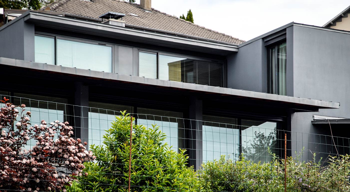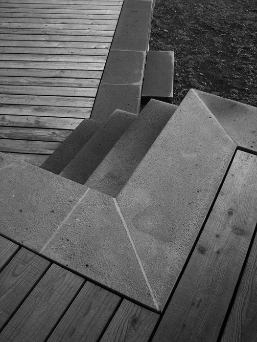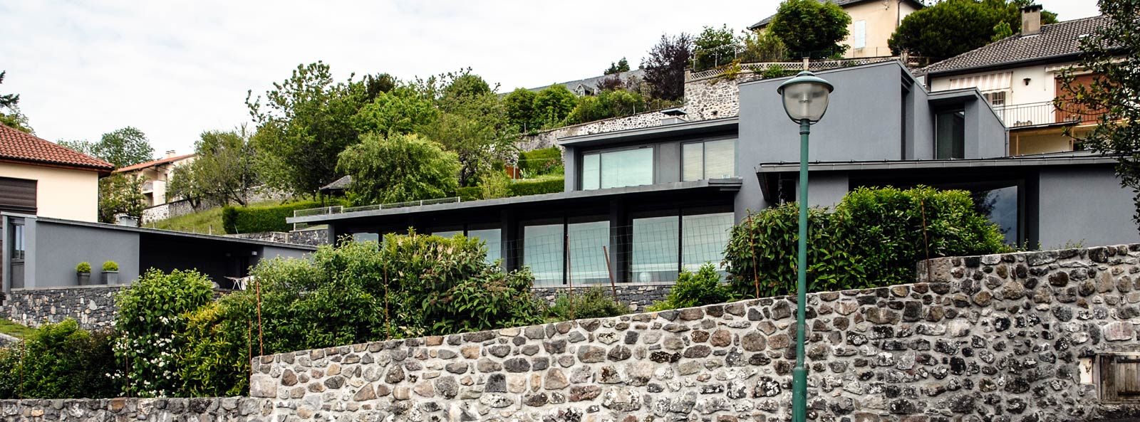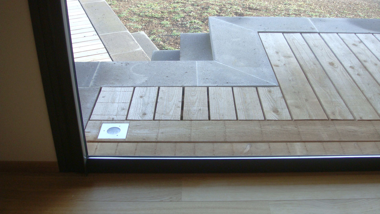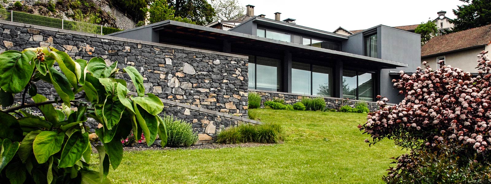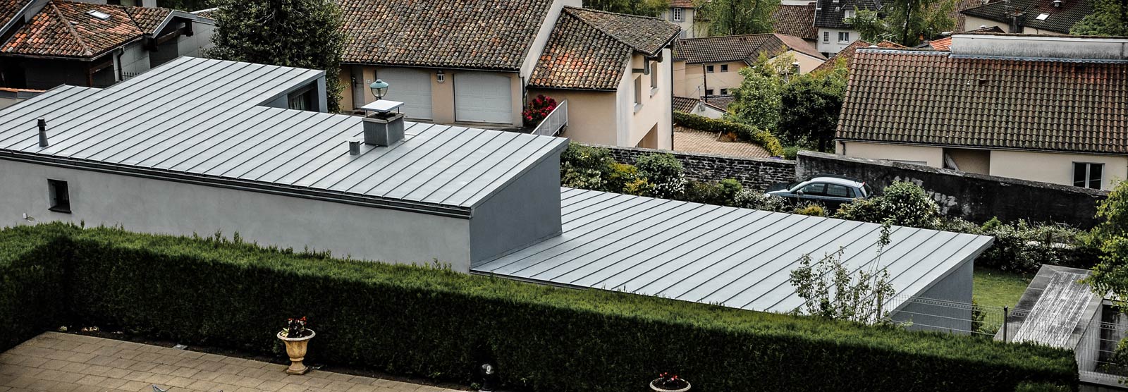 En contrebas du château Saint-Etienne à Aurillac, le site, autrefois occupé par le potager et le verger d’une propriété plus vaste, dispose de rares qualités exploitées dans le projet. L’habitation, basse, horizontale et linéaire, la piscine et le pool house occupent le nord de la parcelle pour libérer un maximum de terrain. L’habitation s’appuie sur un mur de soutènement existant et s’ouvre largement vers le sud et le sud-ouest pour profiter pleinement des vues lointaines sur le bassin d’Aurillac et d’Arpajon-sur-Cère. Les aménagements extérieurs prolongeant le bâti forment des plates-formes retenues par des murs de soutènement en pierres volcaniques établissant un dialogue avec les terrains avoisinants aussi cernés de murs. Une vaste toiture en zinc à la pente faible, reprenant le profil du terrain existant, recouvre les espaces intérieurs et partiellement les terrasses extérieures contiguës exacerbant la relation privilégiée entre l’intérieur et l’extérieur. Une surface dallée en ardoises précède le garage fermé par une porte basculante couverte de feuilles de zinc. Les terrasses extérieures sont réalisées avec un caillebotis en mélèze.