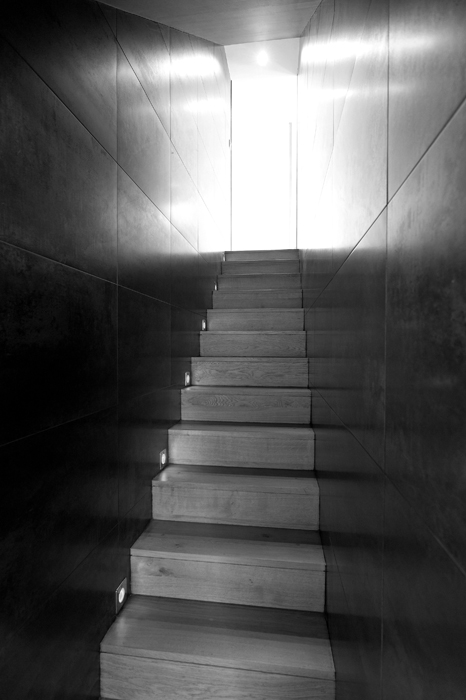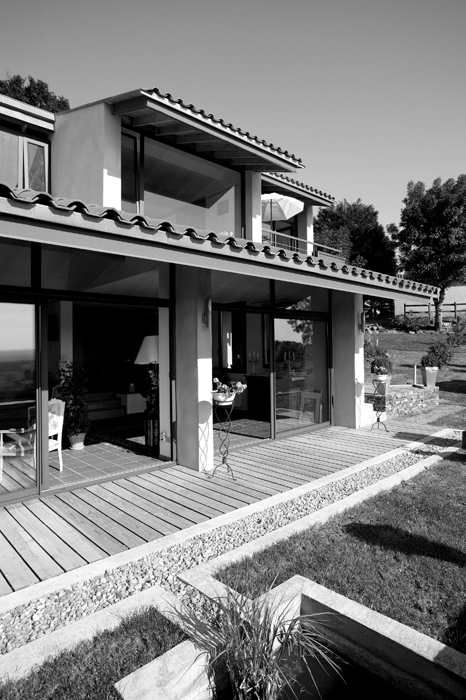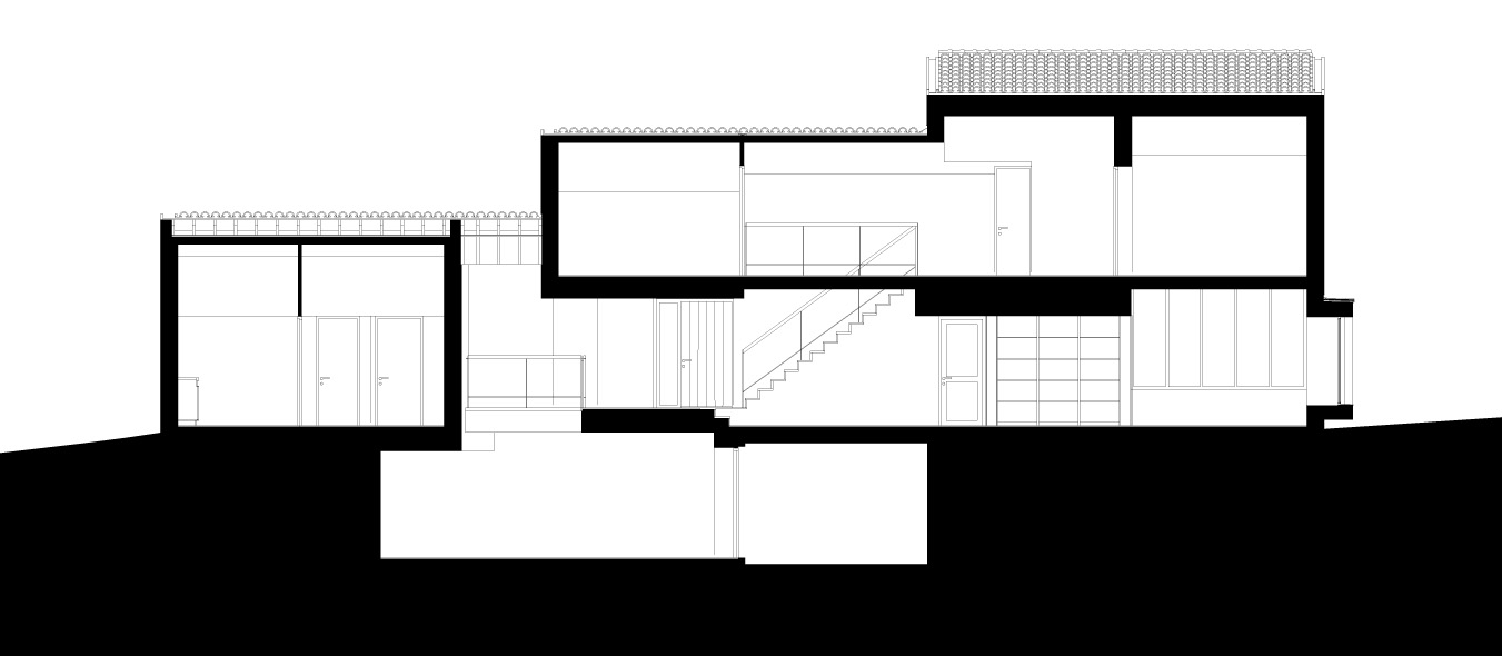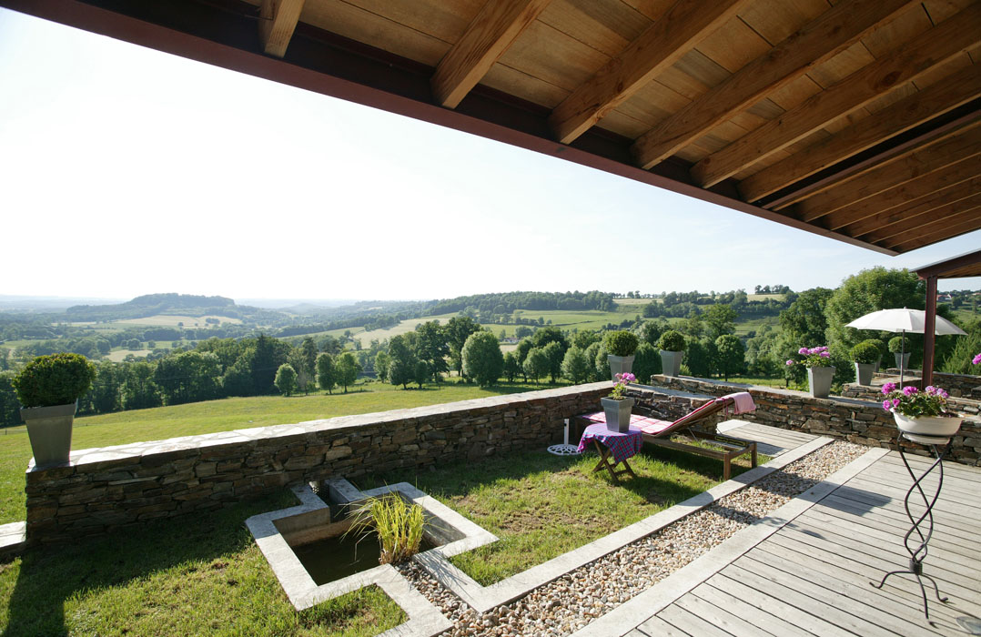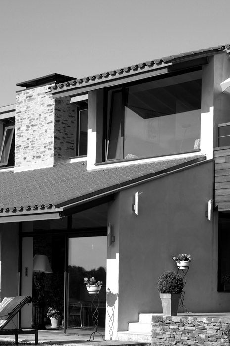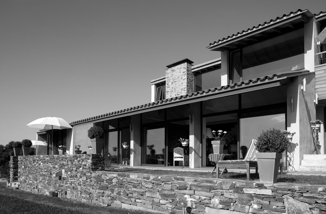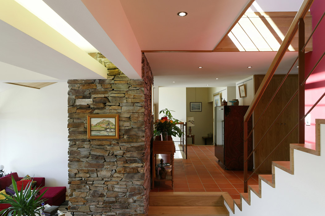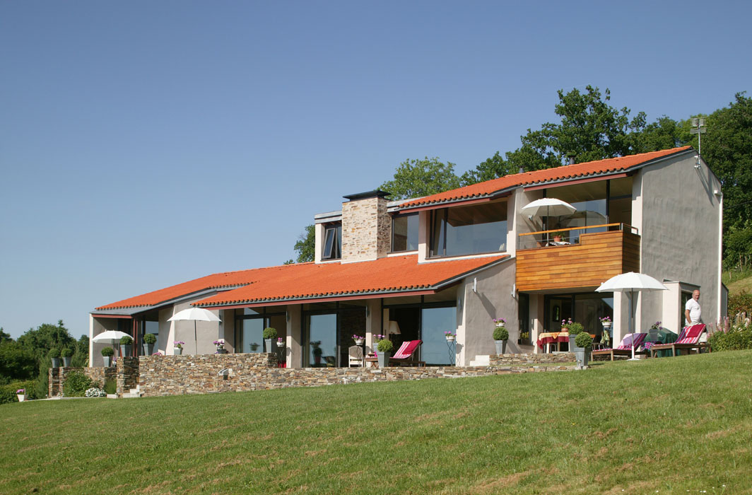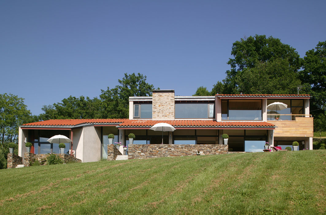 Cette maison d’habitation est conçue comme un belvédère multipliant les points de vue sur le vallon creusé par le ruisseau du Meyrou à Crandelles. Les qualités des points de vue sont différenciées suivant les espaces intérieurs : vue cadrée par un espace extérieur couvert depuis la salle à manger, vue limitée par un vaste débord de toit et par un premier plan formé par une terrasse prolongeant l’espace intérieur depuis le séjour, vue à ras-du-sol depuis un auditorium en demi sous-sol, vues diverses depuis les espaces du premier étage avec, pour certaines d’entres elles, les toitures du rez-de-chaussée en premier plan. Une attention toute particulière est apportée à la topographie du lieu : la maison d’habitation devient un assemblage de plates-formes s’adaptant parfaitement au terrain naturel, disposition coïncidant avec la demande spécifique du maître d’ouvrage de multiplier les différences de niveaux à l’intérieur de la construction. A l’extérieur, des murets en schiste prolongent les volumes construits tout en établissant une transition entre bâti et sol.