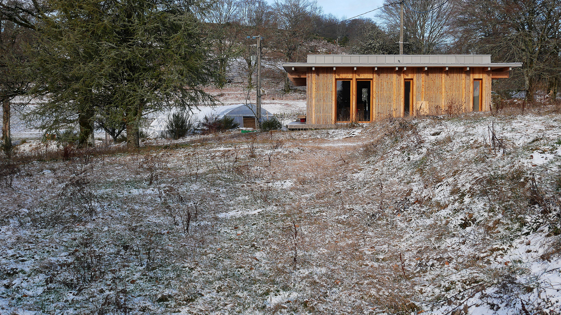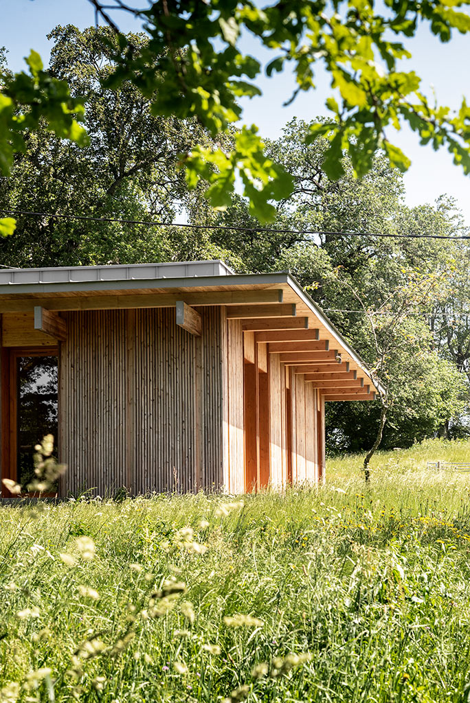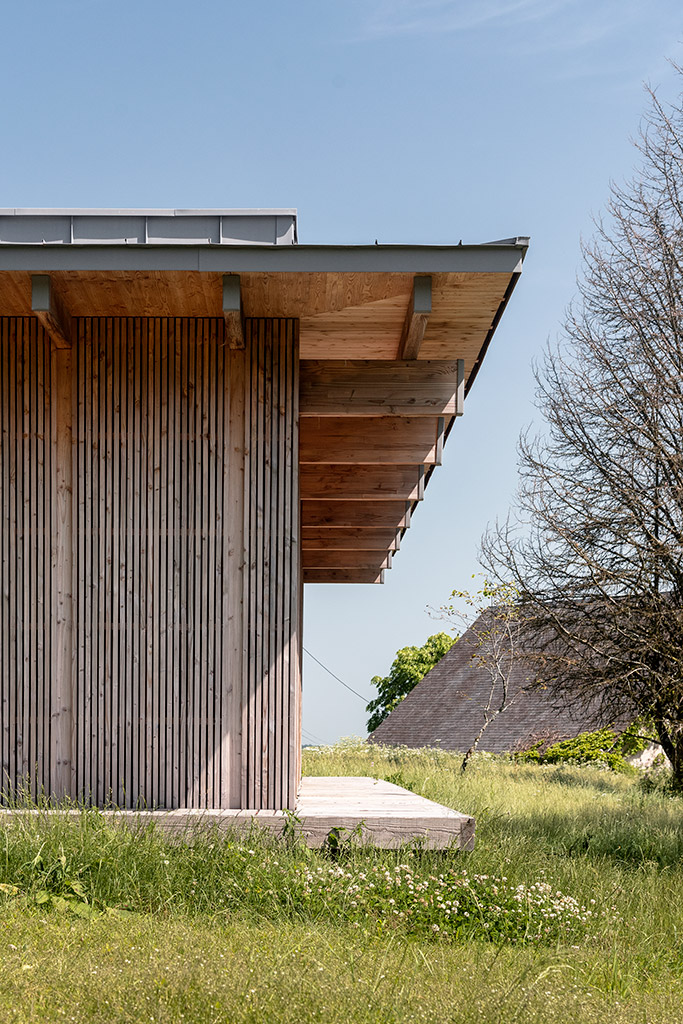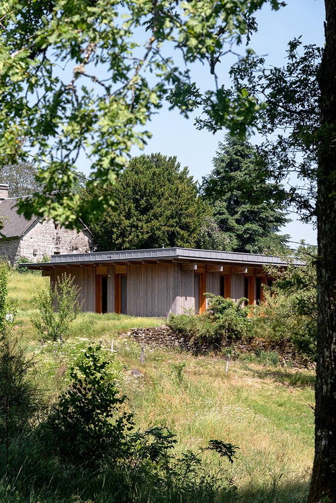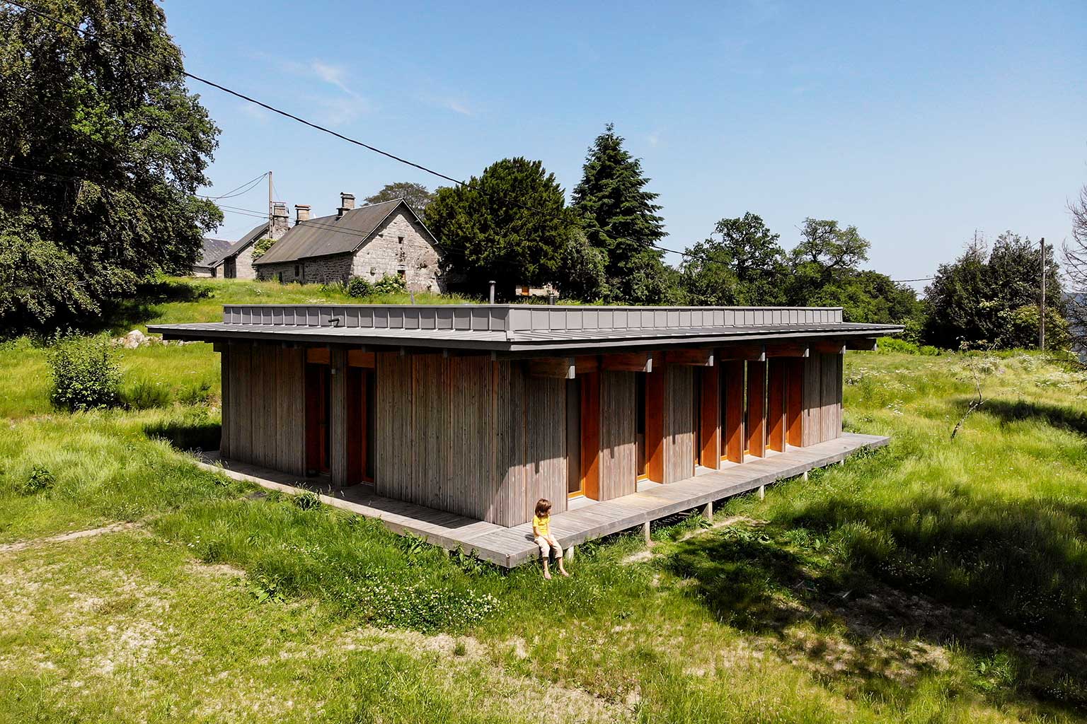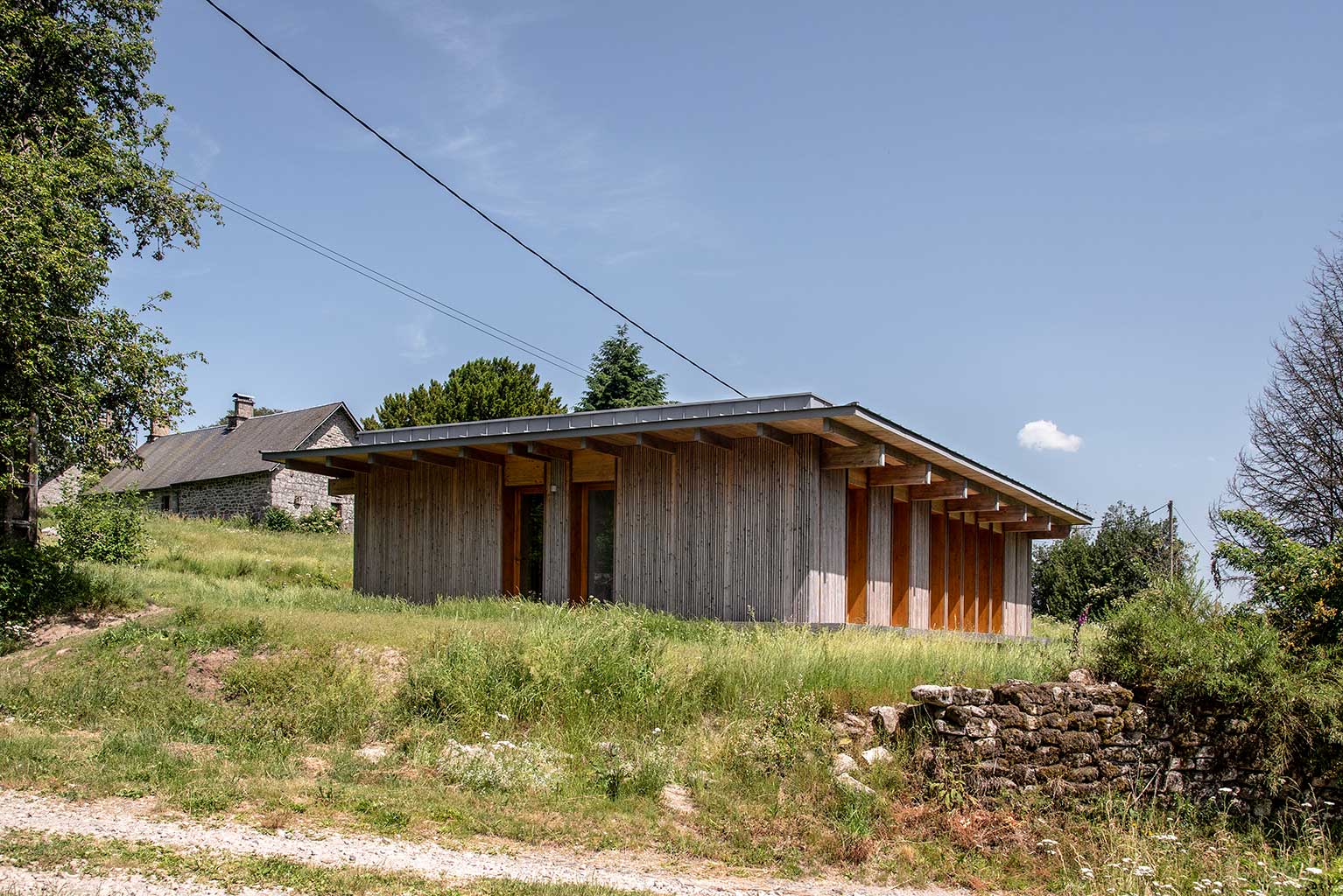L’architecture proposée fait une synthèse de cette triple demande. Elle apparait en contraste avec les édifices existants du hameau, massifs et ancrés dans le sol. La maison est en bois. Elle se déploie à l’horizontal selon un plan compact et se décolle du sol. Le toit est constitué d’un empilement de trois réseaux de poutraison croisés à angle droit, support d’une toiture terrasse végétalisée. Les débords de toit sont couverts en zinc et abrite un parcours surélevé entourant la maison. Les façades en douglas sont tramées selon le rythme de la charpente. Elles sont plus ou moins ouvertes en fonction des orientations et des apports solaires recherchés. L’entrée fait face au four, sur le pignon nord-ouest.