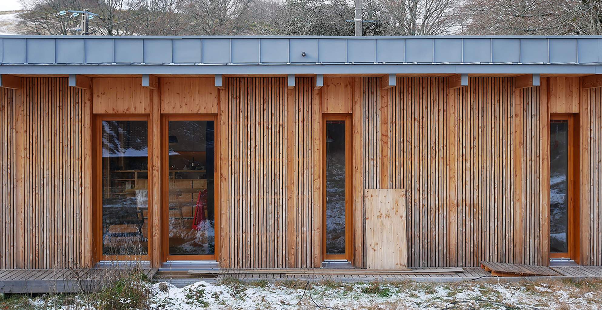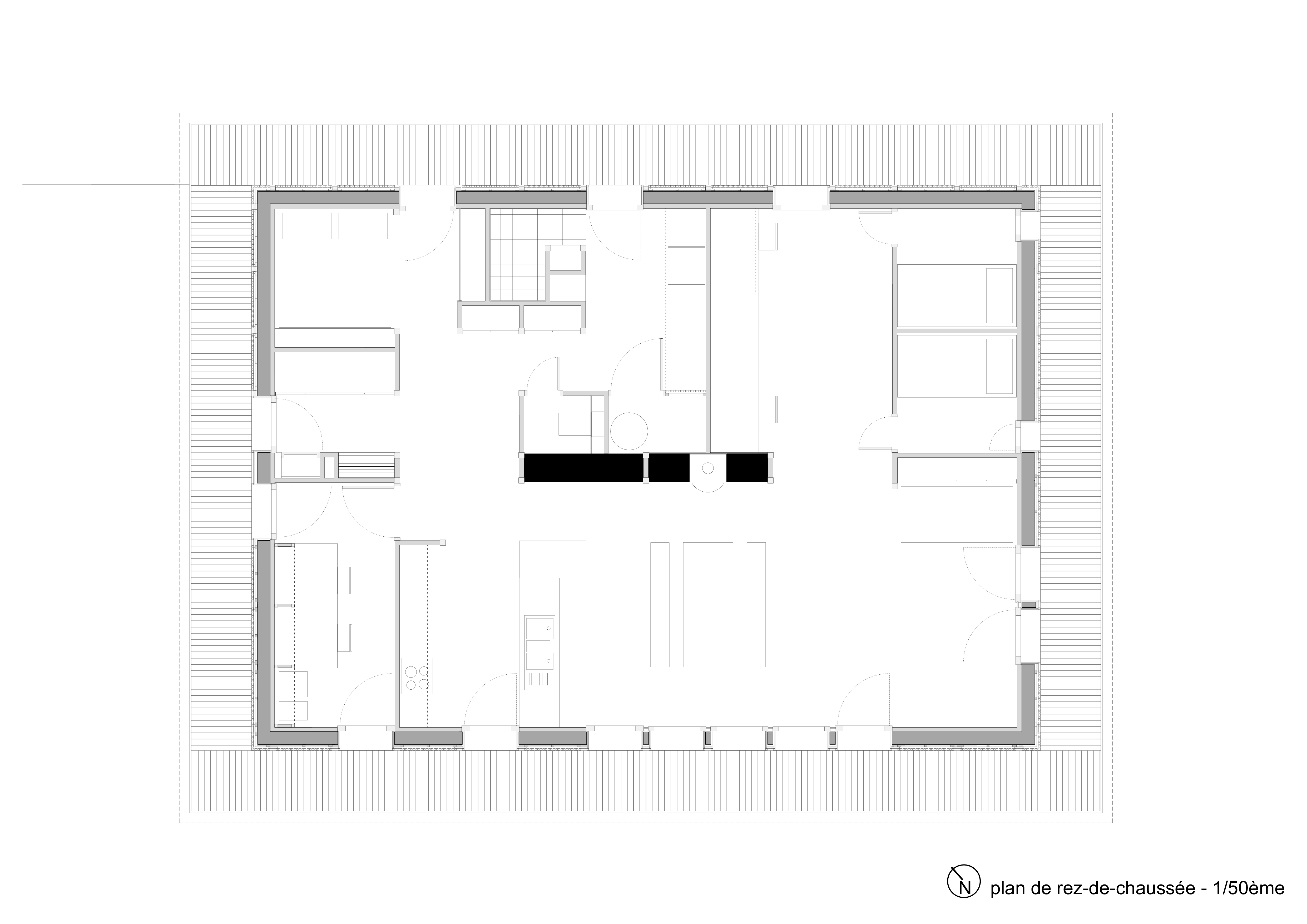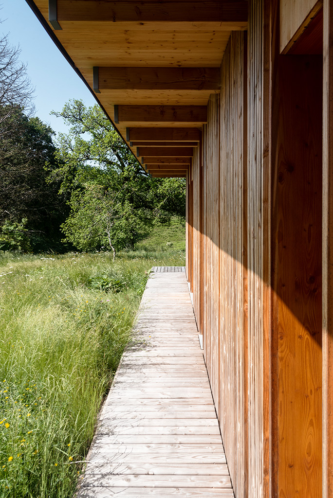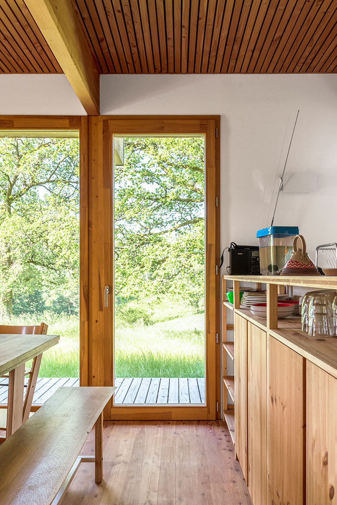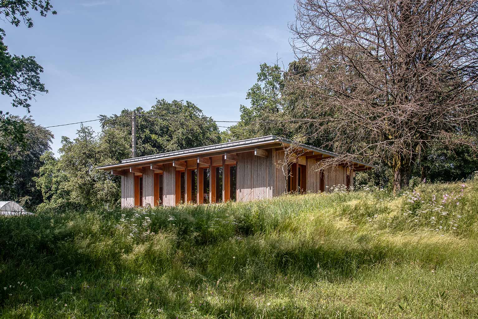L’architecture proposée fait une synthèse de cette triple demande. Elle apparait en contraste avec les édifices existants du hameau, massifs et ancrés dans le sol. La maison est en bois. Elle se déploie à l’horizontal selon un plan compact et se décolle du sol. Le toit est constitué d’un empilement de trois réseaux de poutraison croisés à angle droit, support d’une toiture terrasse végétalisée. Les débords de toit sont couverts en zinc et abrite un parcours surélevé entourant la maison. Les façades en douglas sont tramées selon le rythme de la charpente. Elles sont plus ou moins ouvertes en fonction des orientations et des apports solaires recherchés. L’entrée fait face au four, sur le pignon nord-ouest.