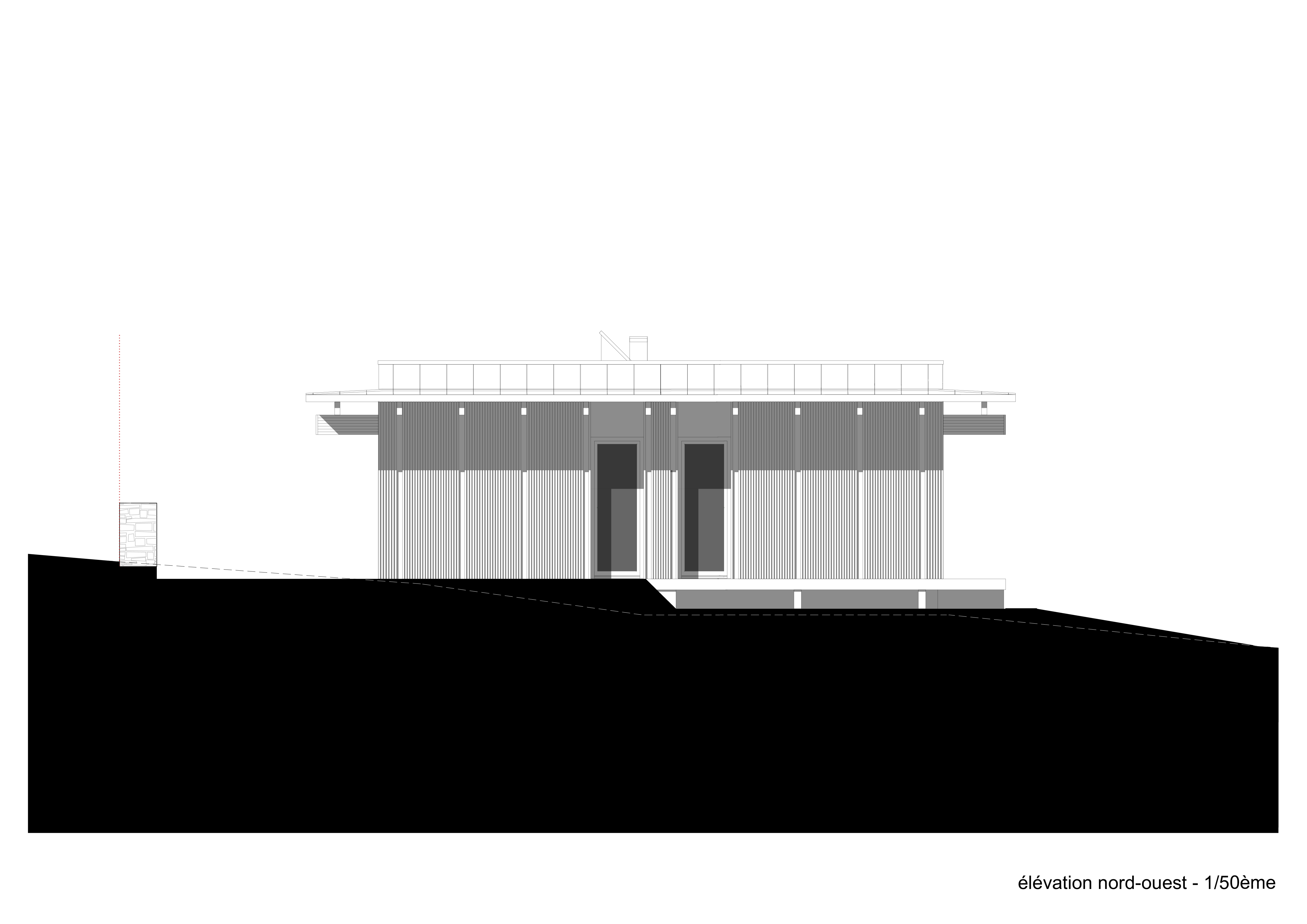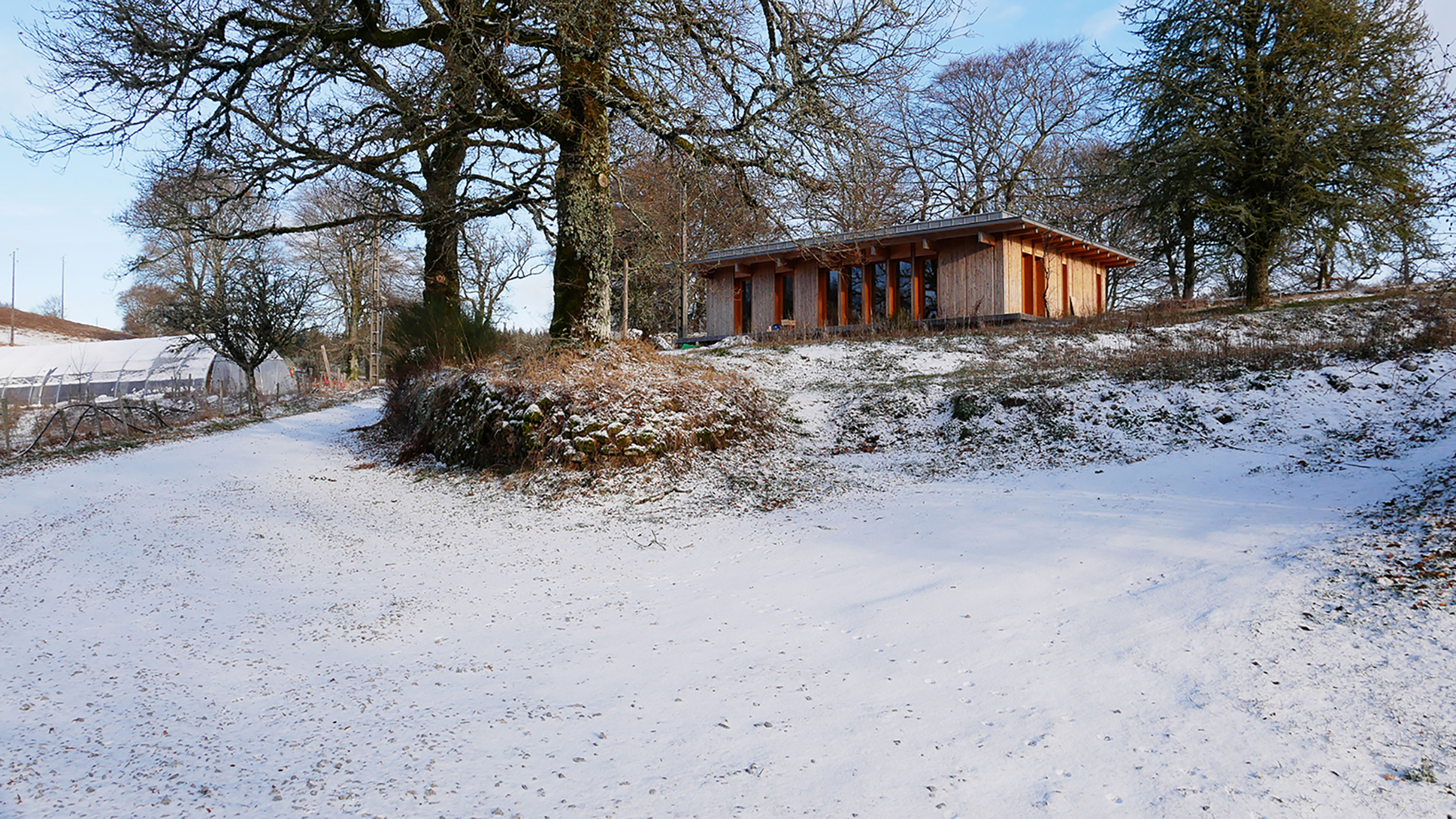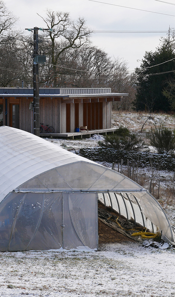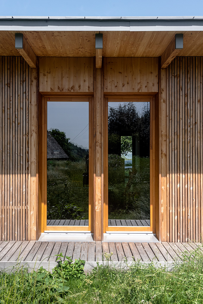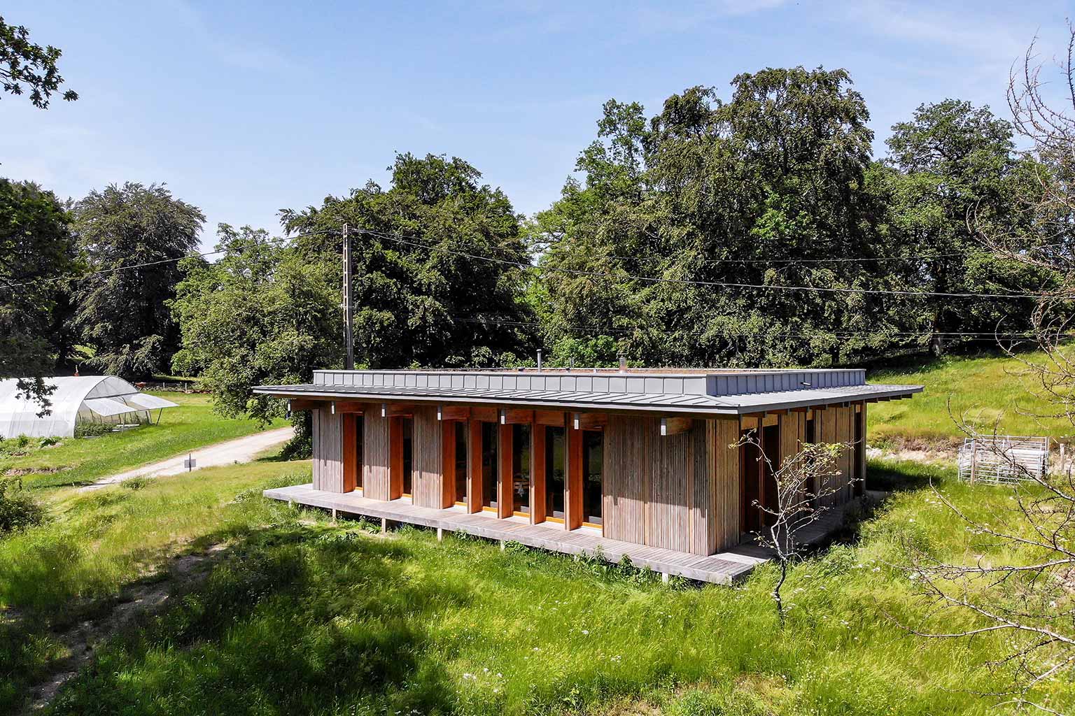 L’architecture proposée fait une synthèse de cette triple demande. Elle apparait en contraste avec les édifices existants du hameau, massifs et ancrés dans le sol. La maison est en bois. Elle se déploie à l’horizontal selon un plan compact et se décolle du sol. Le toit est constitué d’un empilement de trois réseaux de poutraison croisés à angle droit, support d’une toiture terrasse végétalisée. Les débords de toit sont couverts en zinc et abrite un parcours surélevé entourant la maison. Les façades en douglas sont tramées selon le rythme de la charpente. Elles sont plus ou moins ouvertes en fonction des orientations et des apports solaires recherchés. L’entrée fait face au four, sur le pignon nord-ouest.