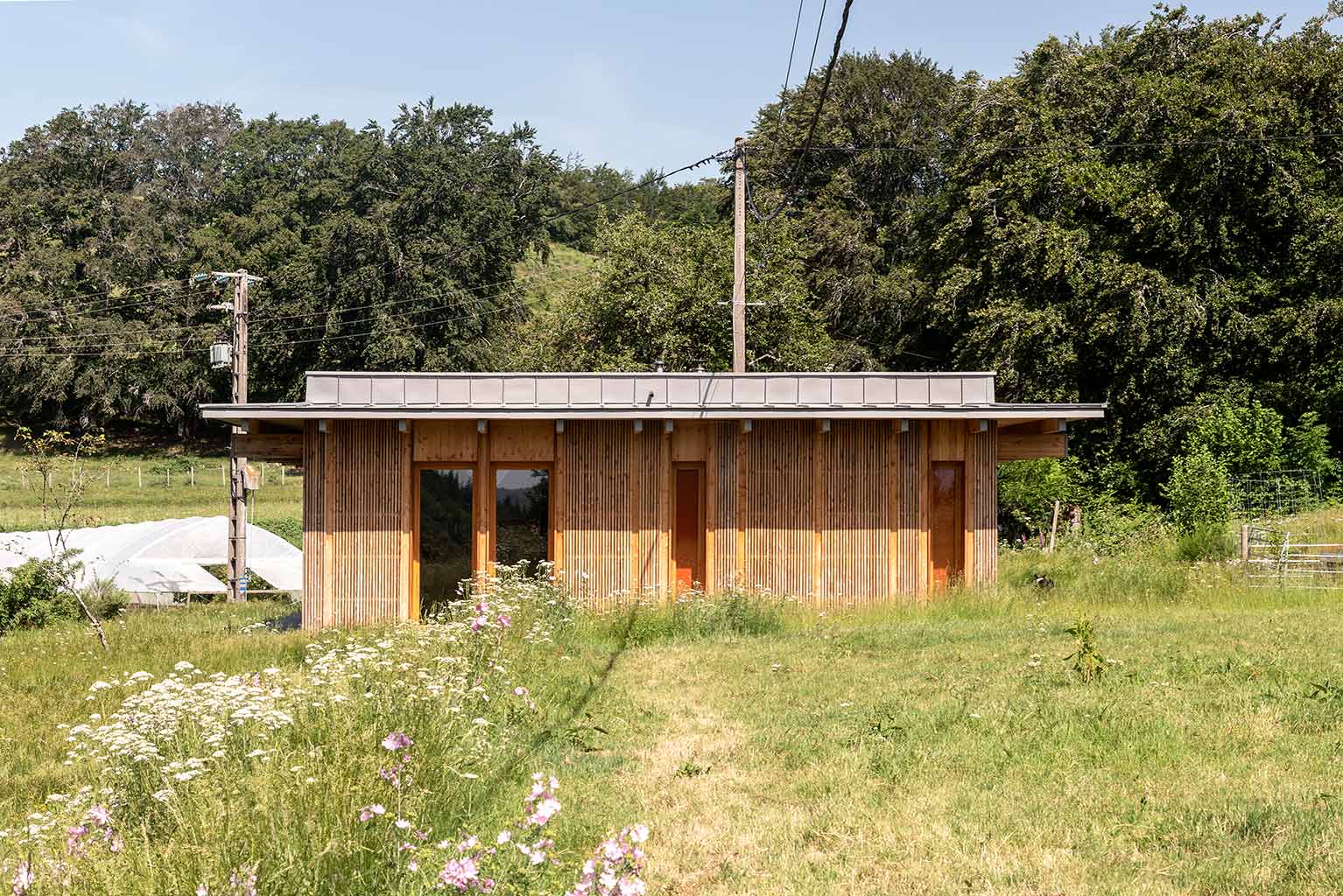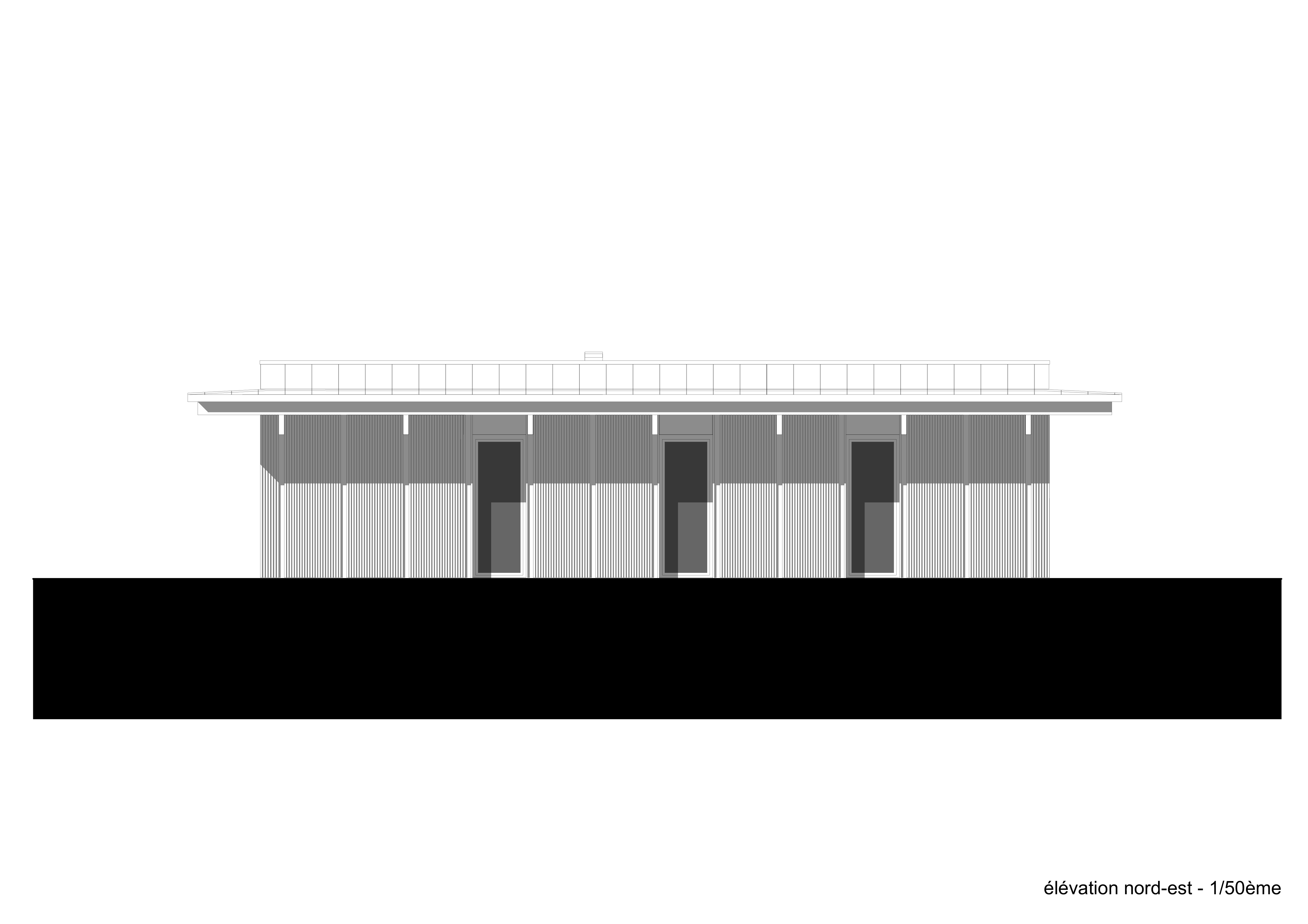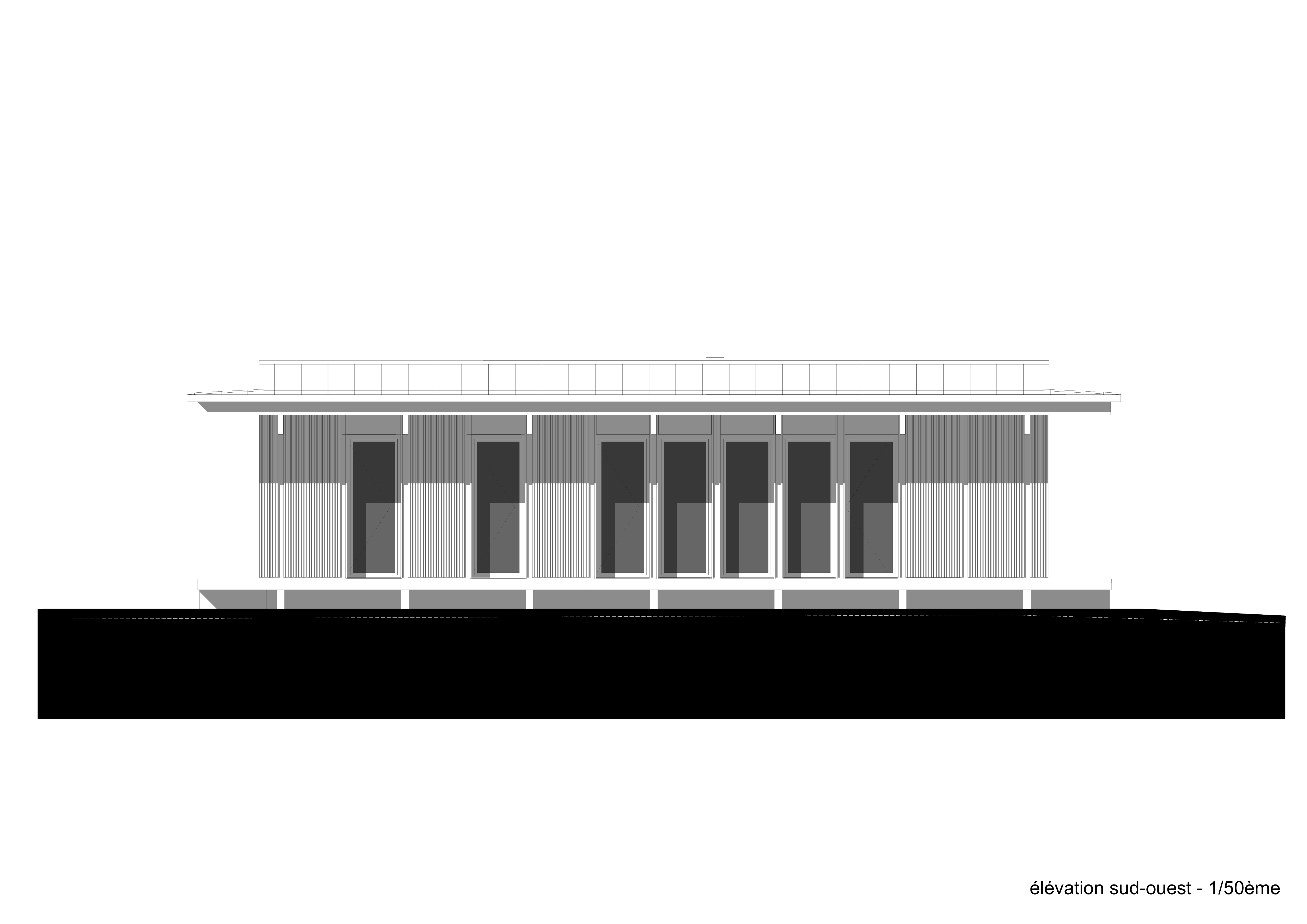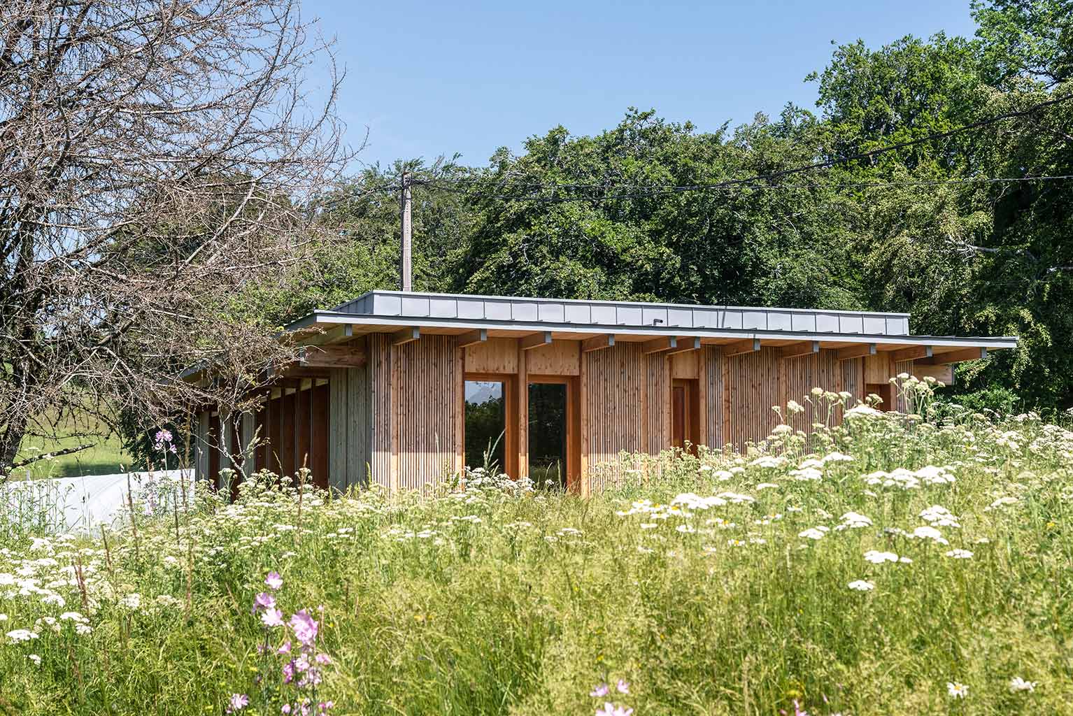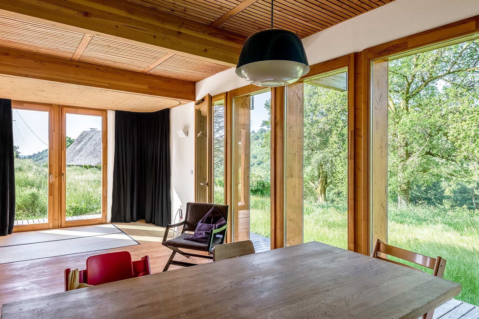 L’architecture proposée fait une synthèse de cette triple demande. Elle apparait en contraste avec les édifices existants du hameau, massifs et ancrés dans le sol. La maison est en bois. Elle se déploie à l’horizontal selon un plan compact et se décolle du sol. Le toit est constitué d’un empilement de trois réseaux de poutraison croisés à angle droit, support d’une toiture terrasse végétalisée. Les débords de toit sont couverts en zinc et abrite un parcours surélevé entourant la maison. Les façades en douglas sont tramées selon le rythme de la charpente. Elles sont plus ou moins ouvertes en fonction des orientations et des apports solaires recherchés. L’entrée fait face au four, sur le pignon nord-ouest.
