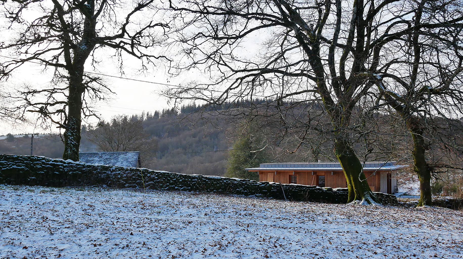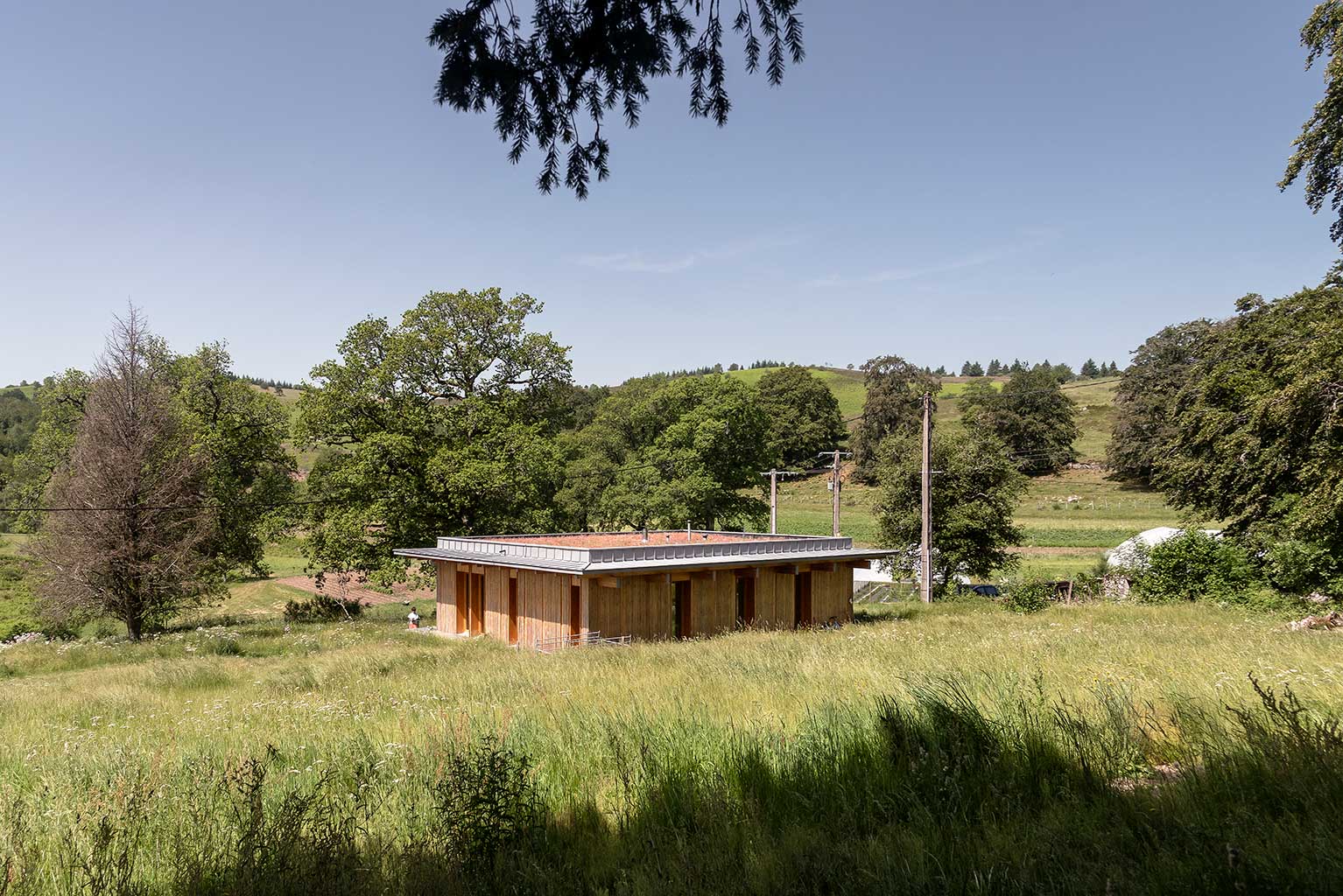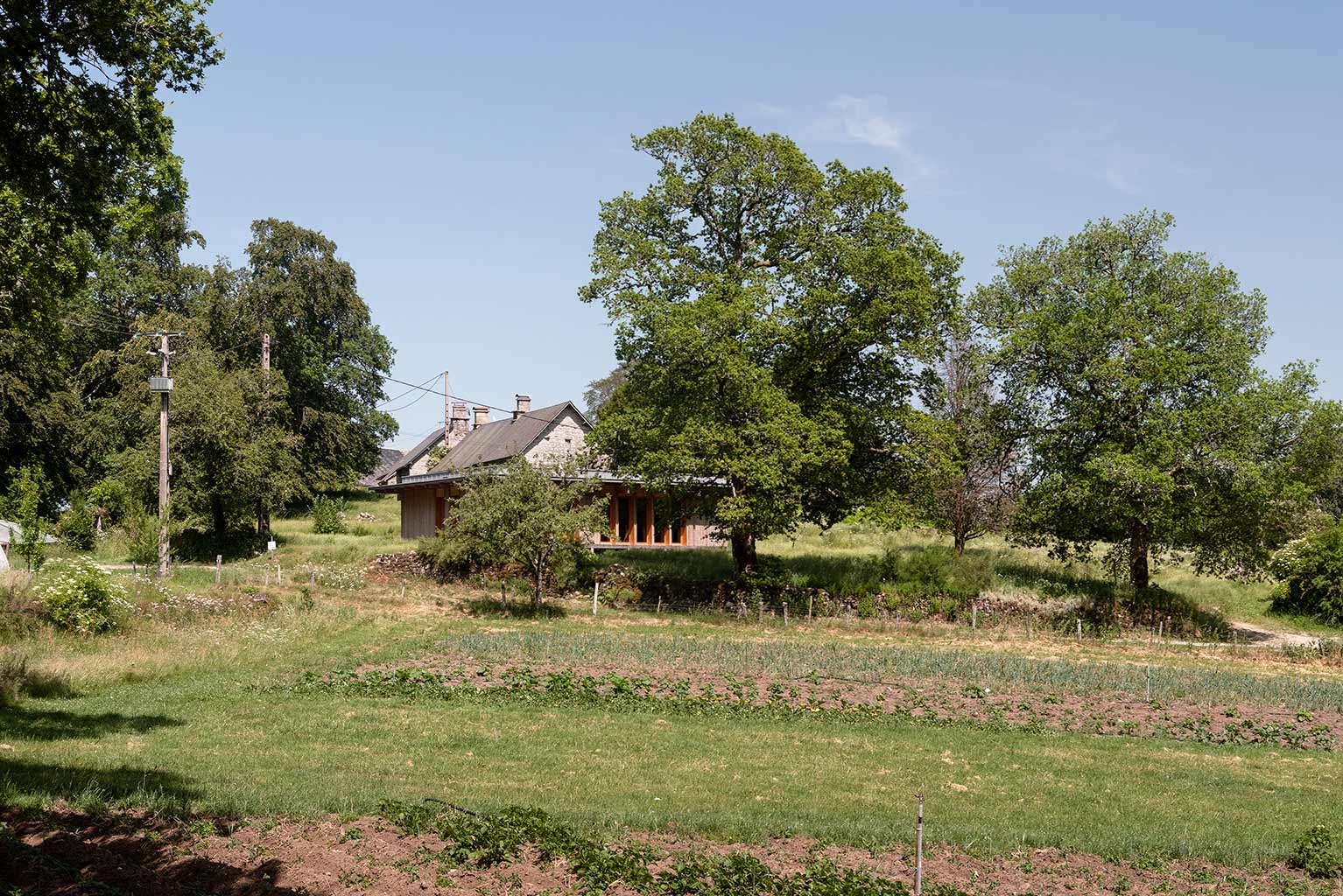 Seuls habitants de la Monedière à l’année, Stéphanie et Cédric en sont les gardiens. L’implantation de la nouvelle habitation tient compte de ce paramètre. Le site choisi est stratégique. Il permet d’embrasser le territoire sud de la ferme : les terres cultivées au premier plan, les pâturages occupant les coteaux et le sommet du Puy. Il permet aussi de garder un œil sur les allers et venues des visiteurs qui se rendent à la maison familiale en bas du hameau et à l’ancienne étable attenante, transformée en atelier de transformation de produits agricoles et en boutique ouverte au public.