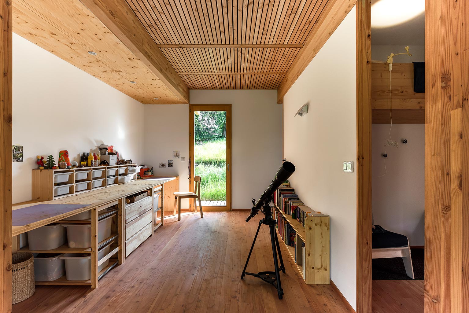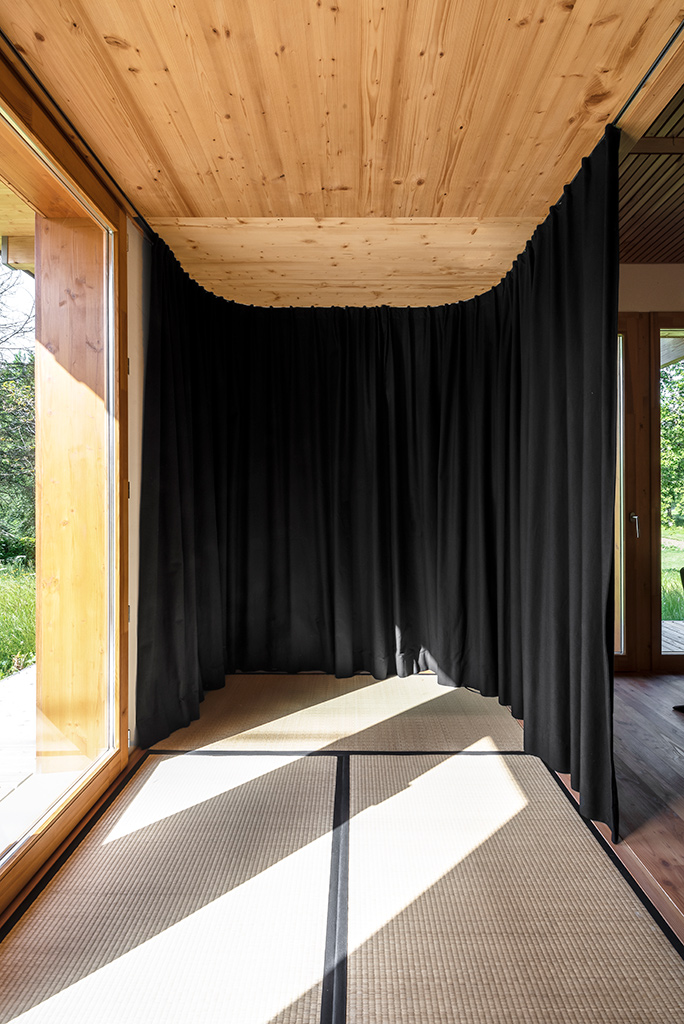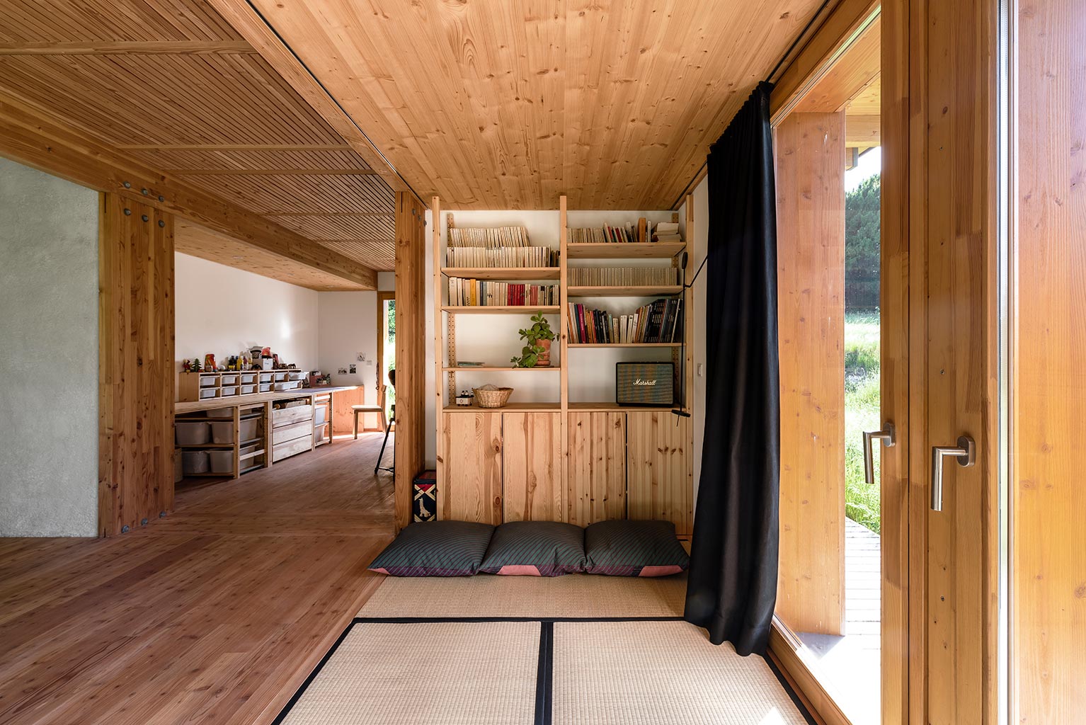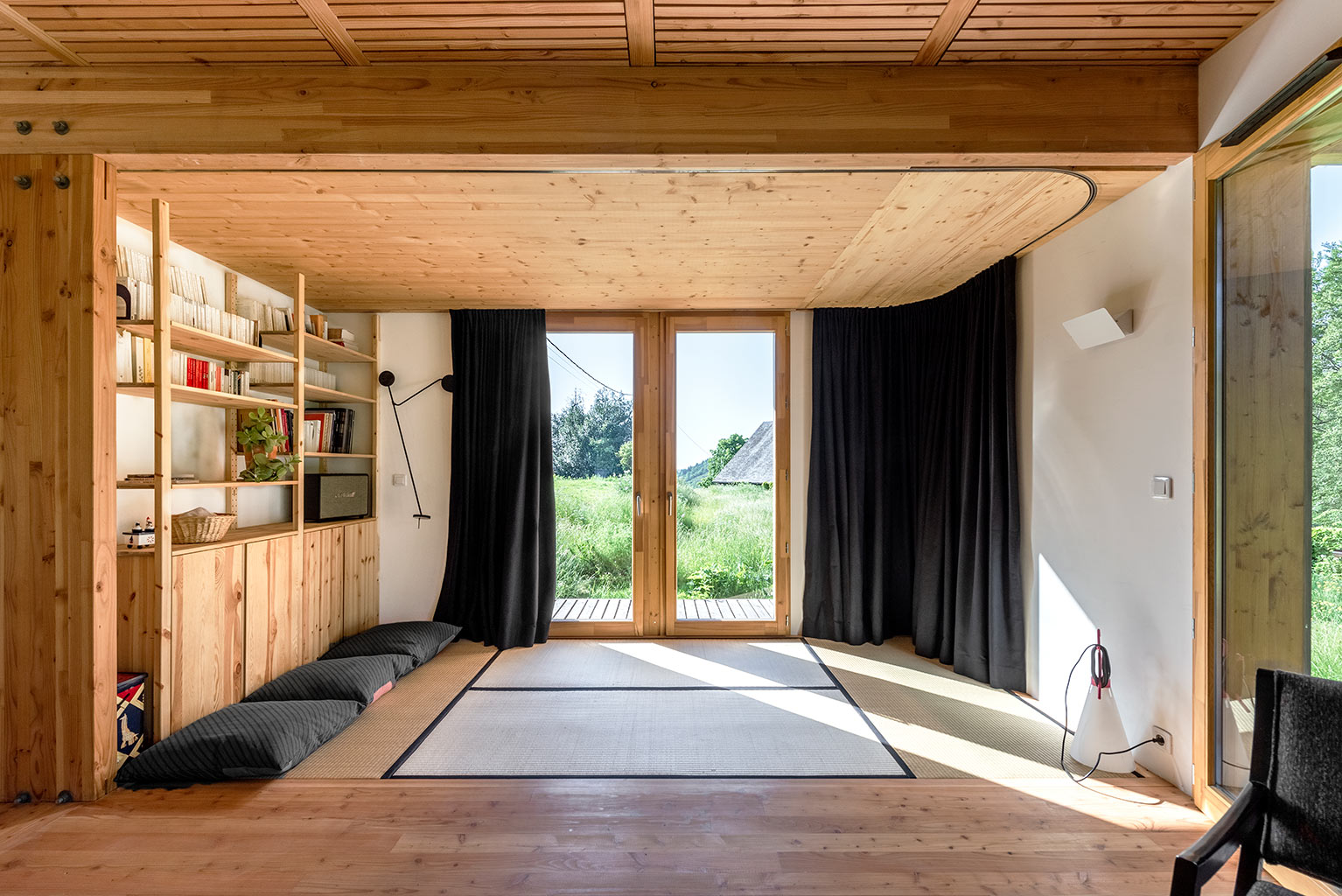 Un mur de refend, composé d’une ossature et d’un remplissage maçonné en terre, scinde la maison en deux parties. Un poêle à buches est adossé au mur. Réduits au minimum, les espaces de couchages, un espace partagé pour les enfants, la salle de bain et le sanitaire sont au nord. Le bureau, la cuisine et la pièce commune se retrouvent au sud. C’est dans cet espace que sont aussi disposés six tatamis pour le couchage des parents. La pièce commune s’ouvre largement sur l’extérieur par les façades sud-est et sud-ouest. Cette double orientation multiplie les perceptions depuis les espaces habités vers les terres de l’exploitation.