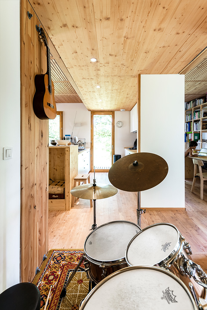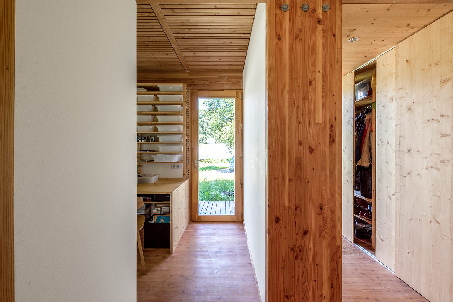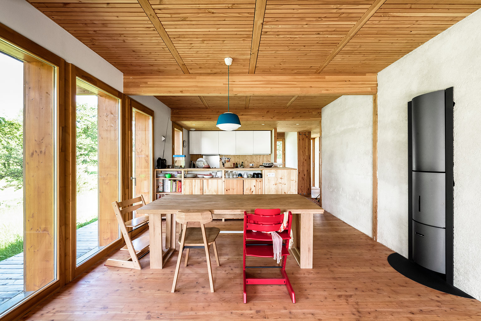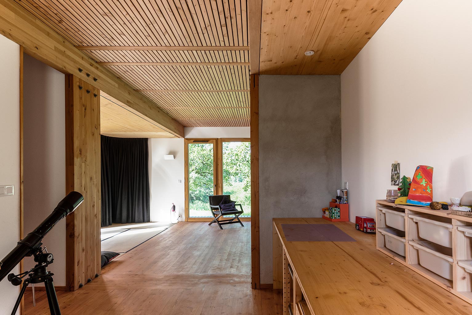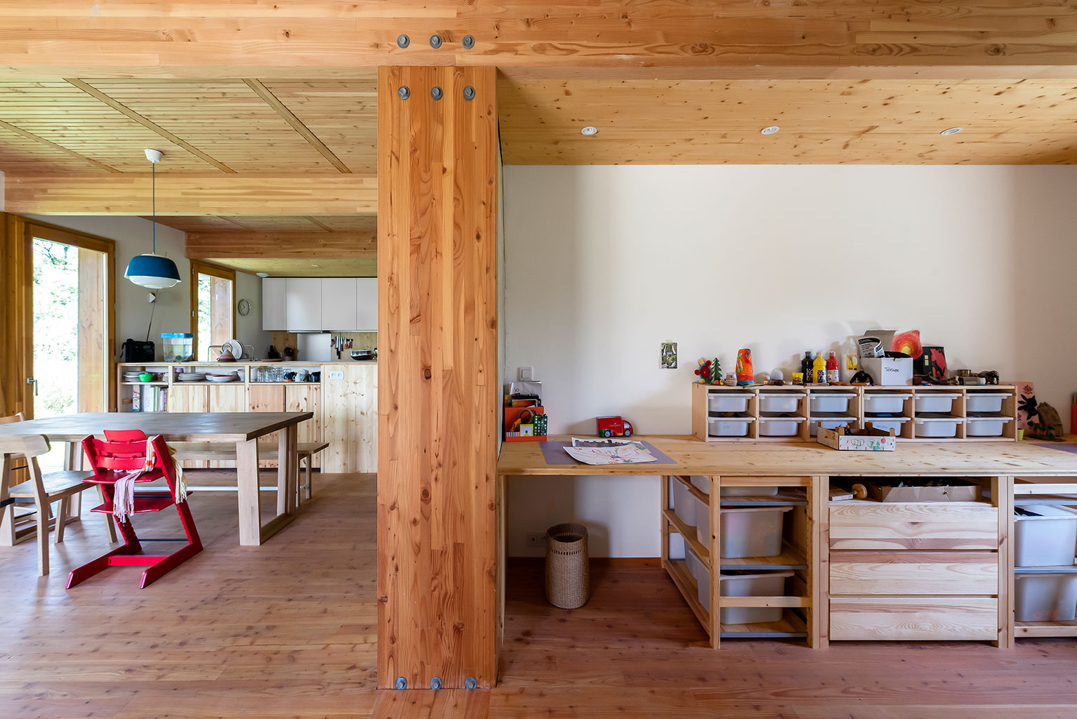 Un mur de refend, composé d’une ossature et d’un remplissage maçonné en terre, scinde la maison en deux parties. Un poêle à buches est adossé au mur. Réduits au minimum, les espaces de couchages, un espace partagé pour les enfants, la salle de bain et le sanitaire sont au nord. Le bureau, la cuisine et la pièce commune se retrouvent au sud. C’est dans cet espace que sont aussi disposés six tatamis pour le couchage des parents. La pièce commune s’ouvre largement sur l’extérieur par les façades sud-est et sud-ouest. Cette double orientation multiplie les perceptions depuis les espaces habités vers les terres de l’exploitation.