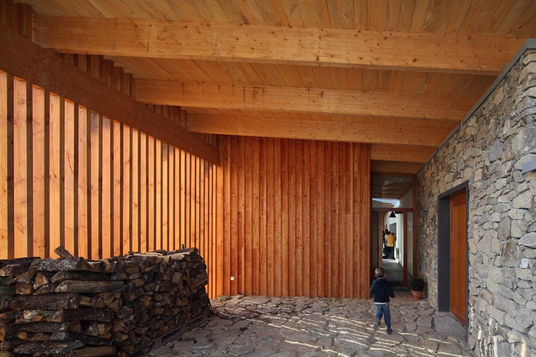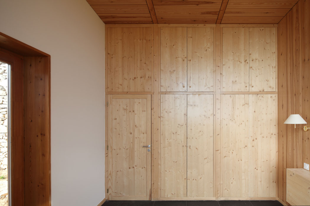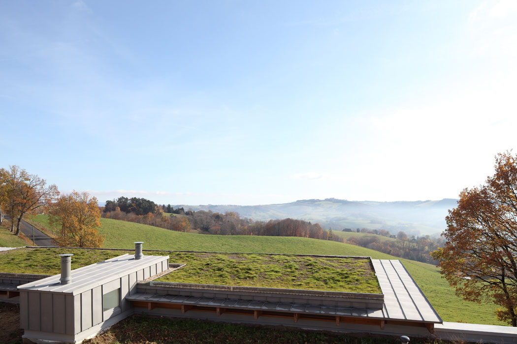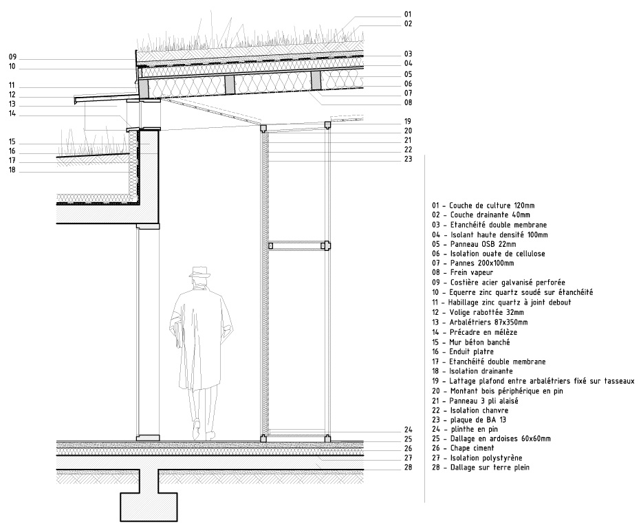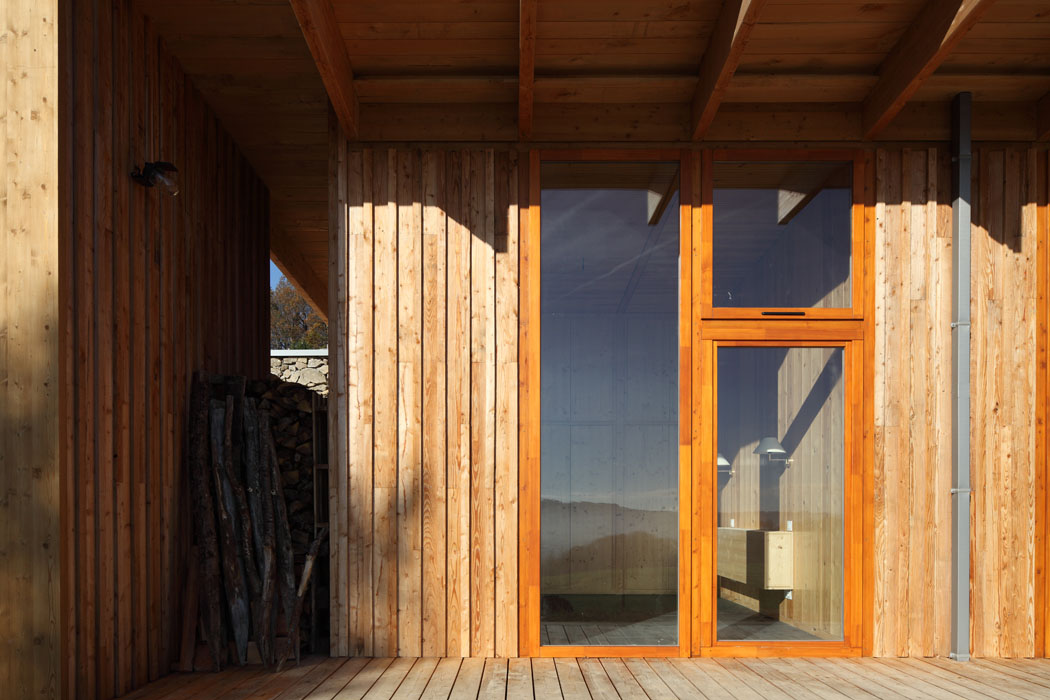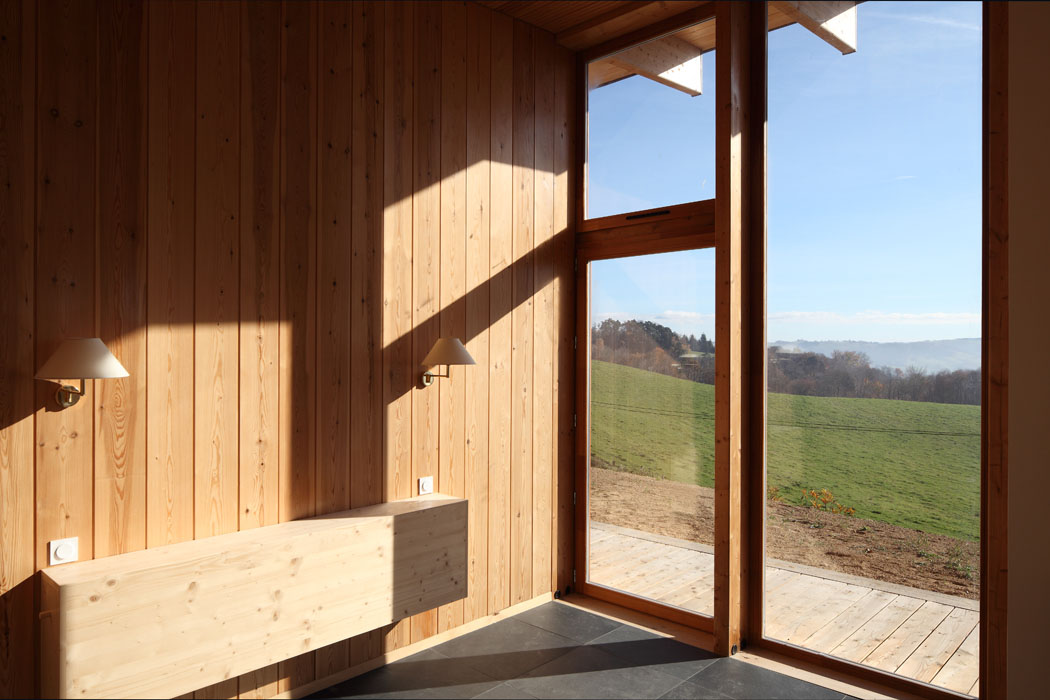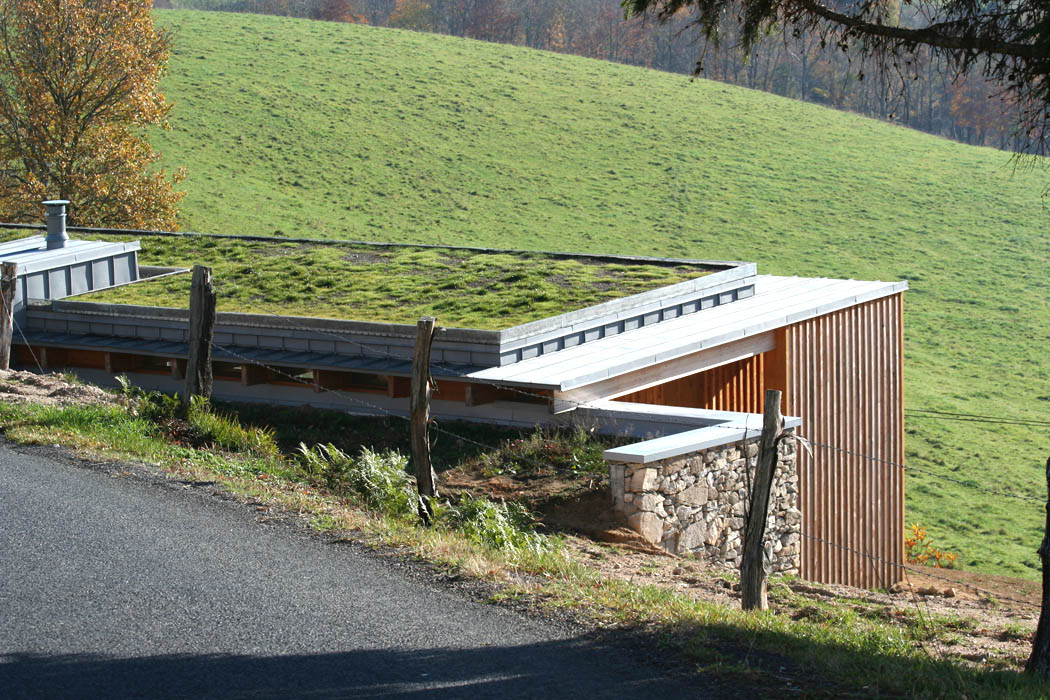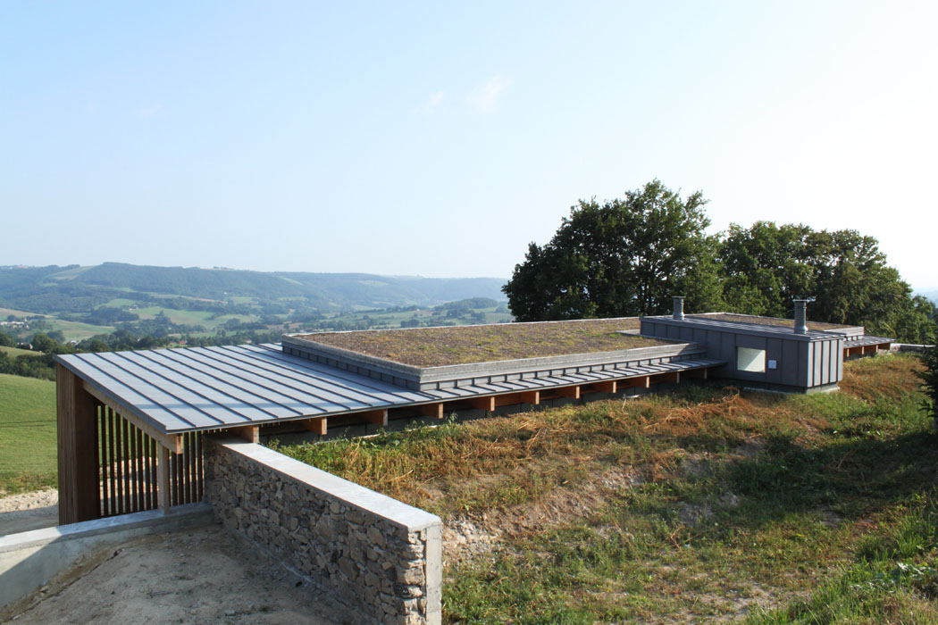 Réinterprétant certains éléments de l’architecture vernaculaire de la châtaigneraie cantalienne, la maison tend à s’inscrire de manière responsable et durable dans son environnement. Ainsi, le volume en béton inséré dans le sol bénéficie d’un parement extérieur en granit de pays sur lequel s’appuie une charpente en douglas. Le bardage à couvre joint en mélèze est une technique couramment employée dans la région. La toiture végétalisée tend également à favoriser l’insertion de l’habitation dans le paysage. Plantée de graminées, elle fait ainsi corps avec la prairie qui entoure l’habitation.