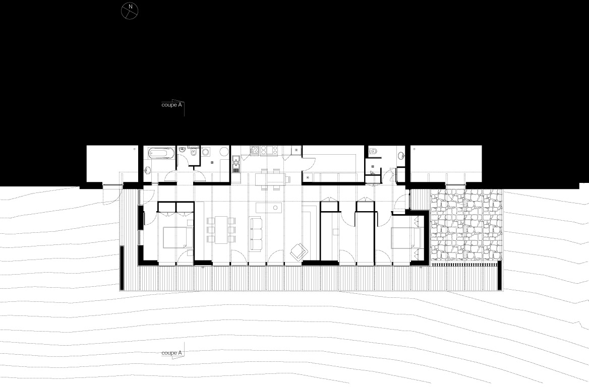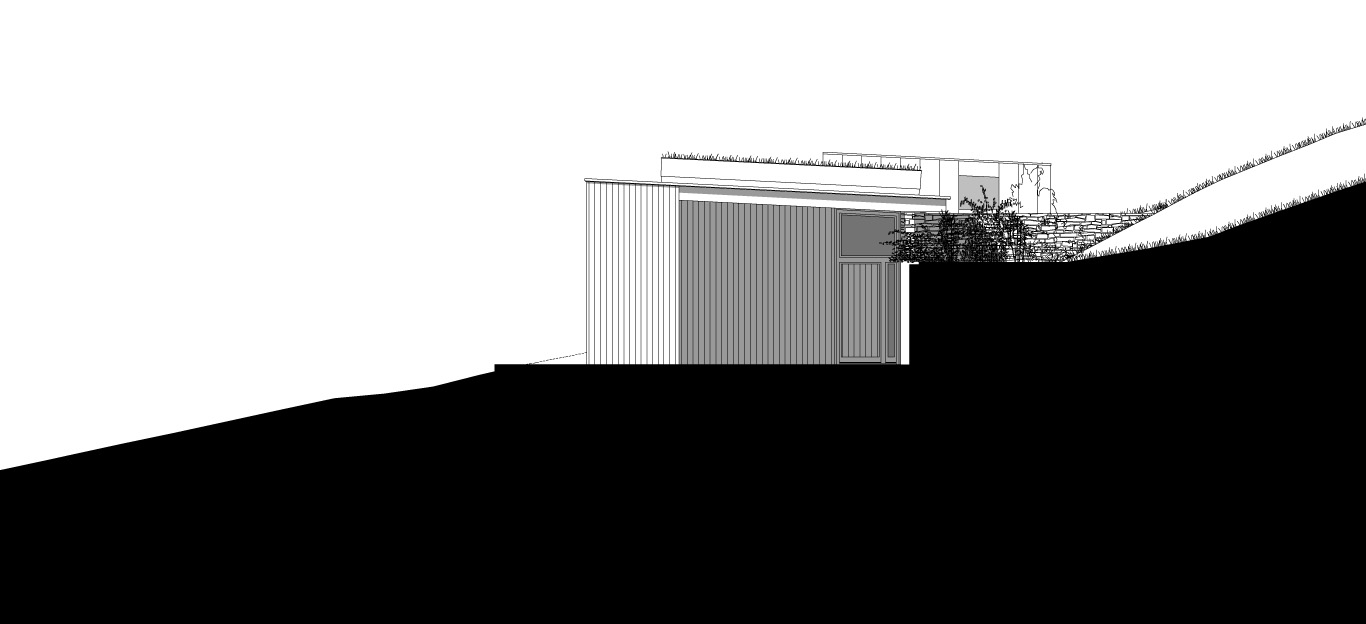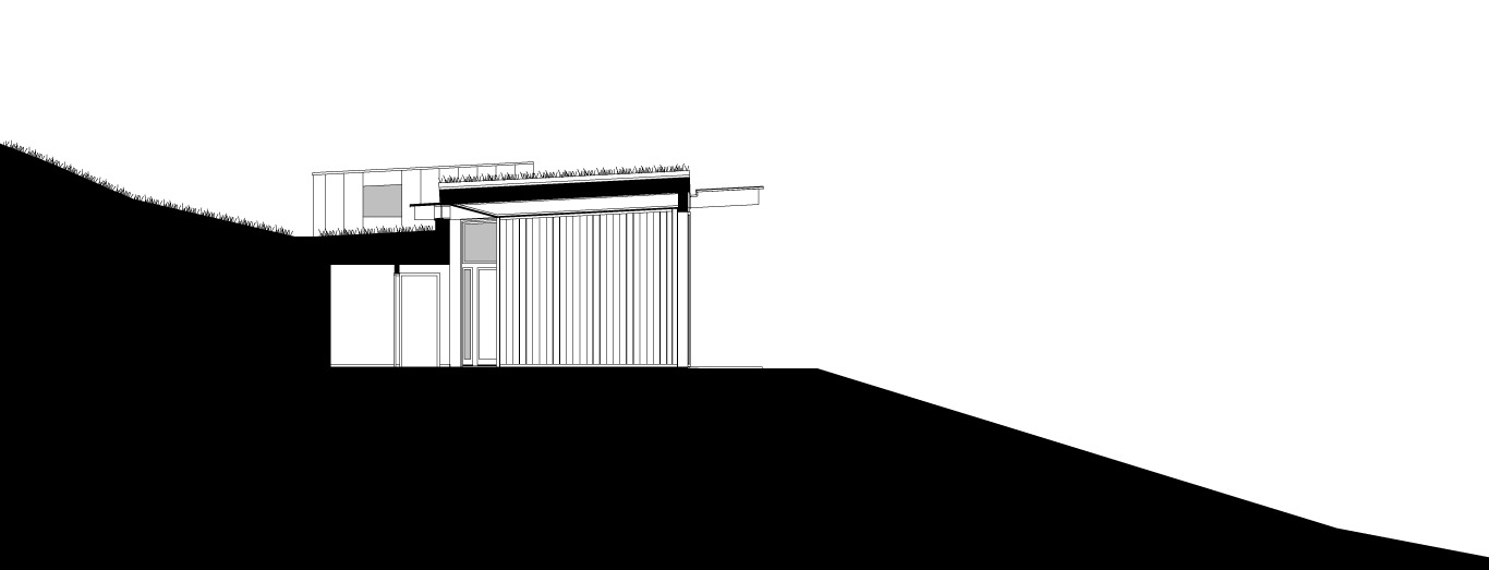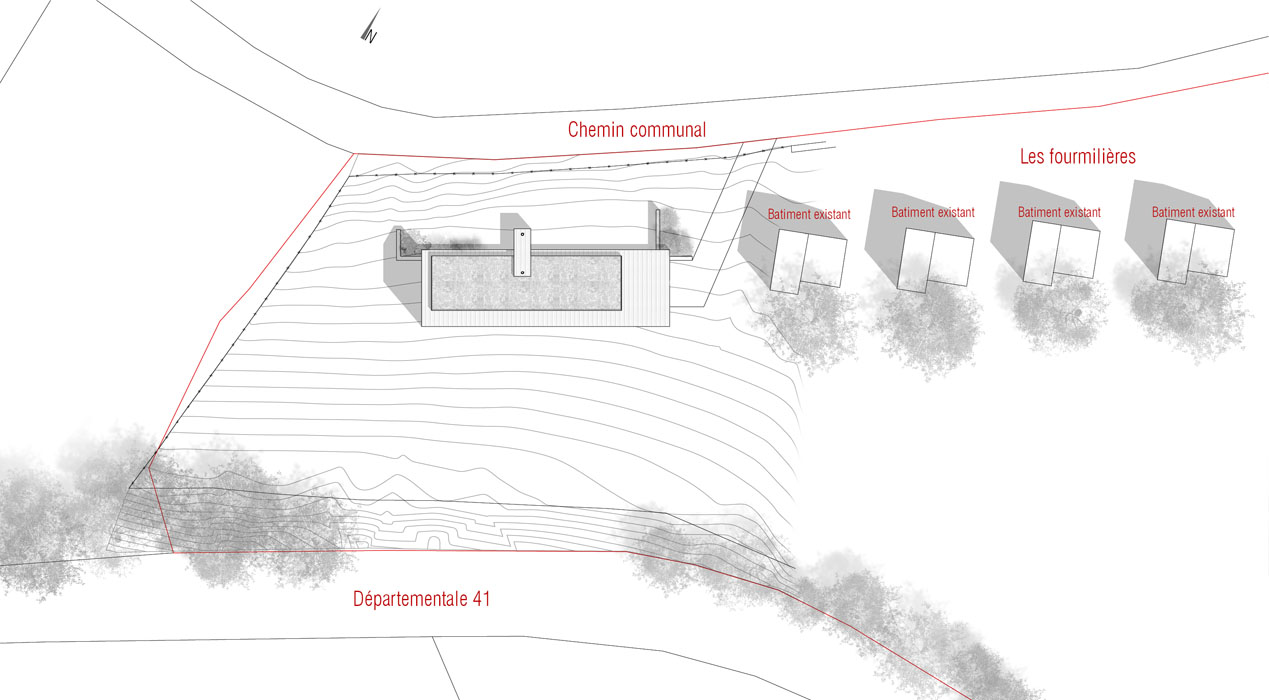 L’habitation se love dans la pente. Partiellement enterrée au nord, la maison s’ouvre, au sud vers la vallée du Veinazes au travers d’une façade largement vitrée.