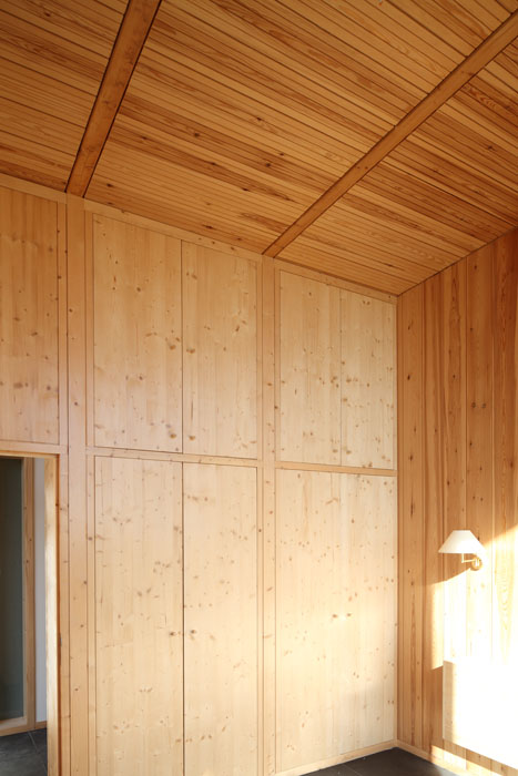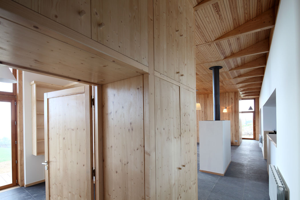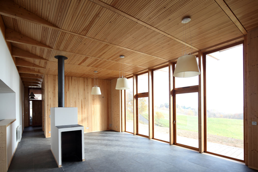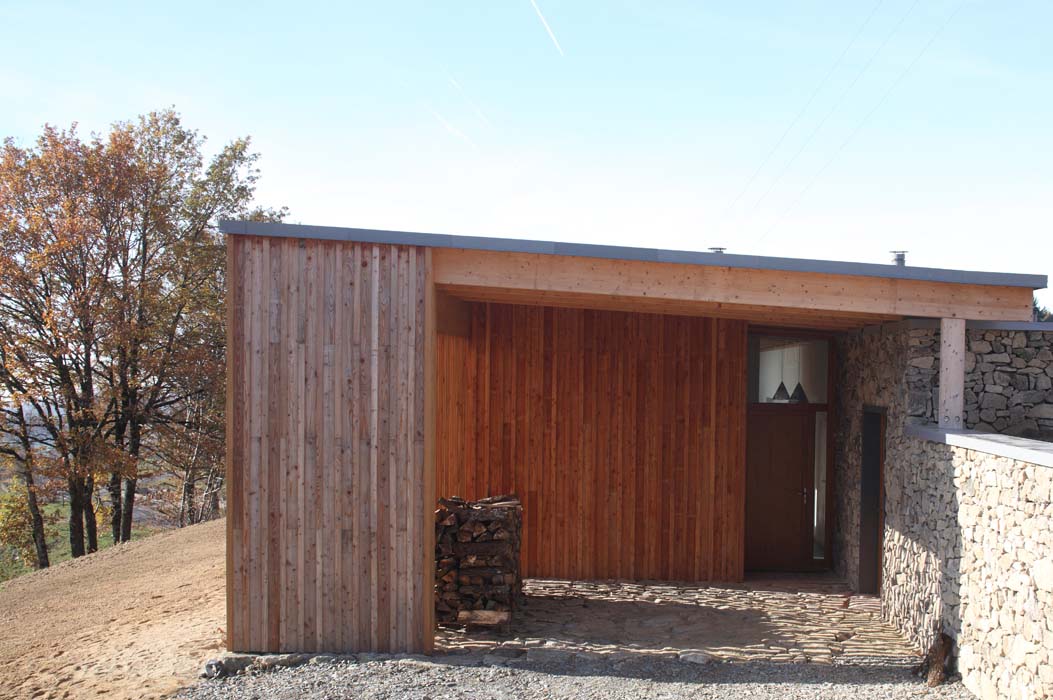 De la pierre au bois, de l’ombre à la lumière, la conception de l’habitation s’inscrit également dans une démarche architecturale bioclimatique. L’orientation nord/sud de la construction permet de bénéficier des apports énergétiques solaires passifs. Le volume maçonné qui abrite les espaces dits « tampons » comme les salles d’eaux, la buanderie et la cuisine apporte de l’inertie au bâtiment et favorise le confort thermique au fil des saisons. En hiver, ce dernier accumule durant le jour l’énergie du rayonnement solaire avant de la restituer la nuit. En été, associé à un dispositif de ventilation naturelle, il permet de rafraichir l’habitation et participe ainsi au confort thermique estival. Les pièces de vie (séjour, chambres, bureau) sont implantées dans le volume en bois. Elles se prolongent à l’extérieur par une terrasse en bois abritée d’un large débord de toit qui sert de masque solaire durant la saison d’été. A l’intersection des deux volumes, un espace de circulation longitudinal distribue les différents espaces de l’habitation. Il est éclairé par un bandeau lumineux qui capte sous la toiture, la lumière diffuse du nord. La toiture végétale apporte également de l’inertie à l’habitation et participe au confort climatique. Elle permet aussi une gestion responsable des eaux de pluie. Les débords de toit sont réalisés en zinc prépatiné Quartz Zinc. L’isolation est réalisée en ouate de cellulose et en chanvre. Elle tend à optimiser les performances énergétiques et le bilan environnemental du projet. L’habillage intérieur du plafond et des cloisonnements est réalisé en bois. Le choix du douglas pour la structure et du mélèze pour l’extérieur privilégie les gisements de ressources locales et permet ainsi de soutenir la filière de transformation à l’échelle du Massif Central. Les entreprises actrices de la construction sont elles aussi locales.