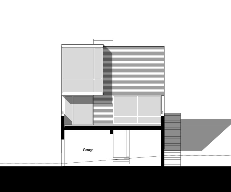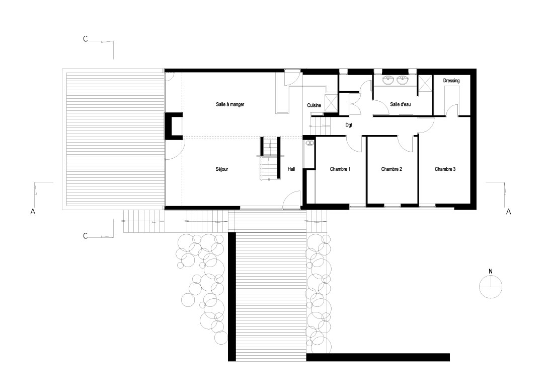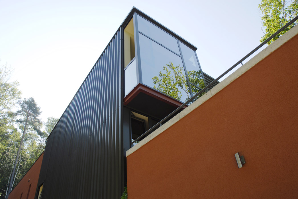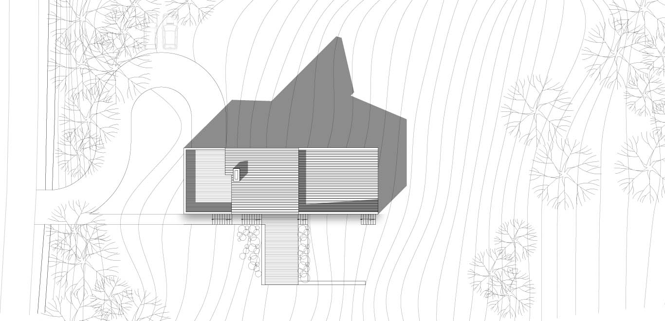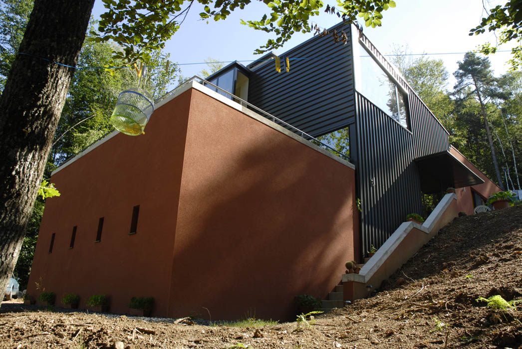 Le projet a pour objet la création d’une maison implantée en lisière de bourg à proximité de parcelles fortement boisées. La maison s’adapte à la déclivité du terrain : un jeu de différences de niveaux permet à tous les étages de l’habitation une sortie de plein pied dans le jardin. Une large terrasse en mélèze surplombant le bourg prolonge le séjour et la salle à manger à la manière d’un belvédère. Le volume volontairement contemporain et le toit sont recouverts d’un bardage acier gris anthracite pour les espaces de vie, alors que l’espace des chambres ainsi que le volume du garage seront en maçonnerie enduite de couleur rouge.