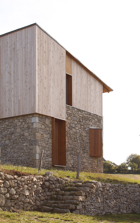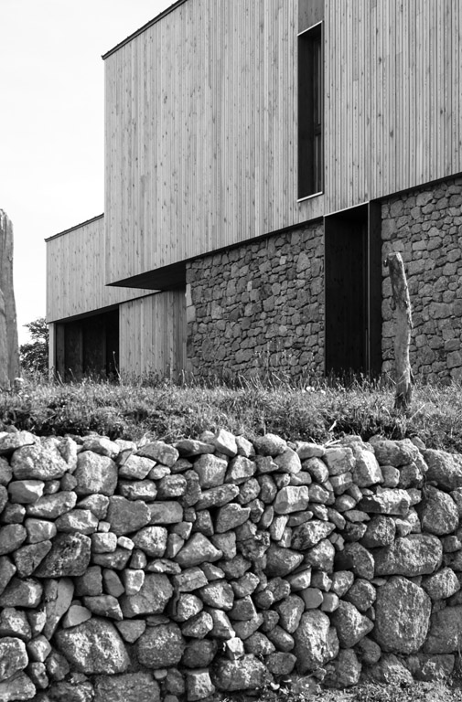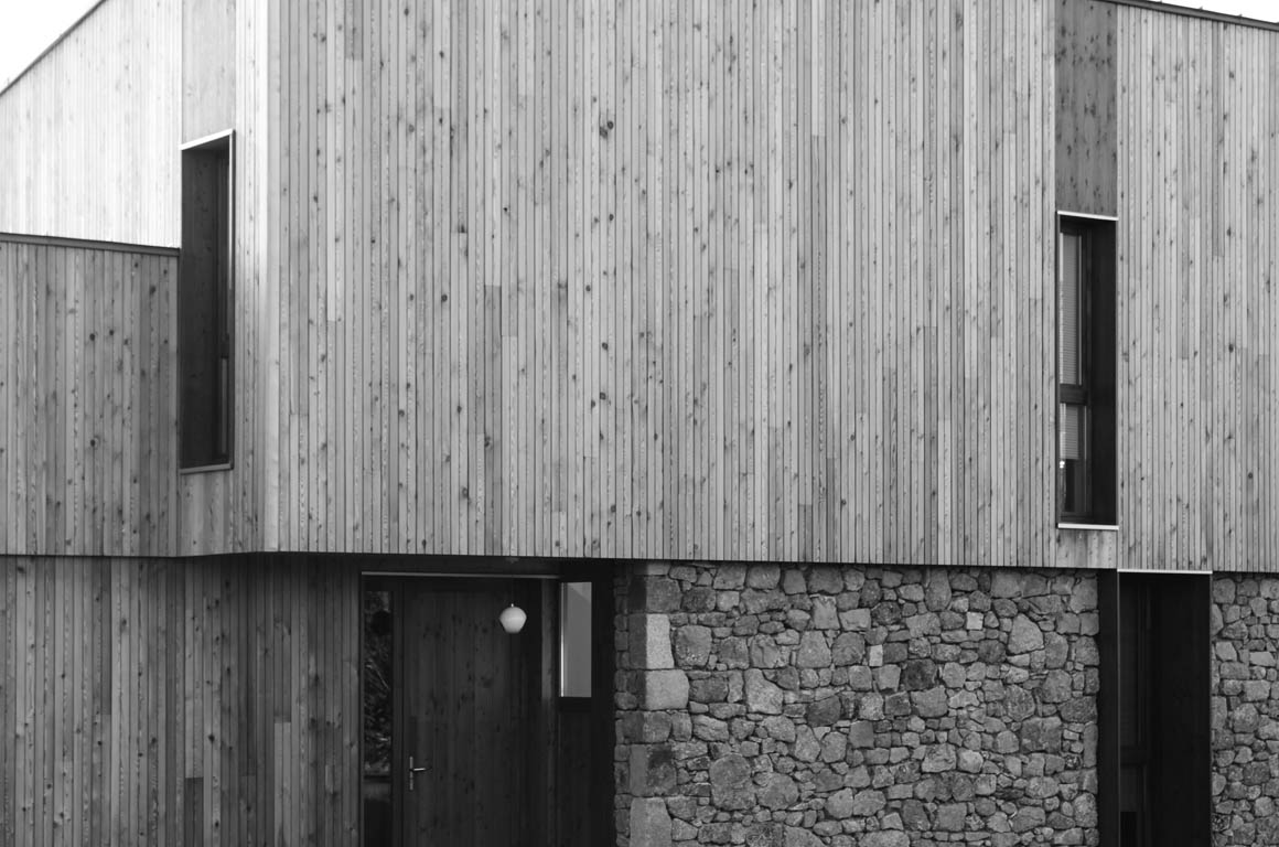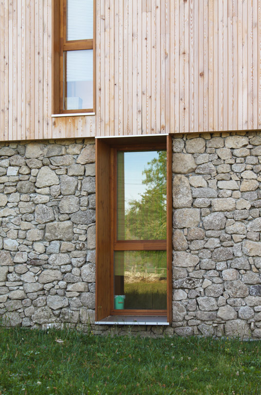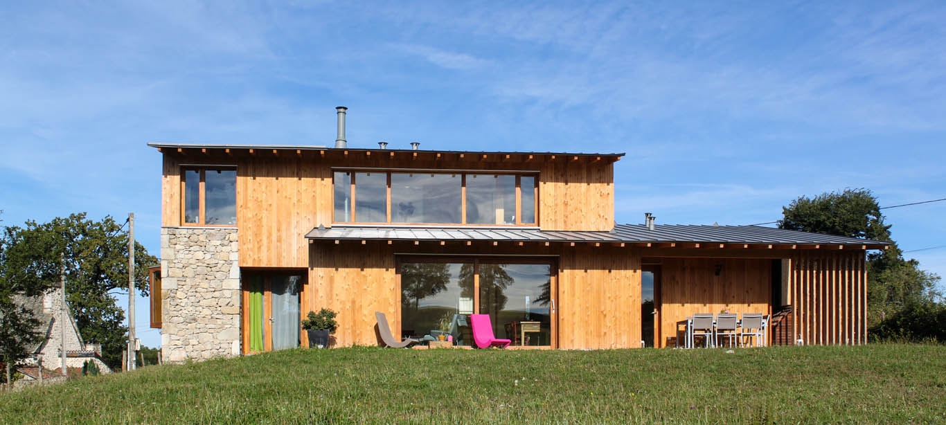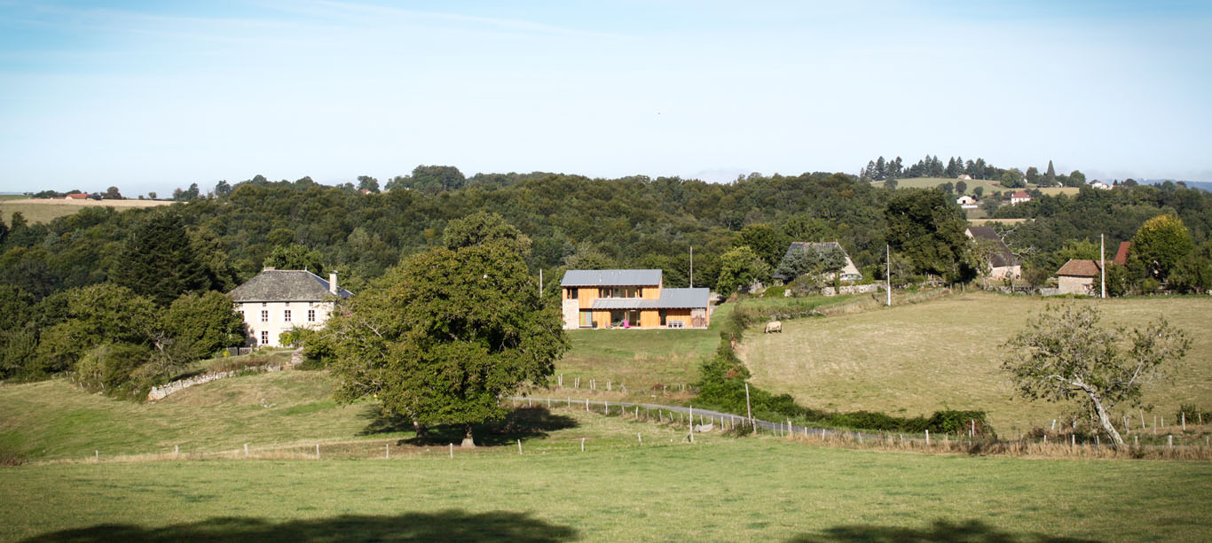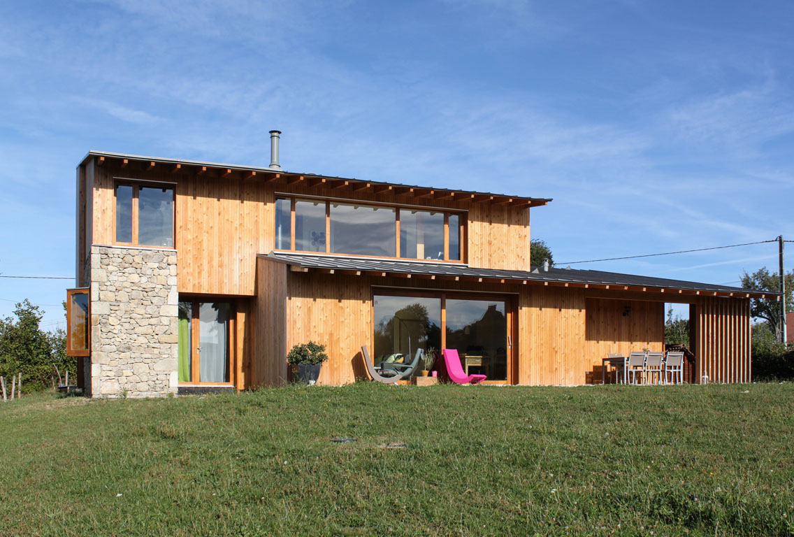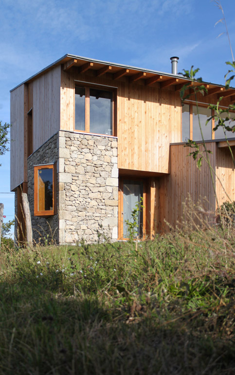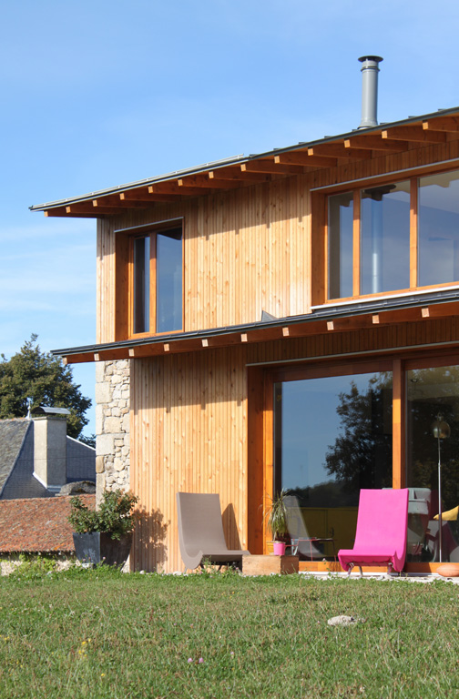 L’architecture de cette habitation, située à proximité du village d’Omps dans le Cantal, s’inspire des éléments paysagers présents sur le site pour s’y intégrer de manière durable et responsable. Orientée Est Sud-est et Ouest Nord-ouest, elle respecte l’implantation traditionnelle des maisons du village et s’ouvre largement sur le paysage vallonné à l’Est. Un système constructif mixte, en briques creuses de terre cuite et ossature bois, participe de l’intégration de la maison dans le paysage : le mur en pierres sèches qui constitue la limite Ouest du terrain a ainsi servi au parement d’une partie de l’habitation. Les murs en ossature bois sont revêtus d’un bardage vertical rainuré en mélèze. La conception de l’habitation s’inscrit dans une démarche architecturale bioclimatique. Les espaces tampons (celliers, salles d’eau, sauna) orientés au Nord-Ouest apportent de l’inertie et favorisent le confort thermique au fil des saisons. En hiver, la dalle de béton du rez-de-chaussée accumule durant le jour l’énergie du rayonnement solaire avant de la restituer la nuit. Les pièces de vie du rez-de-chaussée (séjour, cuisine) se prolongent à l’extérieur par une terrasse en bois abritée d’un large débord de toit qui sert de masque solaire durant la saison d’été. La qualité des ouvertures permet par ailleurs d’optimiser les apports solaires tout au long de la journée. L’isolation est réalisée en ouate de cellulose et en fibre de bois. Elle tend à optimiser les performances énergétiques et le bilan environnemental du projet. Un simple poêle à bois permet ainsi de chauffer toute la maison. La toiture mono-pente en zinc permet une gestion responsable des eaux de pluie, recueillies le long de la terrasse et drainées vers une cuve de rétention. Le choix du douglas pour la structure et du mélèze pour l’extérieur privilégie les gisements de ressources locales et permet ainsi de soutenir la filière de transformation à l’échelle du Massif Central. Les entreprises actrices de la construction sont elles aussi locales. Un sas isole l’entrée principale, située au Nord-Ouest, des pièces de vie. Une entrée secondaire permet d’accéder depuis le garage couvert au cellier, puis à la cuisine et au séjour, qui se déploie sur une double hauteur. Au rez-de-chaussée se trouvent également une chambre, une salle d’eau et le sauna. Un escalier en bois distribue trois autres chambres et un bureau ouvert sur le séjour. Le mobilier de la cuisine et des salles de bain ainsi que le sauna ont été dessiné par nos soins.
