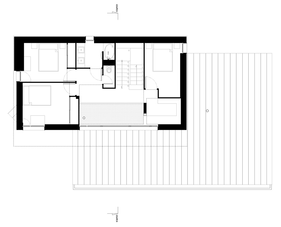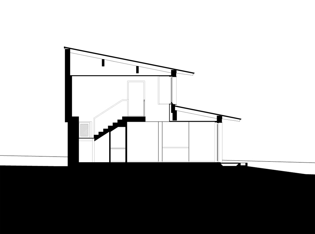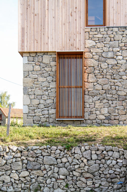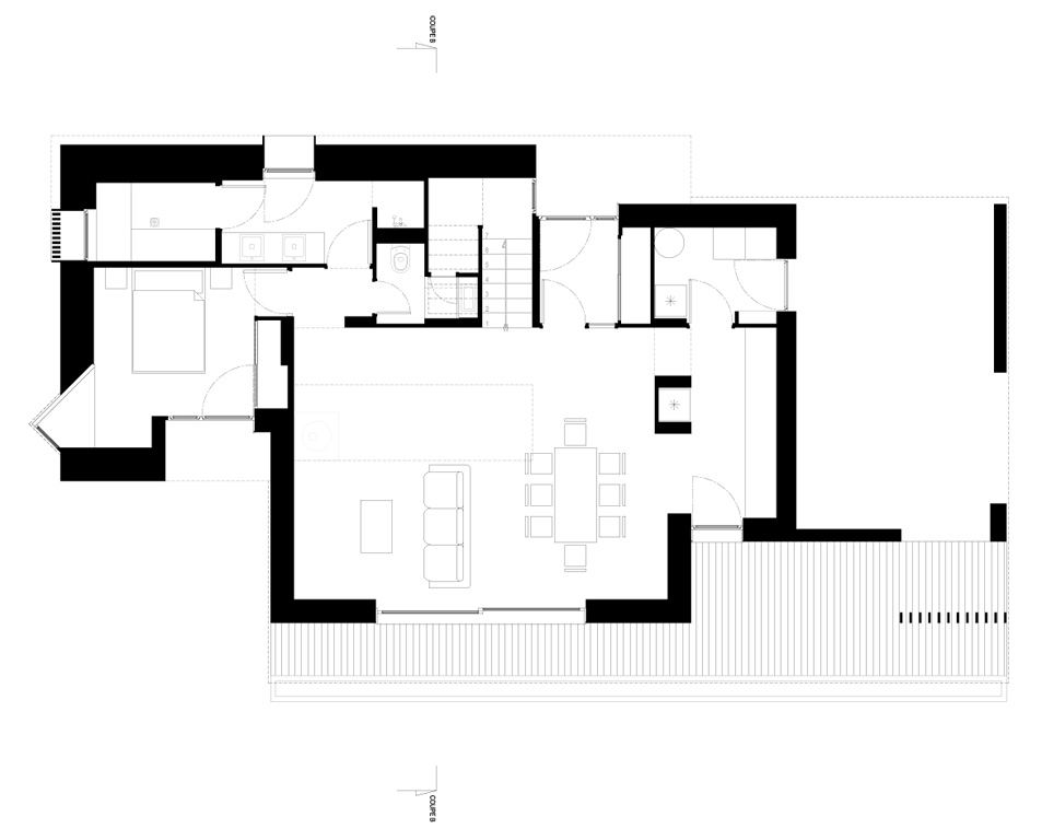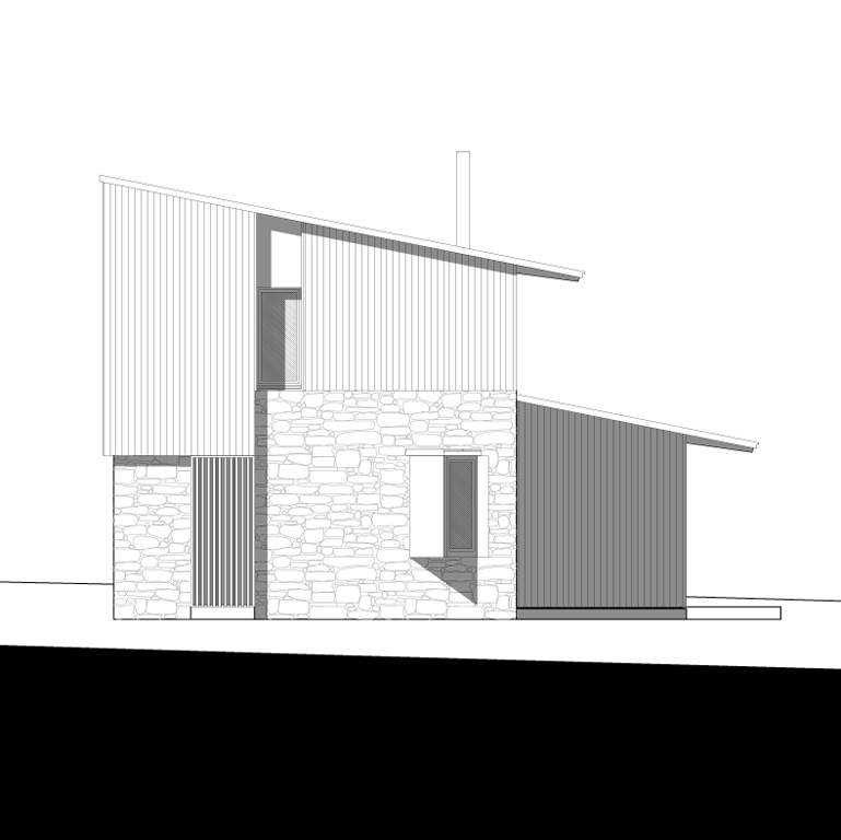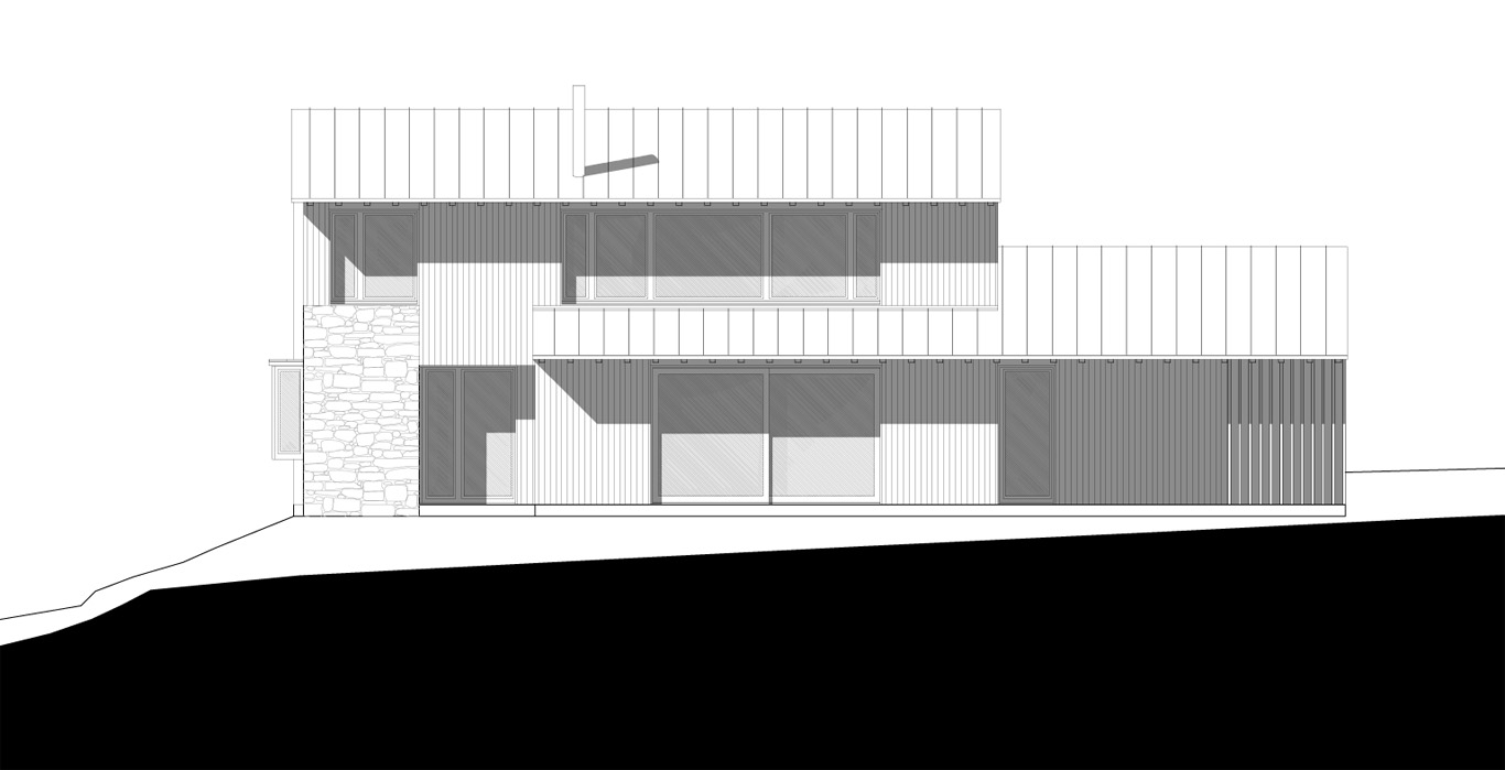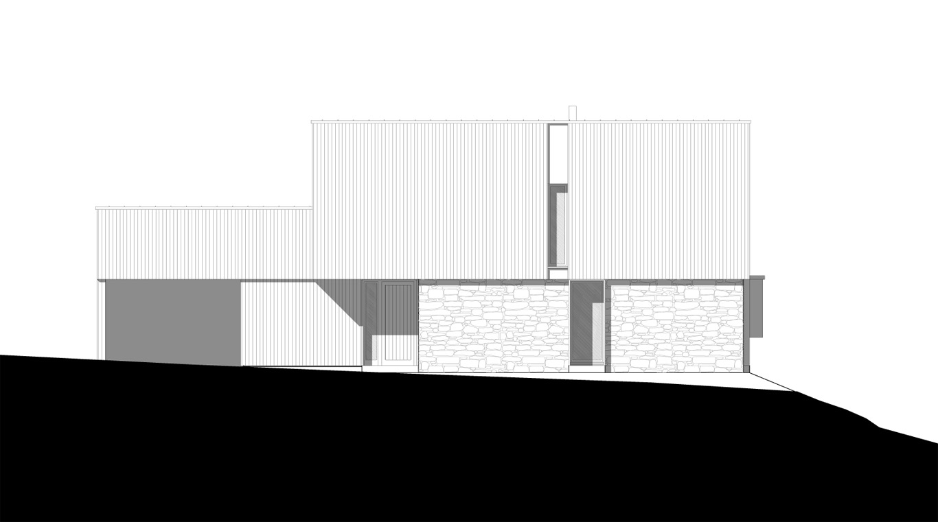 L’architecture de cette habitation, située à proximité du village d’Omps dans le Cantal, s’inspire des éléments paysagers présents sur le site pour s’y intégrer de manière durable et responsable. Orientée Est Sud-est et Ouest Nord-ouest, elle respecte l’implantation traditionnelle des maisons du village et s’ouvre largement sur le paysage vallonné à l’Est. Un système constructif mixte, en briques creuses de terre cuite et ossature bois, participe de l’intégration de la maison dans le paysage : le mur en pierres sèches qui constitue la limite Ouest du terrain a ainsi servi au parement d’une partie de l’habitation. Les murs en ossature bois sont revêtus d’un bardage vertical rainuré en mélèze. La conception de l’habitation s’inscrit dans une démarche architecturale bioclimatique. Les espaces tampons (celliers, salles d’eau, sauna) orientés au Nord-Ouest apportent de l’inertie et favorisent le confort thermique au fil des saisons. En hiver, la dalle de béton du rez-de-chaussée accumule durant le jour l’énergie du rayonnement solaire avant de la restituer la nuit. Les pièces de vie du rez-de-chaussée (séjour, cuisine) se prolongent à l’extérieur par une terrasse en bois abritée d’un large débord de toit qui sert de masque solaire durant la saison d’été. La qualité des ouvertures permet par ailleurs d’optimiser les apports solaires tout au long de la journée. L’isolation est réalisée en ouate de cellulose et en fibre de bois. Elle tend à optimiser les performances énergétiques et le bilan environnemental du projet. Un simple poêle à bois permet ainsi de chauffer toute la maison. La toiture mono-pente en zinc permet une gestion responsable des eaux de pluie, recueillies le long de la terrasse et drainées vers une cuve de rétention. Le choix du douglas pour la structure et du mélèze pour l’extérieur privilégie les gisements de ressources locales et permet ainsi de soutenir la filière de transformation à l’échelle du Massif Central. Les entreprises actrices de la construction sont elles aussi locales. Un sas isole l’entrée principale, située au Nord-Ouest, des pièces de vie. Une entrée secondaire permet d’accéder depuis le garage couvert au cellier, puis à la cuisine et au séjour, qui se déploie sur une double hauteur. Au rez-de-chaussée se trouvent également une chambre, une salle d’eau et le sauna. Un escalier en bois distribue trois autres chambres et un bureau ouvert sur le séjour. Le mobilier de la cuisine et des salles de bain ainsi que le sauna ont été dessiné par nos soins.
