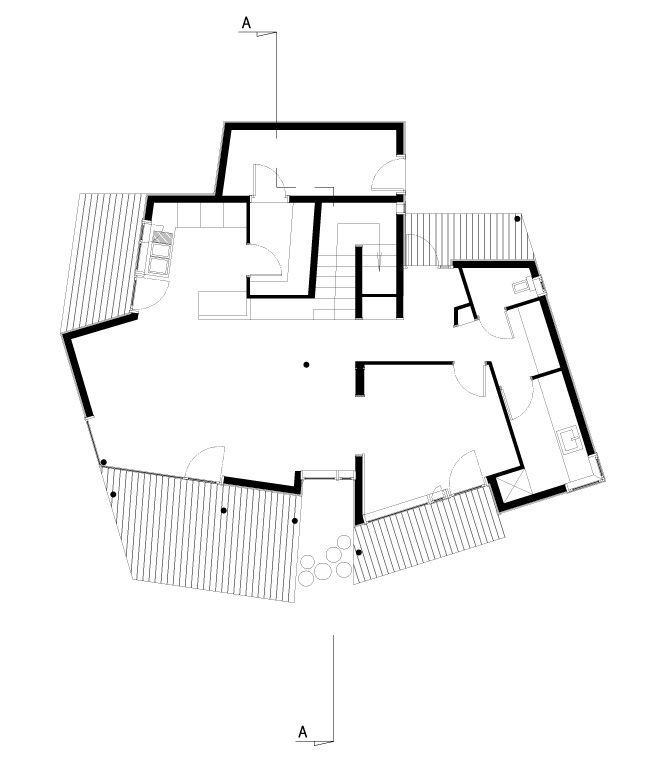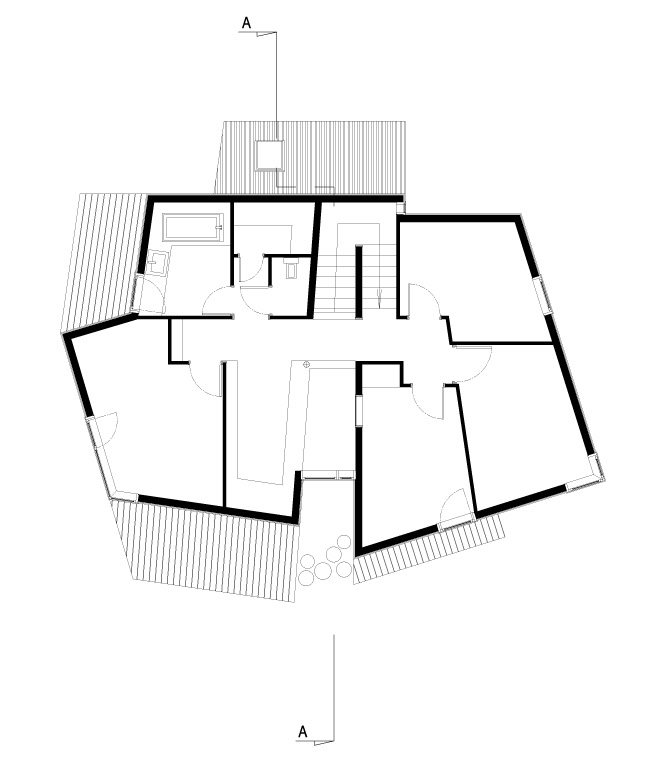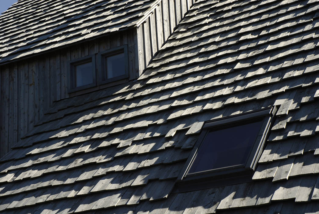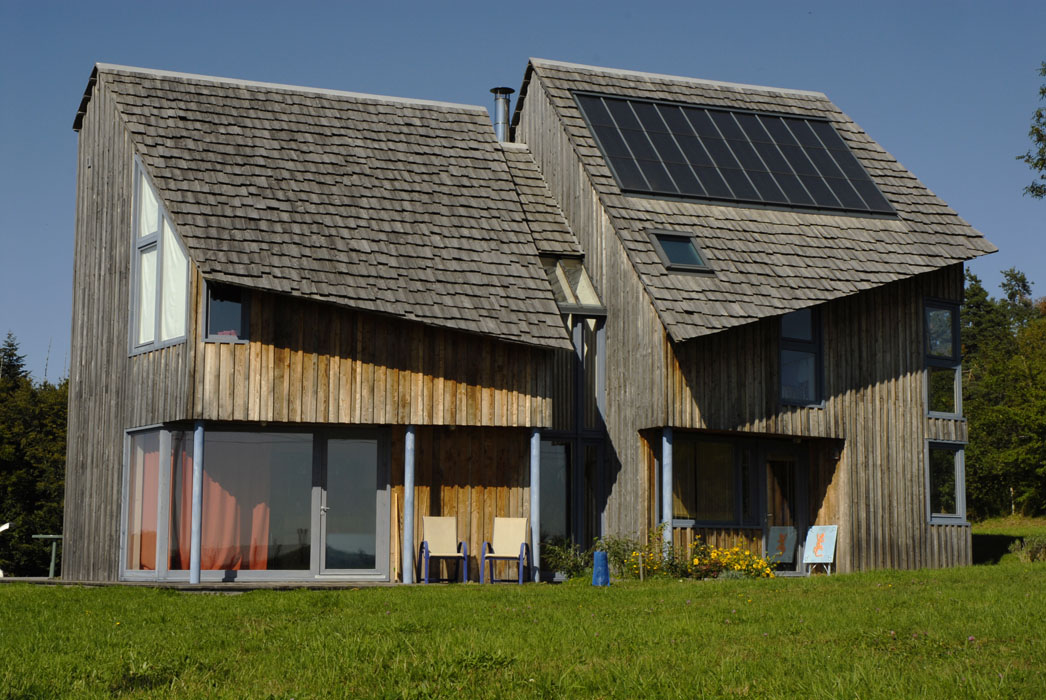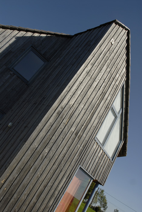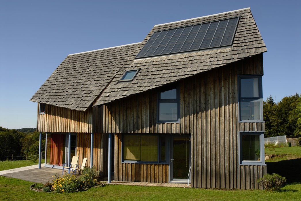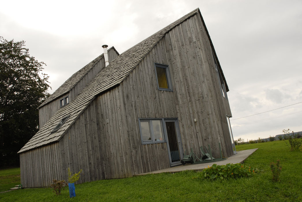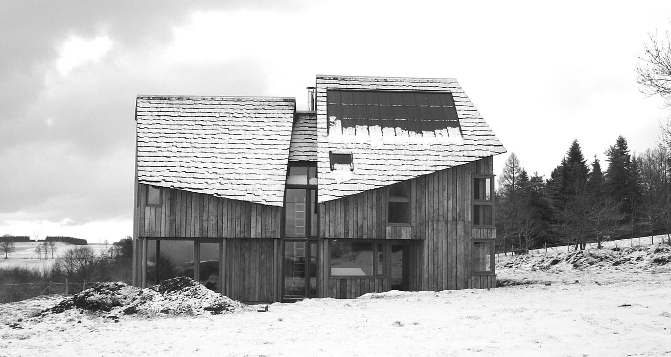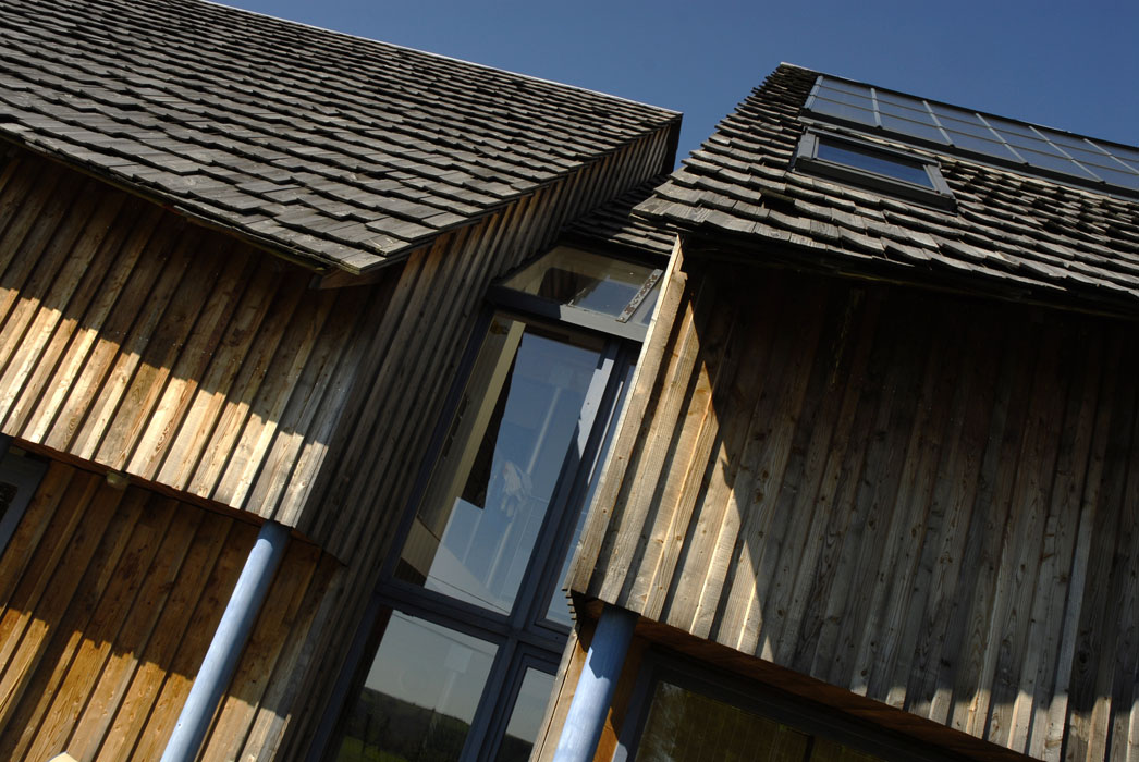 Implantée le long de la route des Crêtes à proximité d’Aurillac, cette habitation solaire à ossature bois se décompose en deux volumes principaux. Si les toitures, couvertes en bardeaux de mélèze, évoquent les constructions traditionnelles couvertes en lauzes, leurs formes très découpées forment une silhouette dynamique. Le bardage extérieur en planches de mélèze irrégulières, conservé dans son aspect brut, est mis en œuvre selon le principe communément adopté pour les constructions traditionnelles des remises et des abris en bois. Les abords immédiats de l’habitation seront plantés d’arbres de haute tige à l’image des écrins végétaux propres aux sites construits isolés dans les estives tels que les burons. Une grande partie des travaux étant réalisée par le maître d’ouvrage, une des missions atypiques de l’architecte consiste à accompagner le client dans les différentes phases de réalisation du projet.