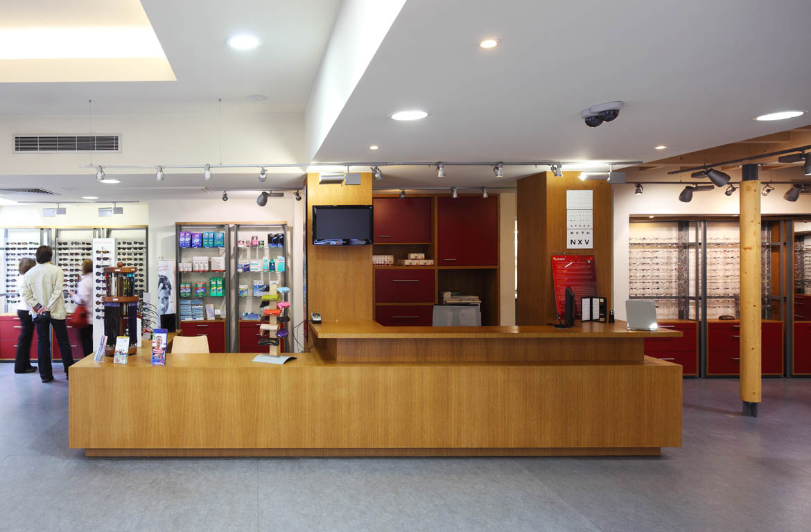 Les rez-de-chaussée des hangars, de plain-pied avec le centre de ville, ont naturellement été réservés aux fonctions commerciales de la Mutualité Française Corrèze : le centre optique en tête de proue et le centre audio en fond de commerce.
