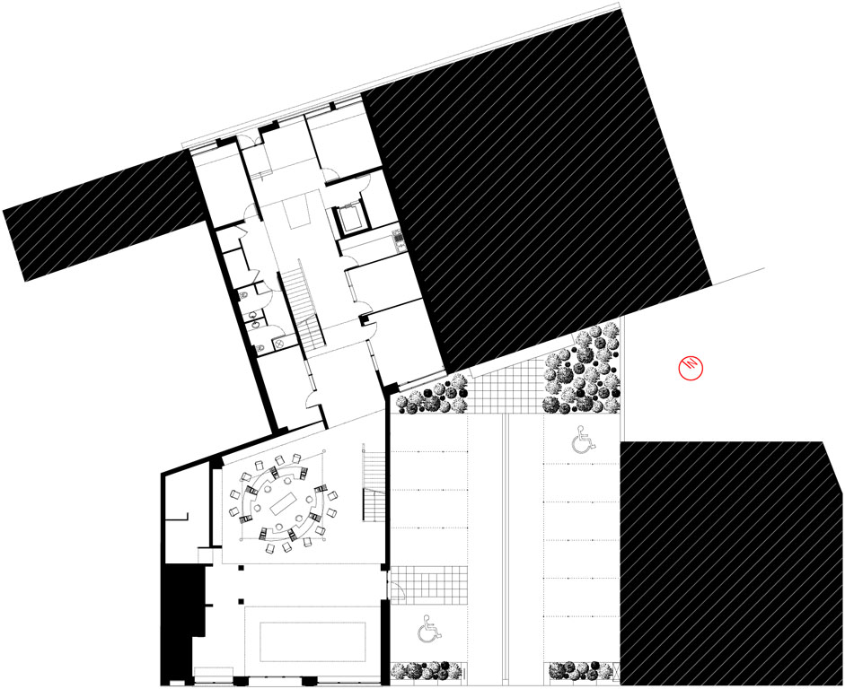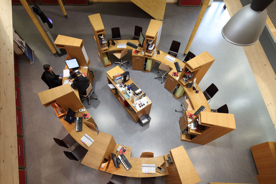 Essentiellement intérieur, le projet propose d’éviter le cloisonnement des services : plutôt que de confiner l’étage de la direction dans une forme d’isolement, il a été proposé de le rendre accessible directement depuis le rez-de-chaussée commercial. Il est desservi généreusement par deux escaliers intérieurs non cloisonnés.