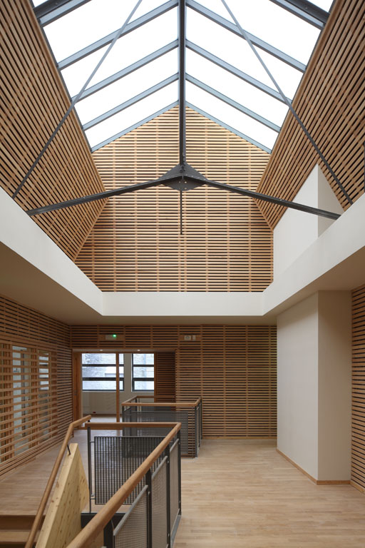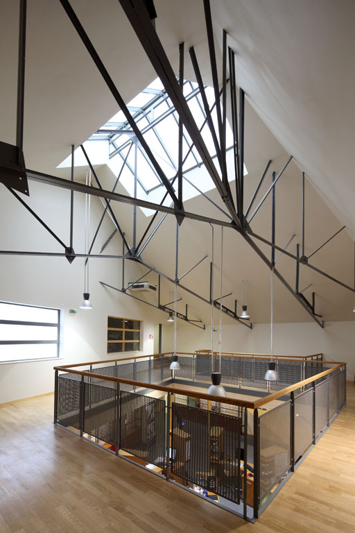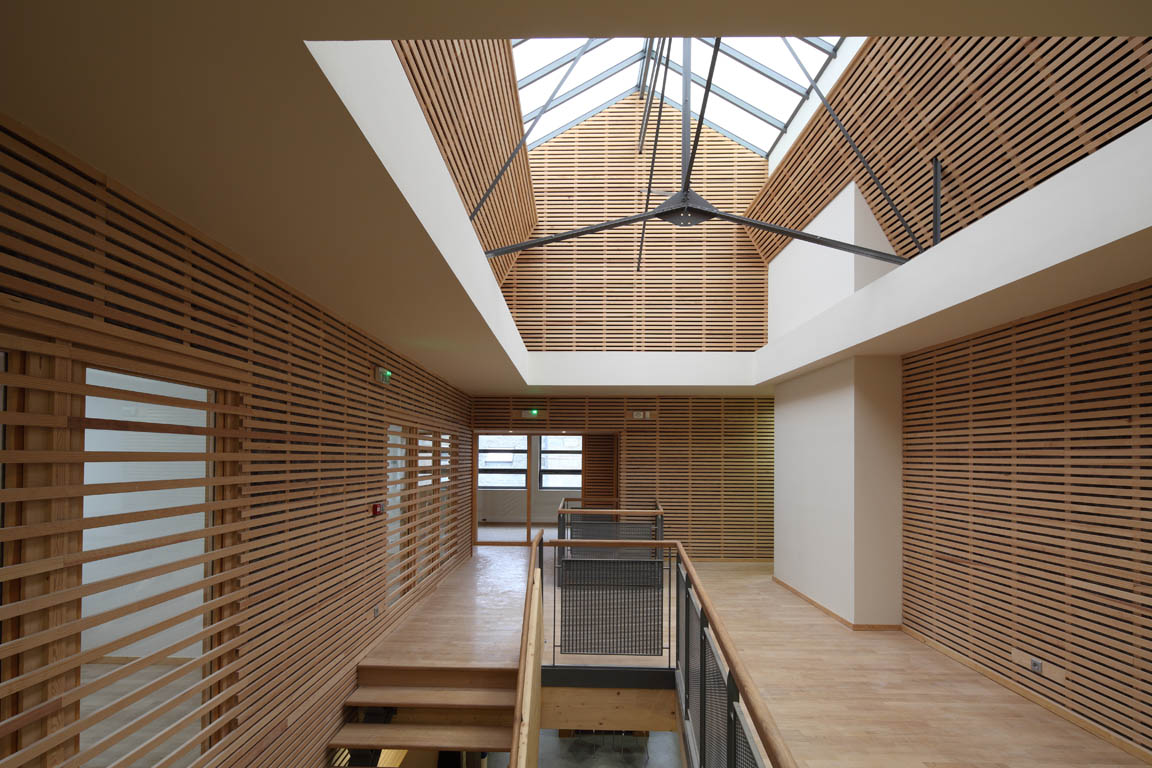 Ce dispositif permet en outre de faire rentrer la lumière naturelle par deux verrières, l’une existante, l’autre introduite par le projet. Ces grands puits de lumière ont permis d’éclairer le rez-de-chaussée, dans sa profondeur. A l’étage, les bureaux s’ouvrent largement sur cet espace lumineux qui apparait ainsi comme une sorte de patio, couvert par une vaste verrière.