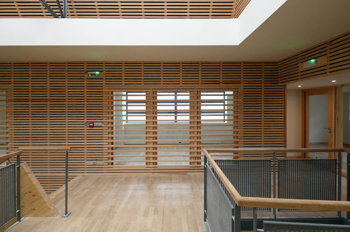 Les murs en ossature bois sont vêtus d’un bardage en bois ajouré sur la face extérieure des bureaux renforçant l’ambigüité de statut de l’espace central sous la verrière créée à la fois espace intérieur et extérieur. Les surfaces visibles de la « hotte » précédant la verrière sont traitées de la même manière. Une corniche lumineuse éclaire ces surfaces dés la nuit tombée. A l’arrière du bardage des parois verticales (murs) et obliques (hotte) est disposé un absorbant acoustique améliorant le confort des locaux de travail. Sur la face intérieure des bureaux, les murs à ossature bois sont dissimulés par des parements en plaques de plâtre.