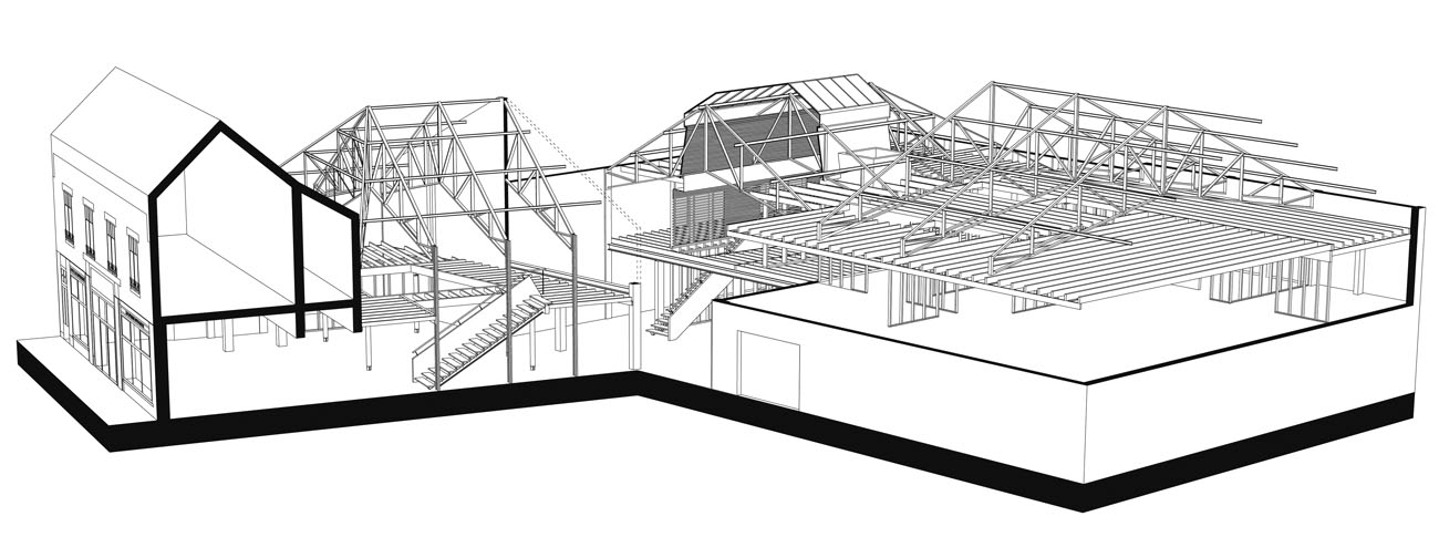 Si les hangars ne présentent pas un intérêt patrimonial majeur du point de vue de leur perception extérieure, leurs charpentes ont en revanche mérité une attention particulière. Ainsi deux grands vides ont été ménagés dans les planchers en bois créés pour rendre visibles, depuis le rez-de-chaussée commercial, les structures métalliques existantes composées d’un assemblage élégant de cornières métalliques.