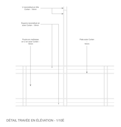 La structure principale de la passerelle est intégralement constituée par des profilés reconstitués soudés obtenus à partir de tôles en acier corten de 16mm.