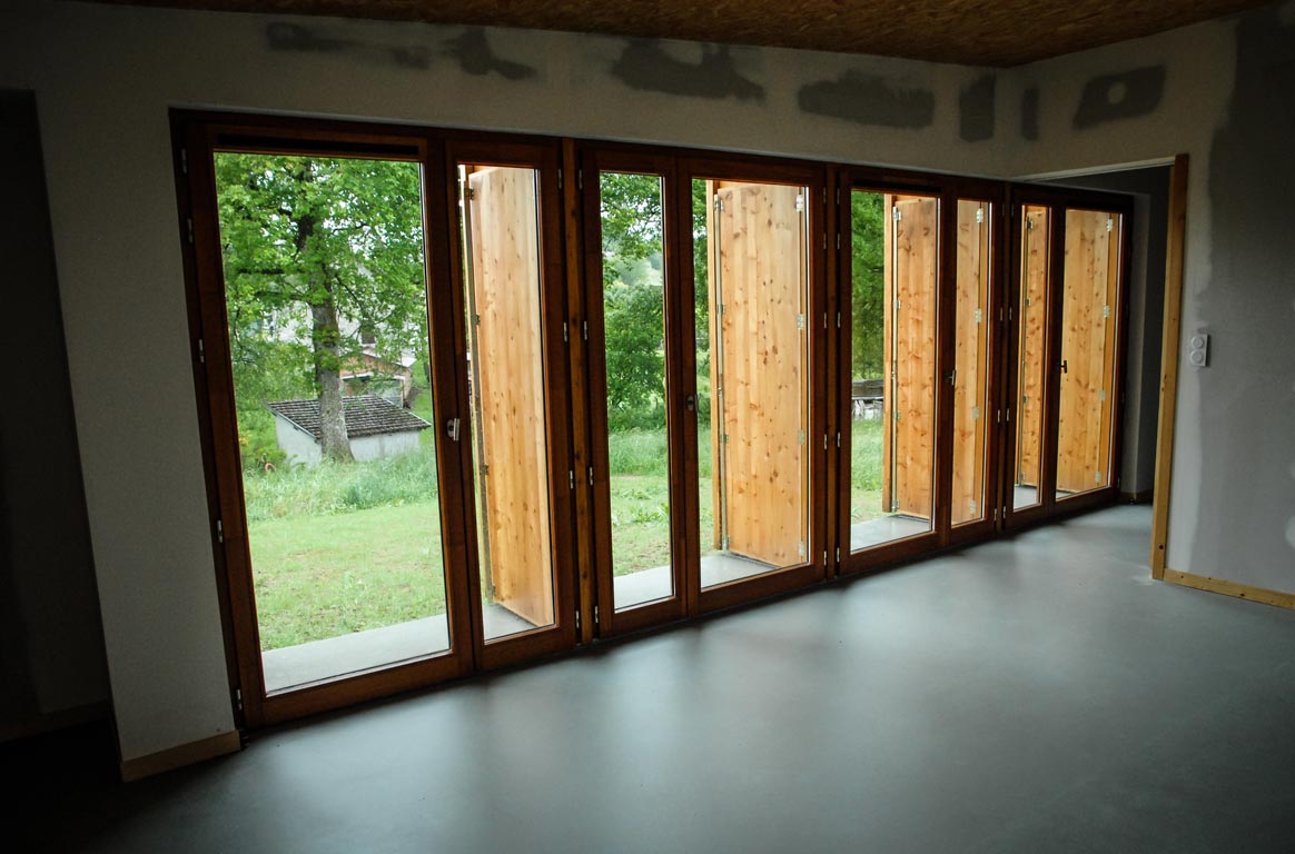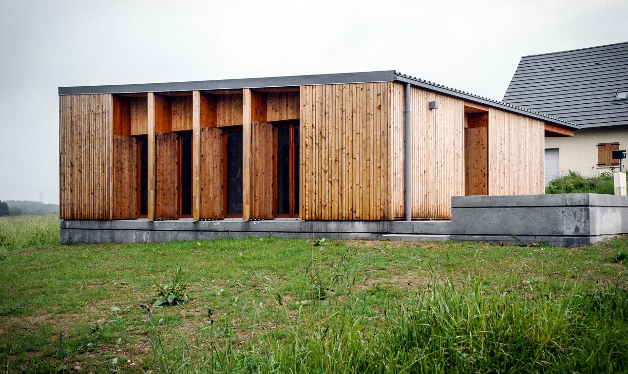 La solution retenue consiste à optimiser les espaces intérieurs en les rendant le plus fluide possible pour réduire leur surface. Ainsi, les espaces intérieurs communiquent entre eux, en enfilade, selon un plan compact. Le paysage extérieur –un talweg, les vestiges d’une haie bocagère et des jardins potagers- est propulsé dans l’espace intérieur au travers de larges baies vitrées toute hauteur, parfois continues entre les pièces.