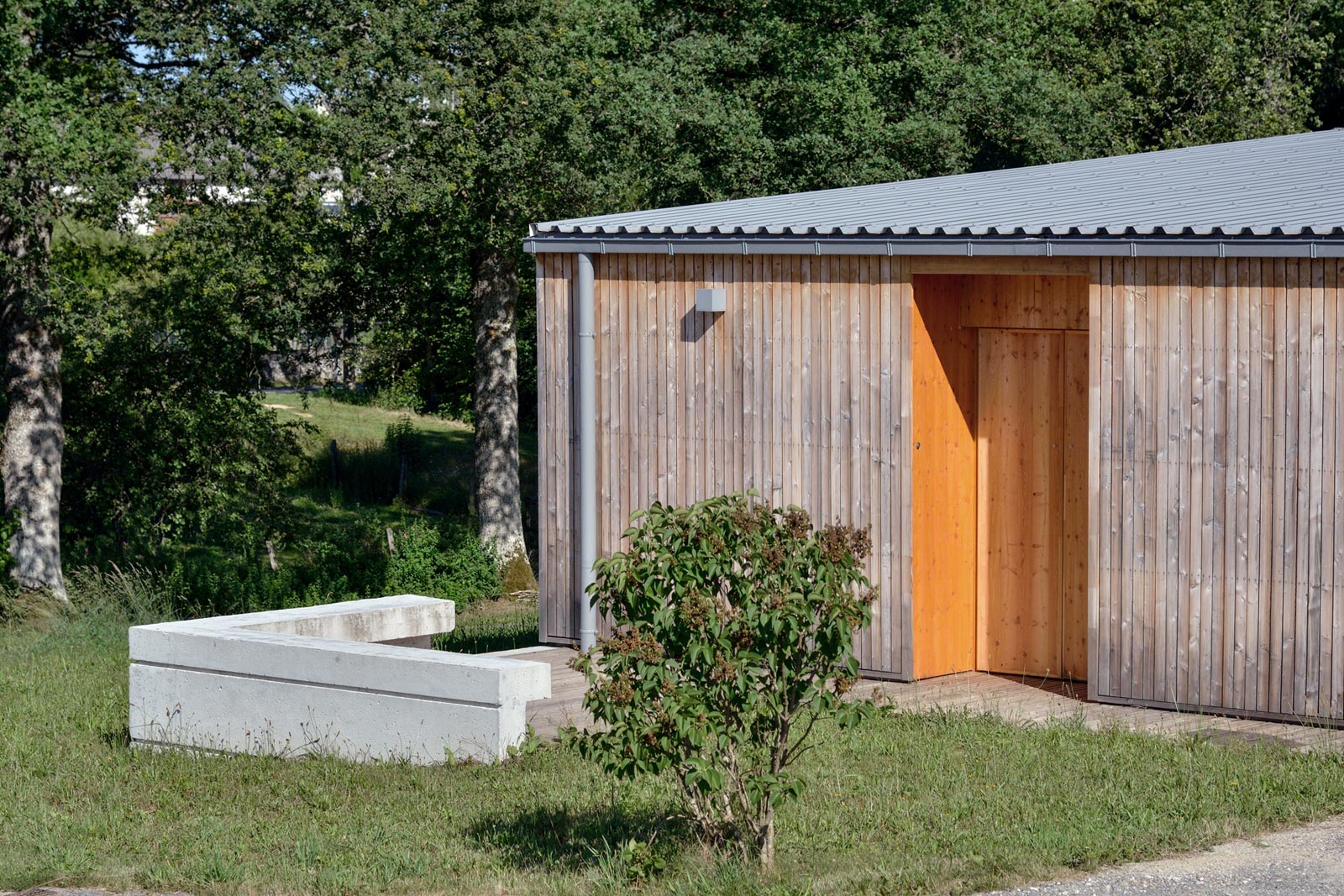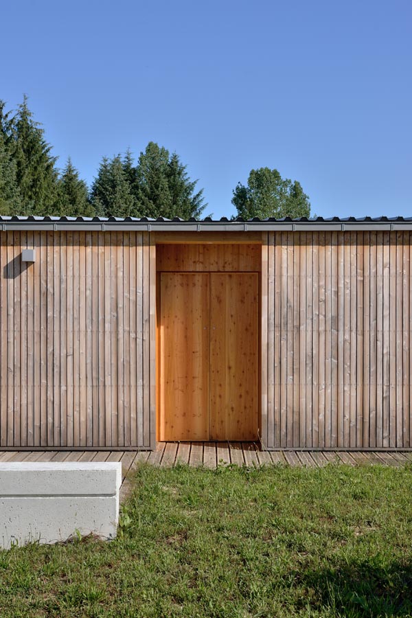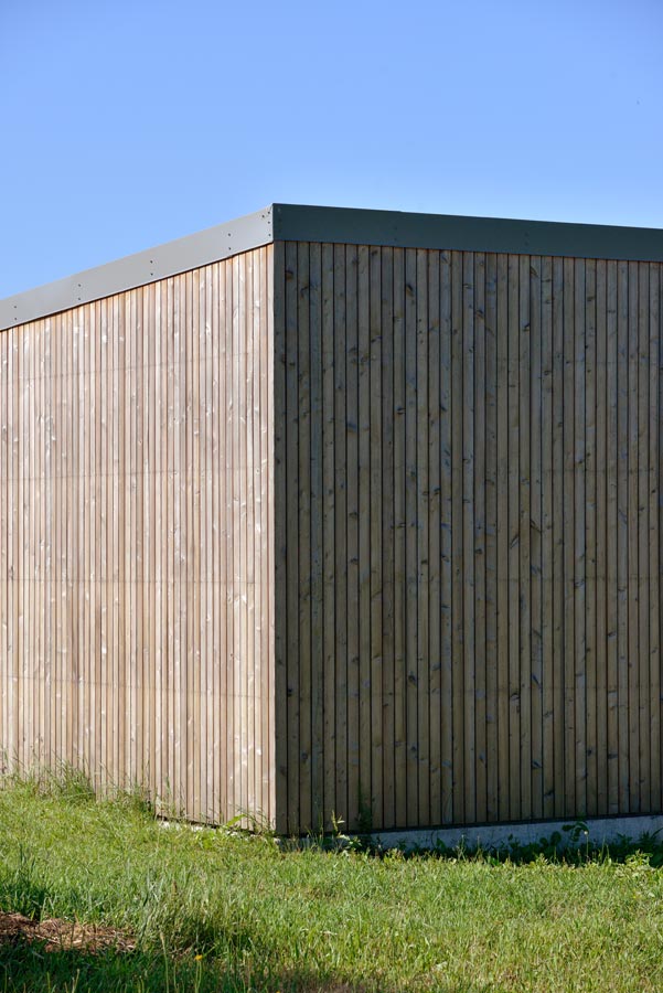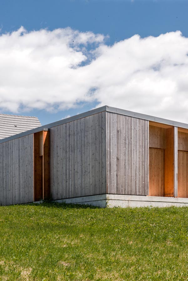 La matérialité de l’édifice se révèle sous la forme de trois strates, un socle massif en béton pour aménager le sol et créer une plateforme horizontale, un volume en bois et une couverture en acier. Le socle se prolonge et génère une terrasse habitable. Le volume en bois est sculpté : les creux sont lisses, les surfaces courantes plus rugueuses. Le toit en bas acier est le matériau de couverture le plus économique qui soit… Seuls quelques éléments architecturaux courants nous rappellent qu’il s’agit bien d’un programme domestique.