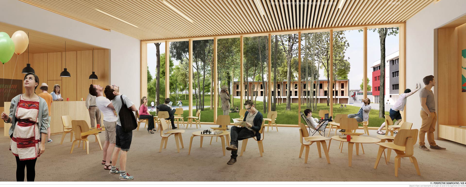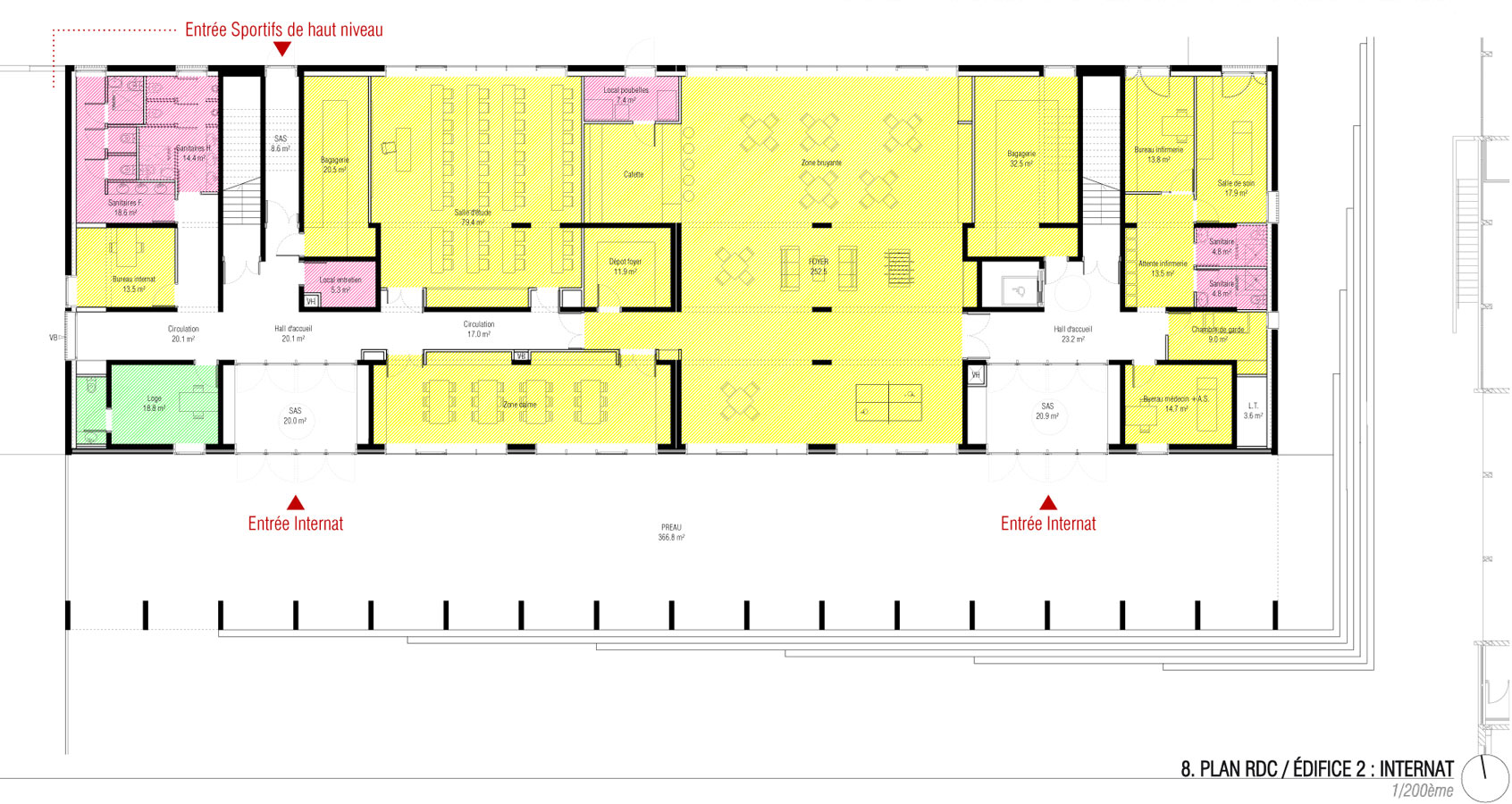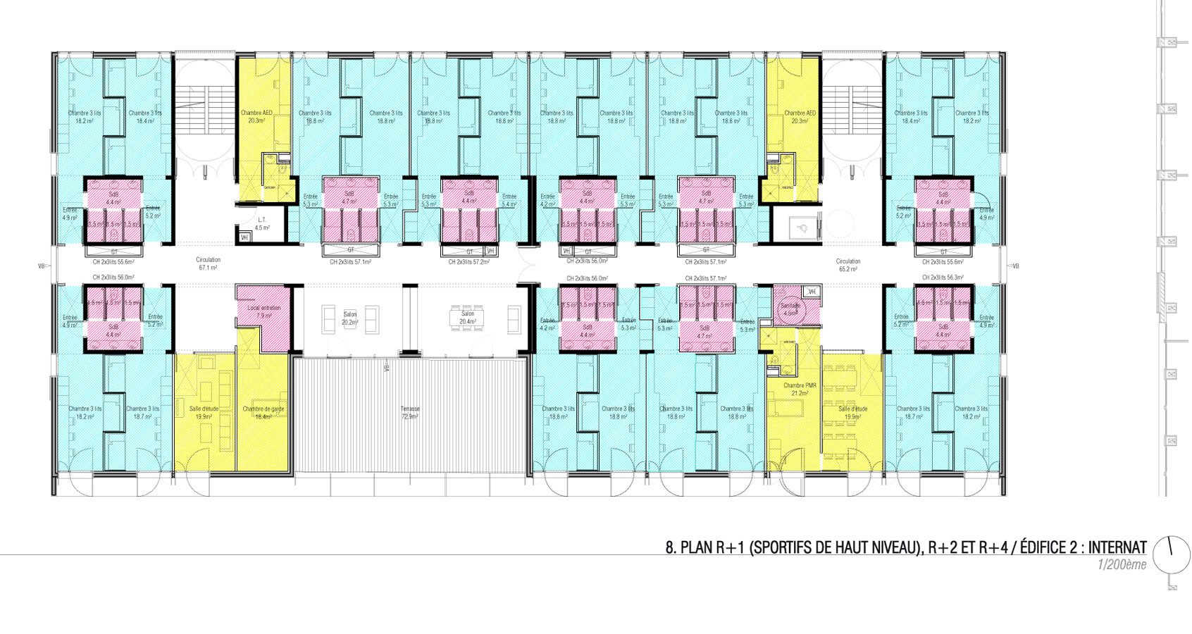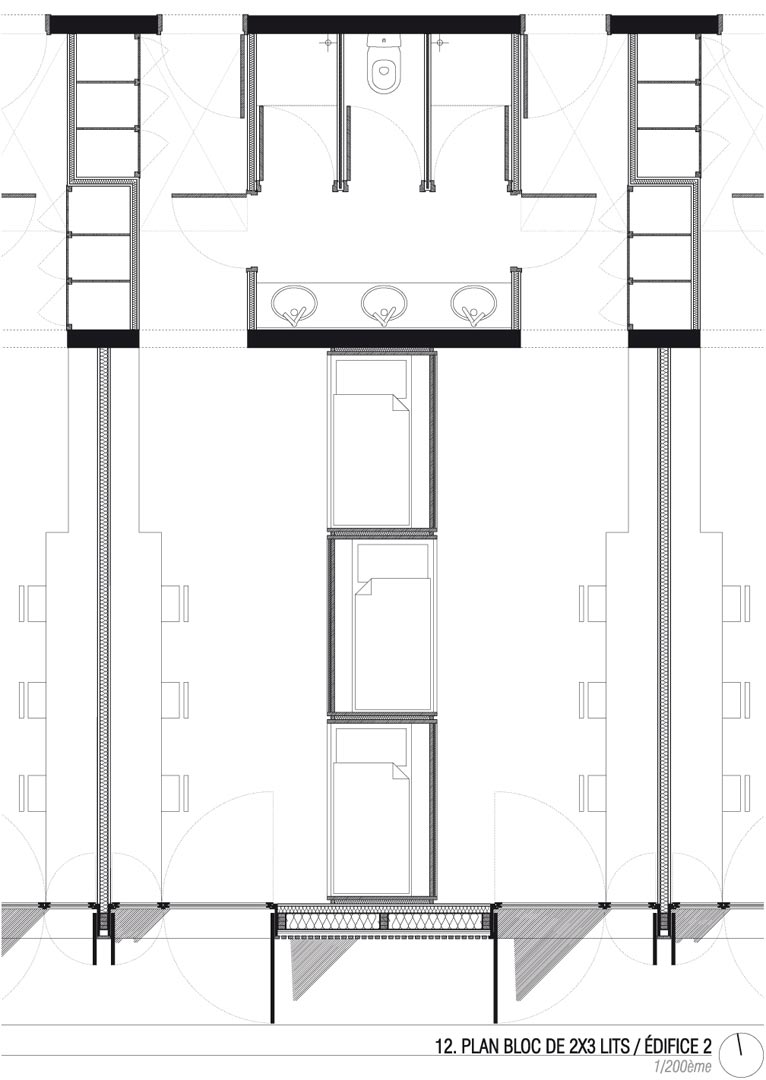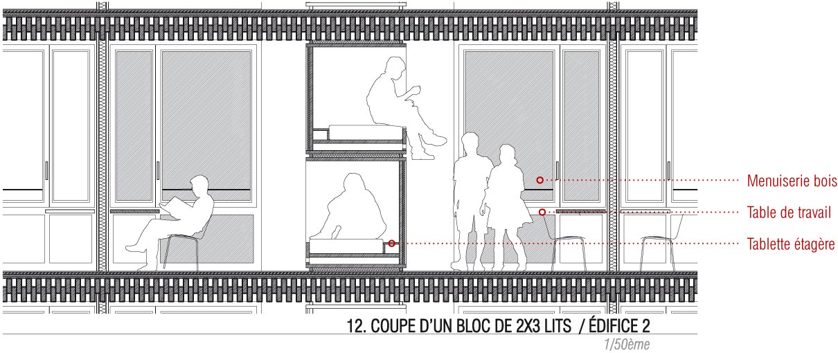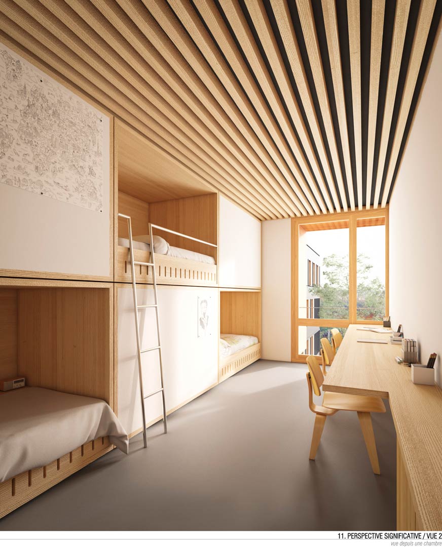 L’édifice 2 abrite l’internat. Le rez-de-chaussée comprend l’ensemble des espaces communs dont le foyer traversant. Ce dernier s’ouvre sur un préau généreux qui occupe toute la longueur de l’édifice. Il anime la séquence d’entrée du lycée. Les chambres, les salles d’études et les espaces de détente sont réparties dans les 4 étages supérieurs. Un accès depuis la façade Nord, à l’Ouest de l’édifice sera privilégié pour permettre aux sportifs de haut niveau d’accéder aux 60 lits du premier étage hors temps scolaire et le week-end. A chaque étage, une loggia généreuse, orientée plein Sud prolonge un espace salon qui constitue un élargissement de la distribution des chambres. Les circulations sont éclairées naturellement, à la fois par les ouvertures qui donnent sur les terrasses extérieures mais aussi par les percements pratiqués dans les pignons. Les chambres sont munies de meubles préfabriqués en bois spécifiquement conçus pour le projet. Chaque meuble comprend 6 lits. Ceux-ci sont superposés et organisés en quinconce : trois lits donnent dans une chambre, les trois autres dans la chambre voisine qui partage la même salle de bain. Cette disposition permet d’organiser l’espace de manière optimale et de rendre plus intimes les couchages des lycéens. Des volets en bois occultent l’ensemble des chambres et rythment les façades. Ils sont facilement manipulables depuis l’intérieur des chambres. Un plan de travail est installé dans chaque chambre, en guise de bureaux pour les lycéens. Une casquette filante sur l’ensemble de la façade Sud complète le dispositif de protection solaire. Elle assure en même temps l’obstacle au passage du feu d’un étage à l’autre.