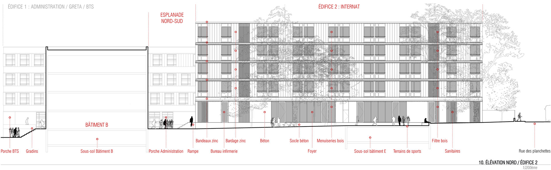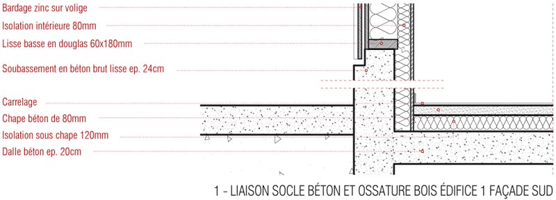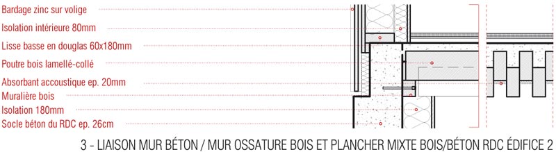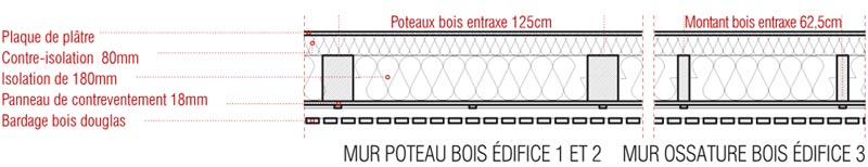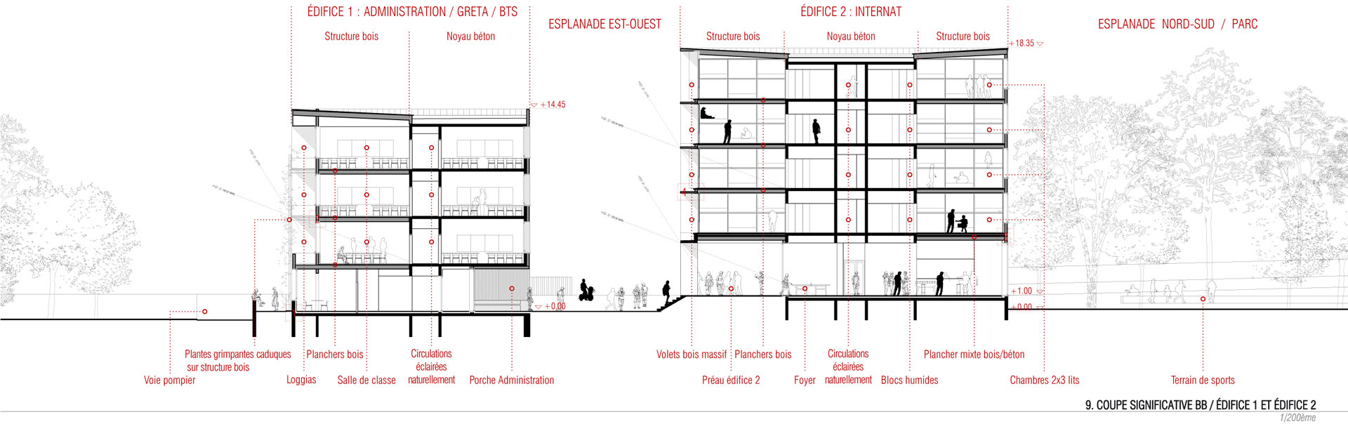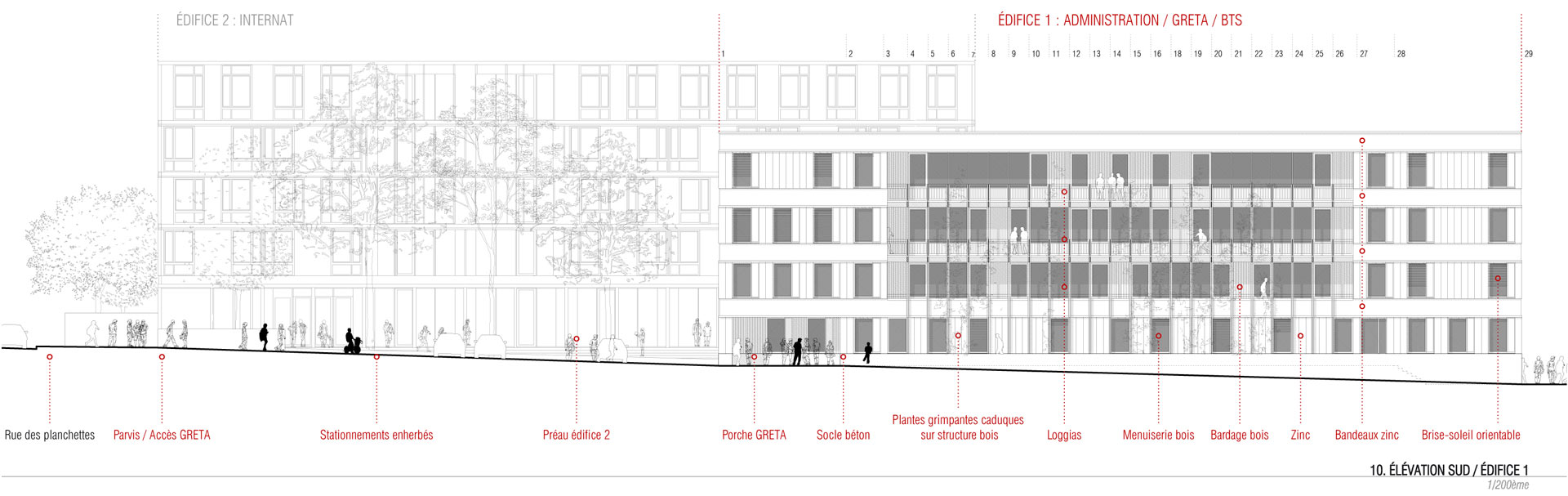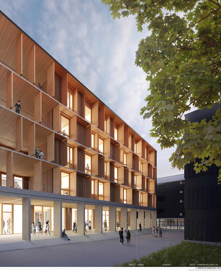 Les nouveaux édifices du projet sont implantés en limite des esplanades et contribuent à les qualifier. Tous orientés plein Sud, ils favorisent les apports solaires passifs. Du point de vue structurel, les édifices 1 et 2 articulent des noyaux en béton et des volumes en bois composés de planchers et de murs de façades en structure bois. Les logements sont construits en murs à ossature bois. Des murs de refend en béton assurent l’isolation acoustique entre logements tout en apportant une inertie thermique aux espaces habités améliorant le confort d’été. Tous les murs extérieurs sont à ossature bois, sauf le sous-bassement de l’édifice 1 (administration, GRETA et BTS), le rez-de-chaussée de l’édifice 2 (internat) et le socle de l’édifice 3 (logements de fonction et chaufferie) qui sont entièrement en béton pour une question de pérennité des ouvrages. Les façades supérieures les plus exposées sont bardées en zinc. Les façades abritées sont en bardage bois.