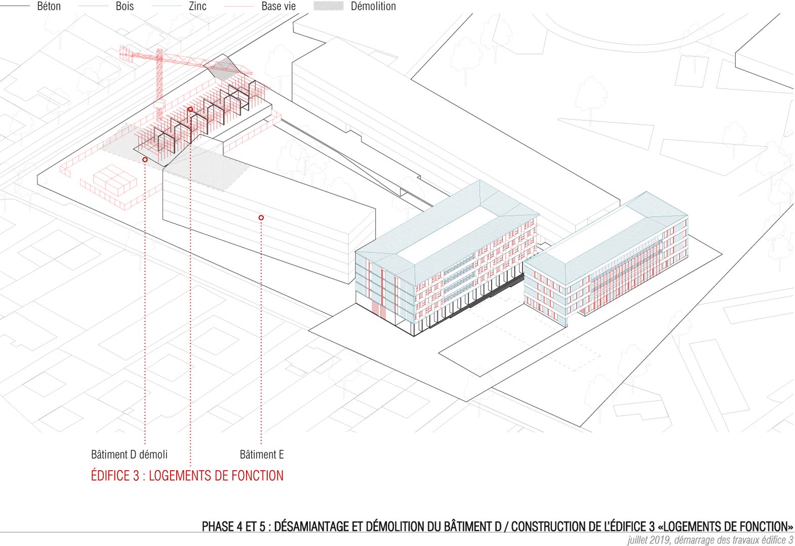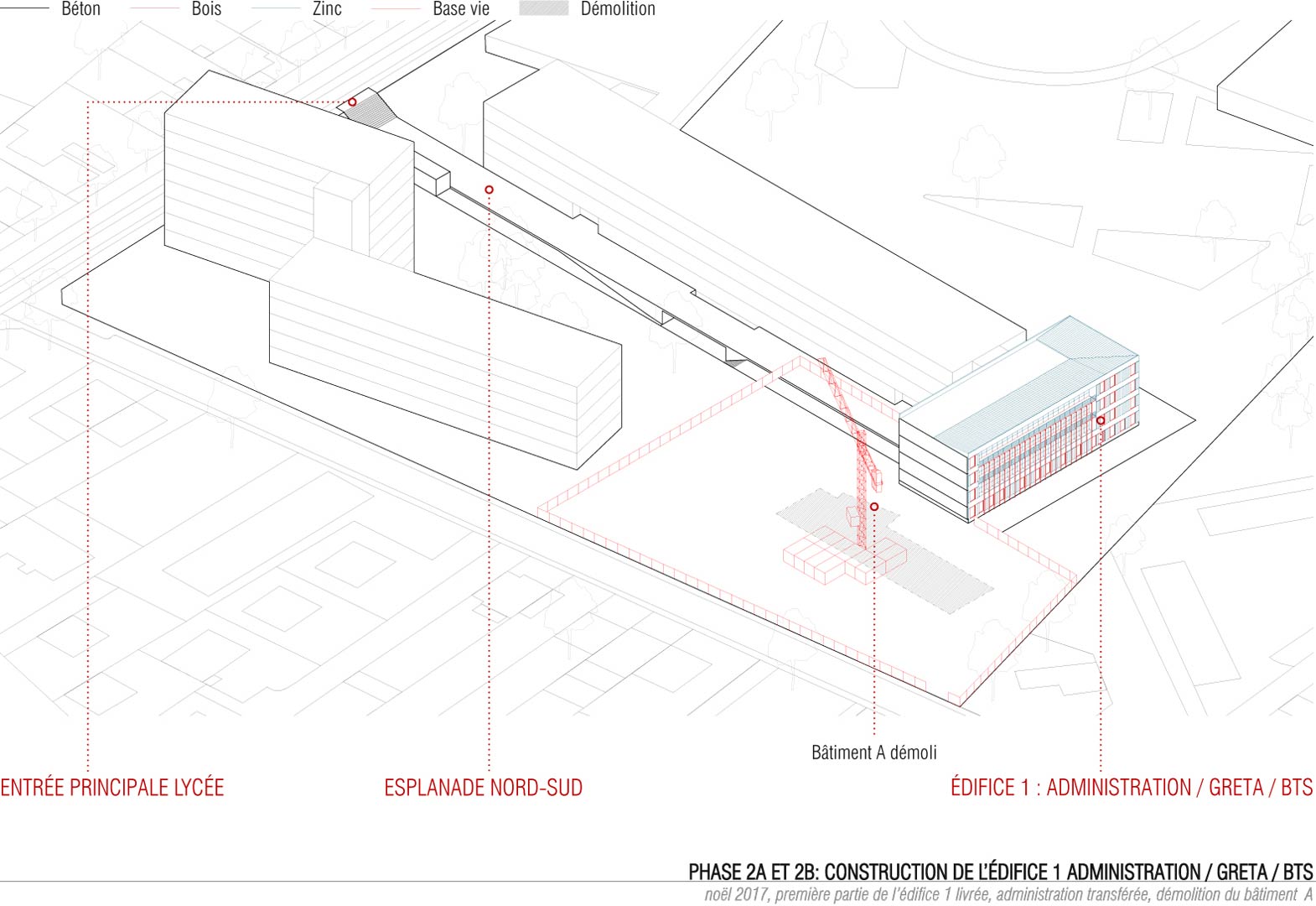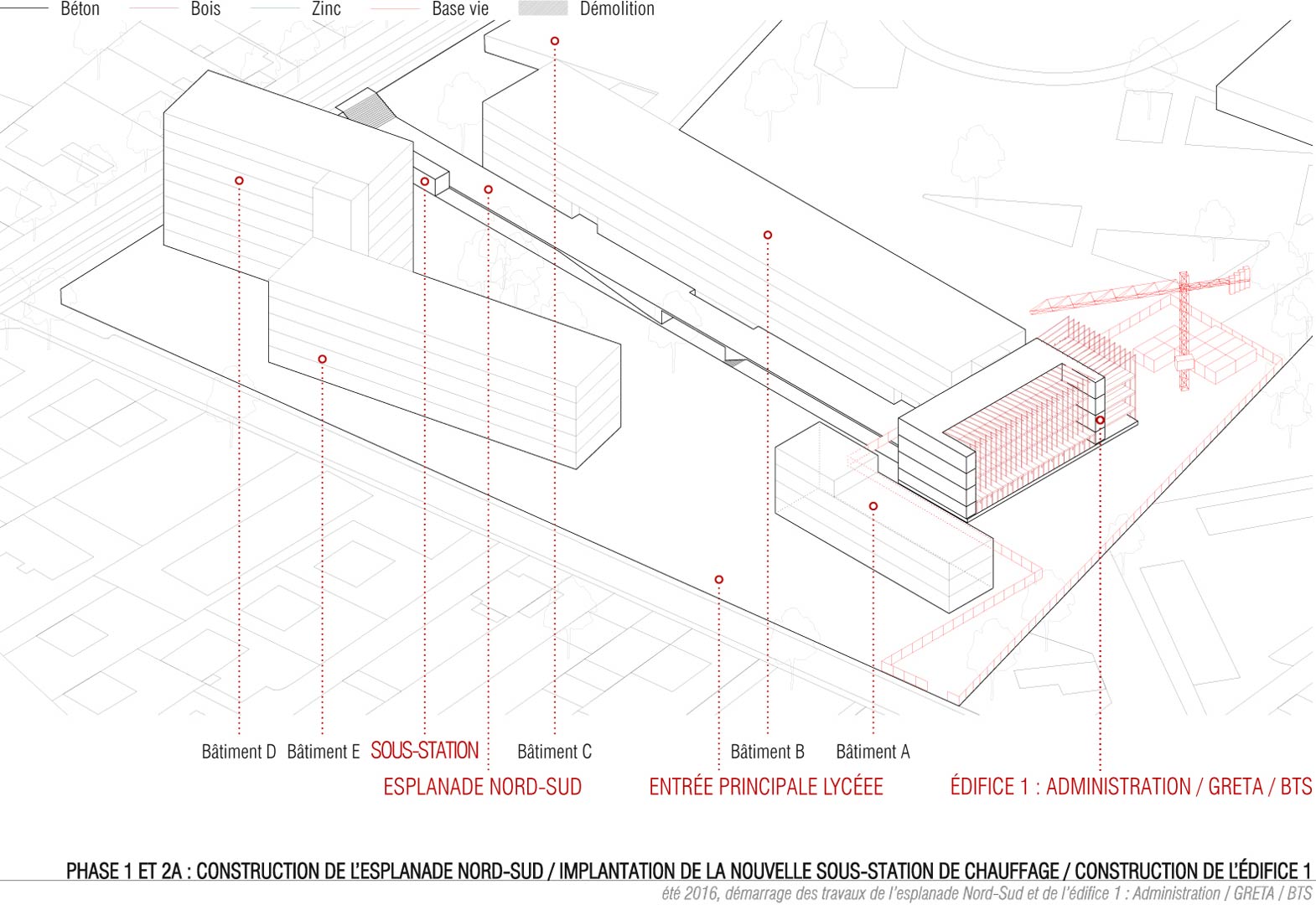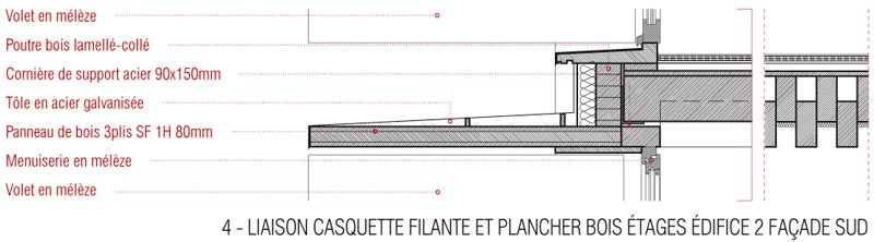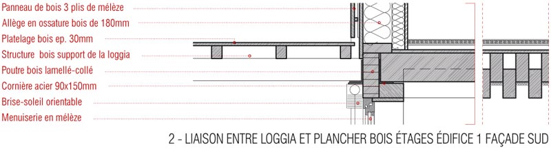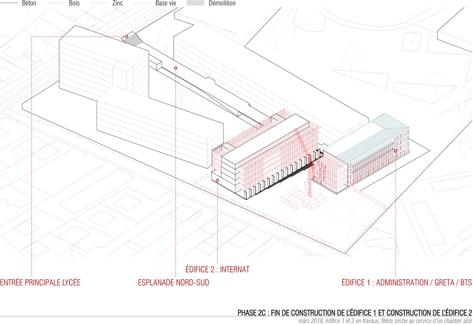 Les nouveaux édifices du projet sont implantés en limite des esplanades et contribuent à les qualifier. Tous orientés plein Sud, ils favorisent les apports solaires passifs. Du point de vue structurel, les édifices 1 et 2 articulent des noyaux en béton et des volumes en bois composés de planchers et de murs de façades en structure bois. Les logements sont construits en murs à ossature bois. Des murs de refend en béton assurent l’isolation acoustique entre logements tout en apportant une inertie thermique aux espaces habités améliorant le confort d’été. Tous les murs extérieurs sont à ossature bois, sauf le sous-bassement de l’édifice 1 (administration, GRETA et BTS), le rez-de-chaussée de l’édifice 2 (internat) et le socle de l’édifice 3 (logements de fonction et chaufferie) qui sont entièrement en béton pour une question de pérennité des ouvrages. Les façades supérieures les plus exposées sont bardées en zinc. Les façades abritées sont en bardage bois.