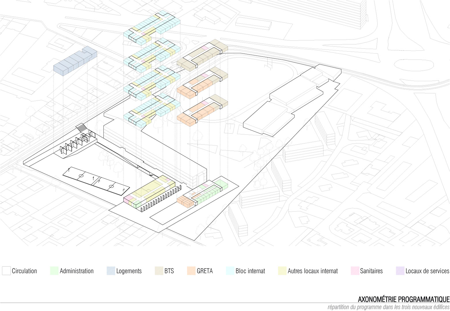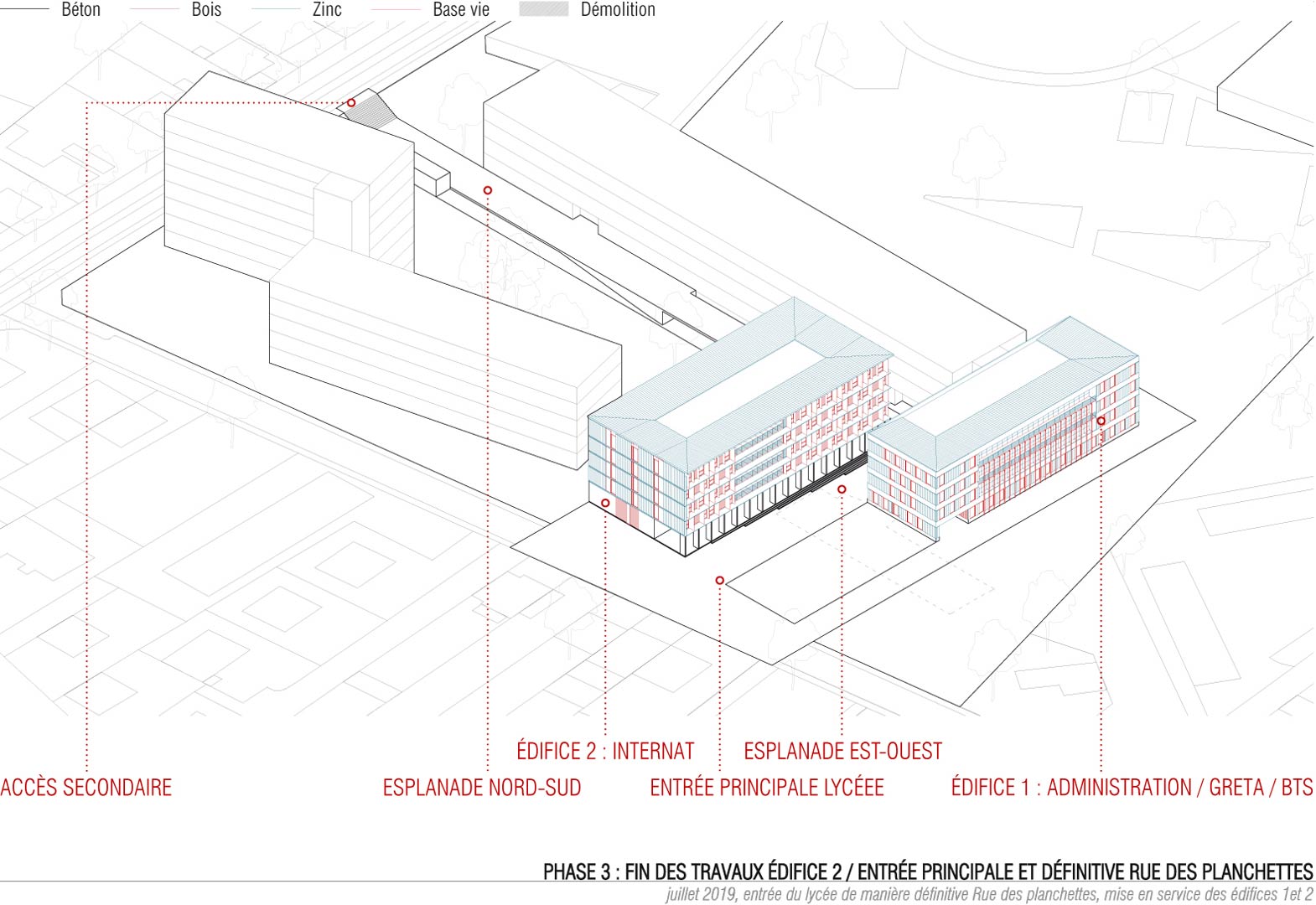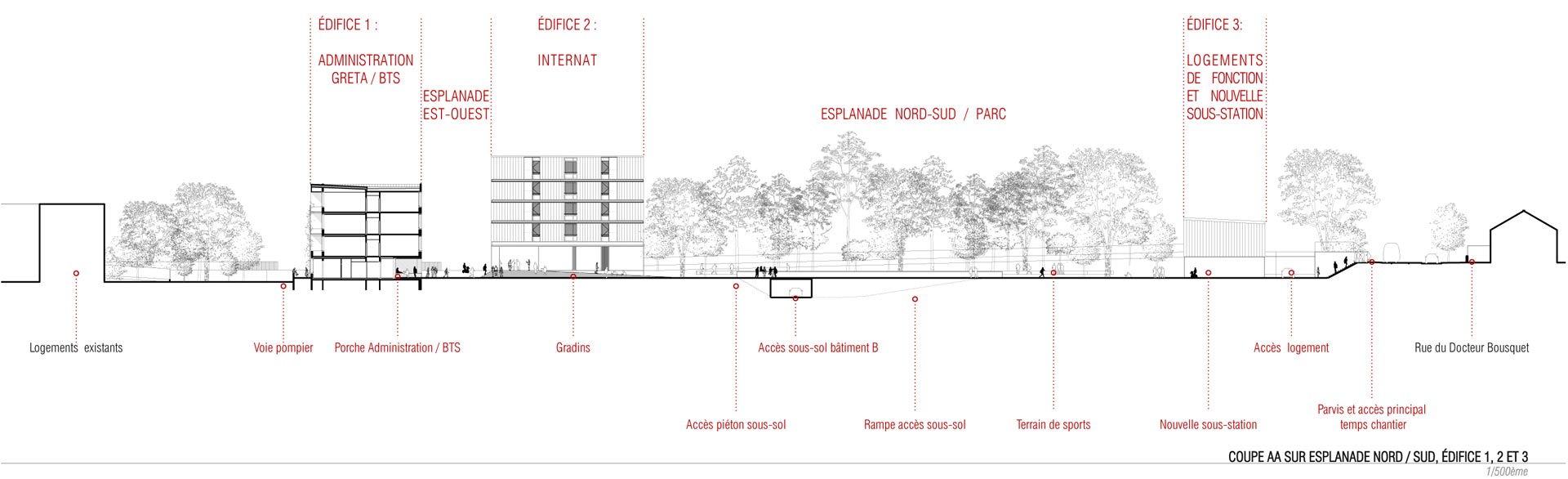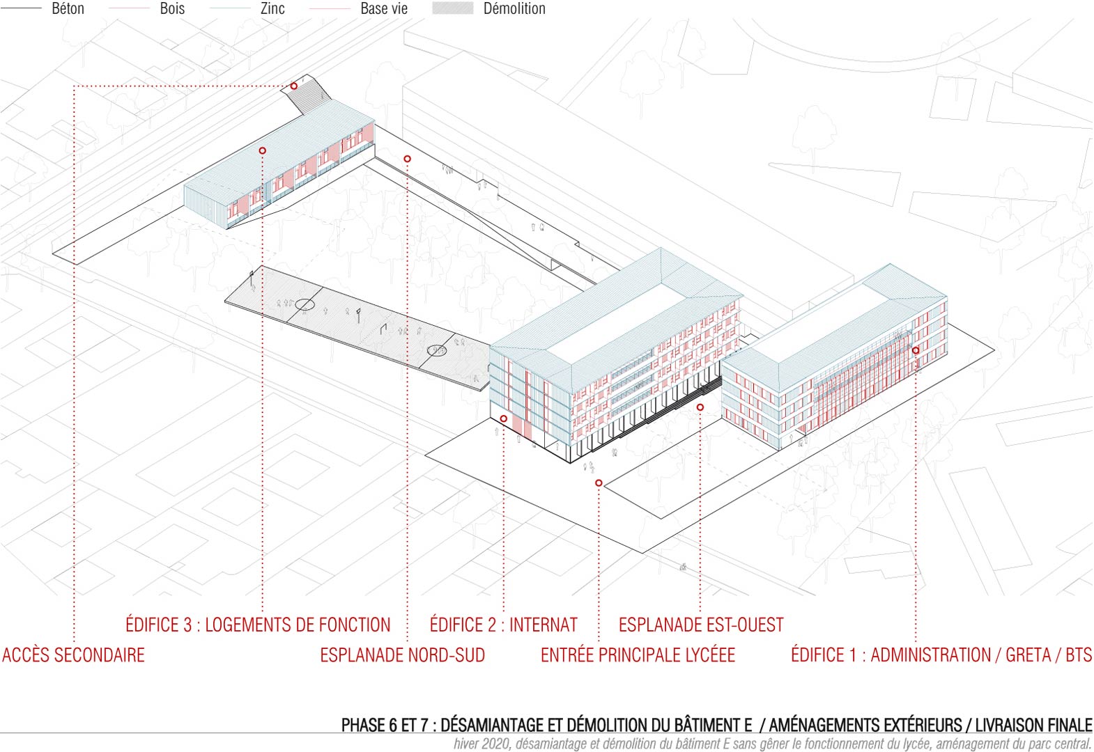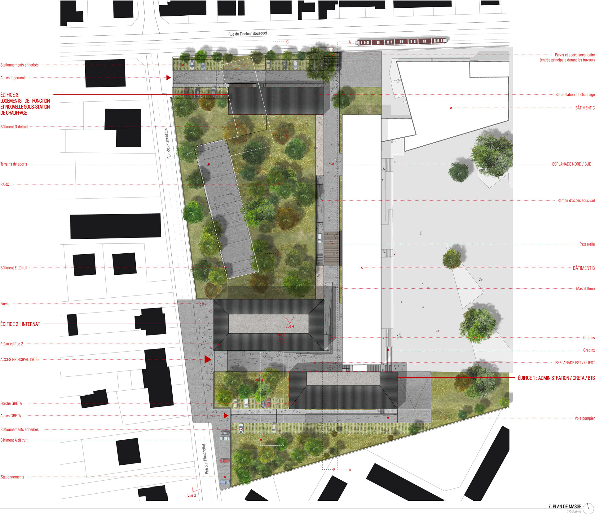 Le projet articule 5 espaces extérieurs et 4 édifices. Une esplanade est aménagée le long du bâtiment B, au pied de la façade ouest. Ce vide linéaire devient un espace de parcours qui structure l’ensemble du projet. L’esplanade relie la rue du Docteur Bousquet desservie par le tramway à l’entrée de l’édifice 1 (administration / BTS / GRETA). Les entrées du bâtiment B s’ouvrent également sur elle. Un deuxième vide fondateur, orienté Est-Ouest, est créé entre l’esplanade précédemment décrite et la rue des Planchettes, sur laquelle est réaménagée l’entrée principale du lycée. Cette 2ème esplanade fabrique le seuil du lycée. Une voie réservée aux véhicules de service et aux habitants des logements de fonction est aménagée au Nord du site. Un accès spécifique piéton et automobile dessert le GRETA au Sud du site. Un parc arboré occupera le vide entre l’internat et les logements de fonction une fois les bâtiments D et E démolis. L’atmosphère recherchée est celle d’un lieu boisé aéré, traversable visuellement et physiquement.