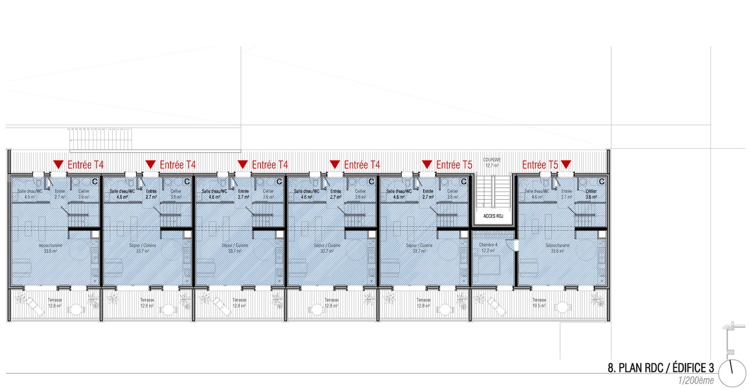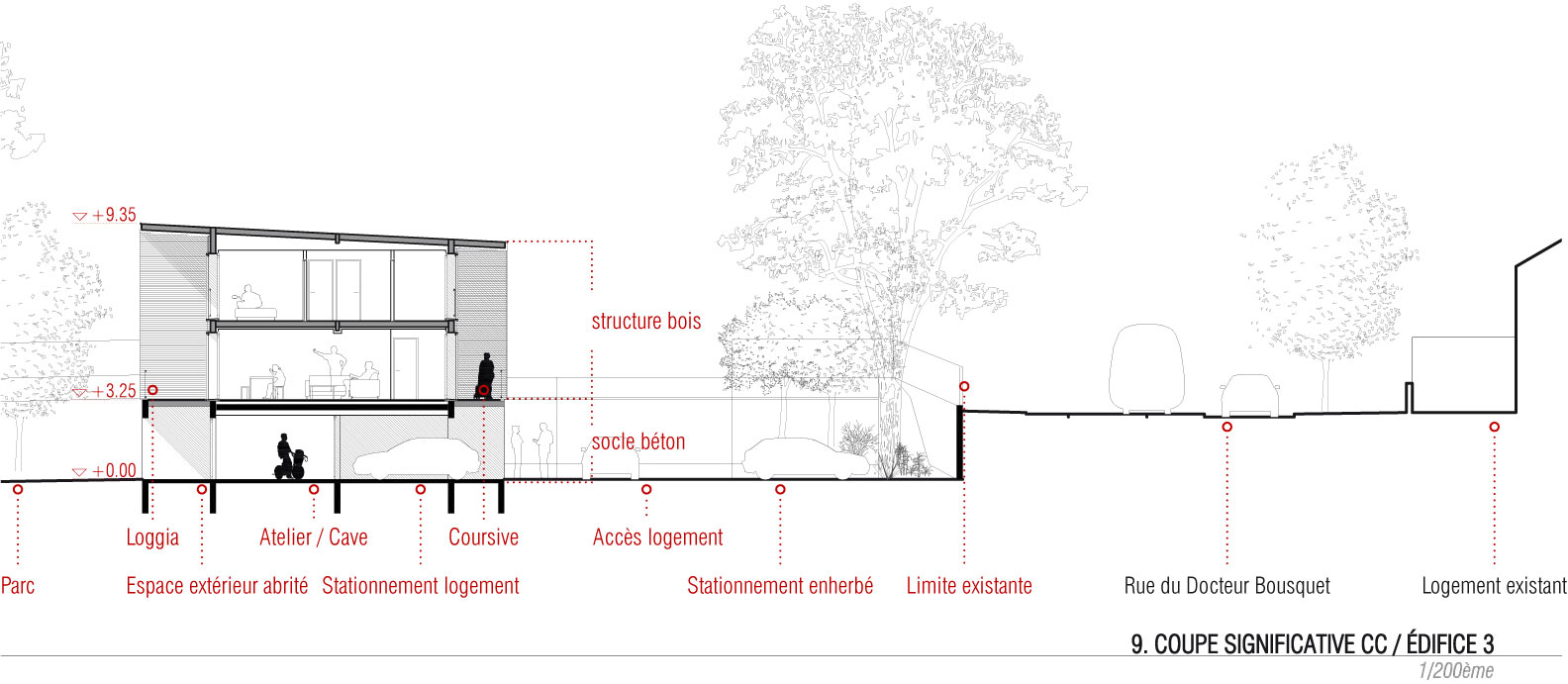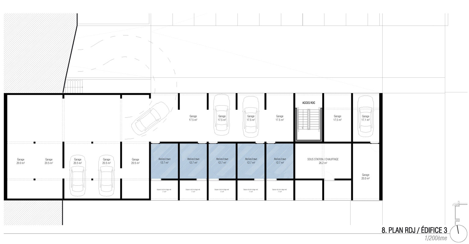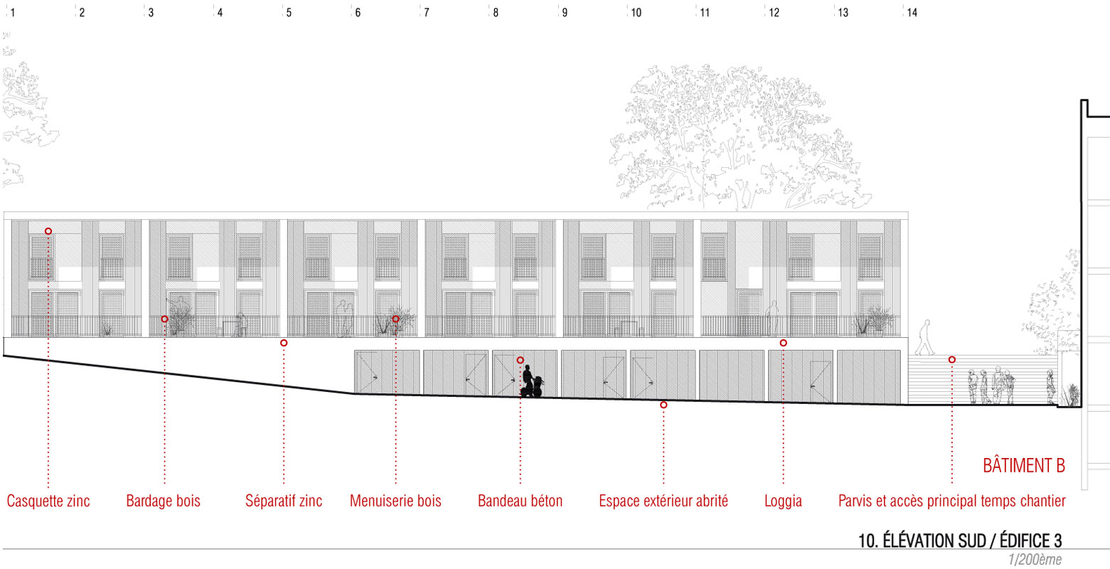 L’édifice 3 abrite les six logements de fonction du lycée (4 T4 et 2 T5). Il occupe le Nord du site. Son implantation, en retrait des autres édifices et ouverts sur le futur parc, garantit l’intimité des logements. Ces derniers sont par ailleurs surélevés par rapport au sol remodelé du parc. Tous en duplex, les logements sont desservis par une coursive depuis l’Ouest du site. L’édifice met à profit la topographie du terrain pour trouver des abris voiture privatifs prolongés par des caves individuelles dans un socle maçonné. La nouvelle chaufferie du lycée est également située dans ce socle ; elle sera construite avant la démolition des bâtiments D et E. Les logements sont conçus selon des dispositifs bioclimatiques simples : compacité, hiérarchie des percements (grandes ouvertures au Sud, plus petites au Nord), plans des logements organisés selon le principe de double enveloppe qui consiste à disposer les espaces principaux au Sud (séjours, chambres) et les espaces secondaires au Nord (entrées, celliers, sanitaires, salles de bain). Des séparatifs entre logements garantissent l’intimité des terrasses extérieures qui prolongent les séjours.