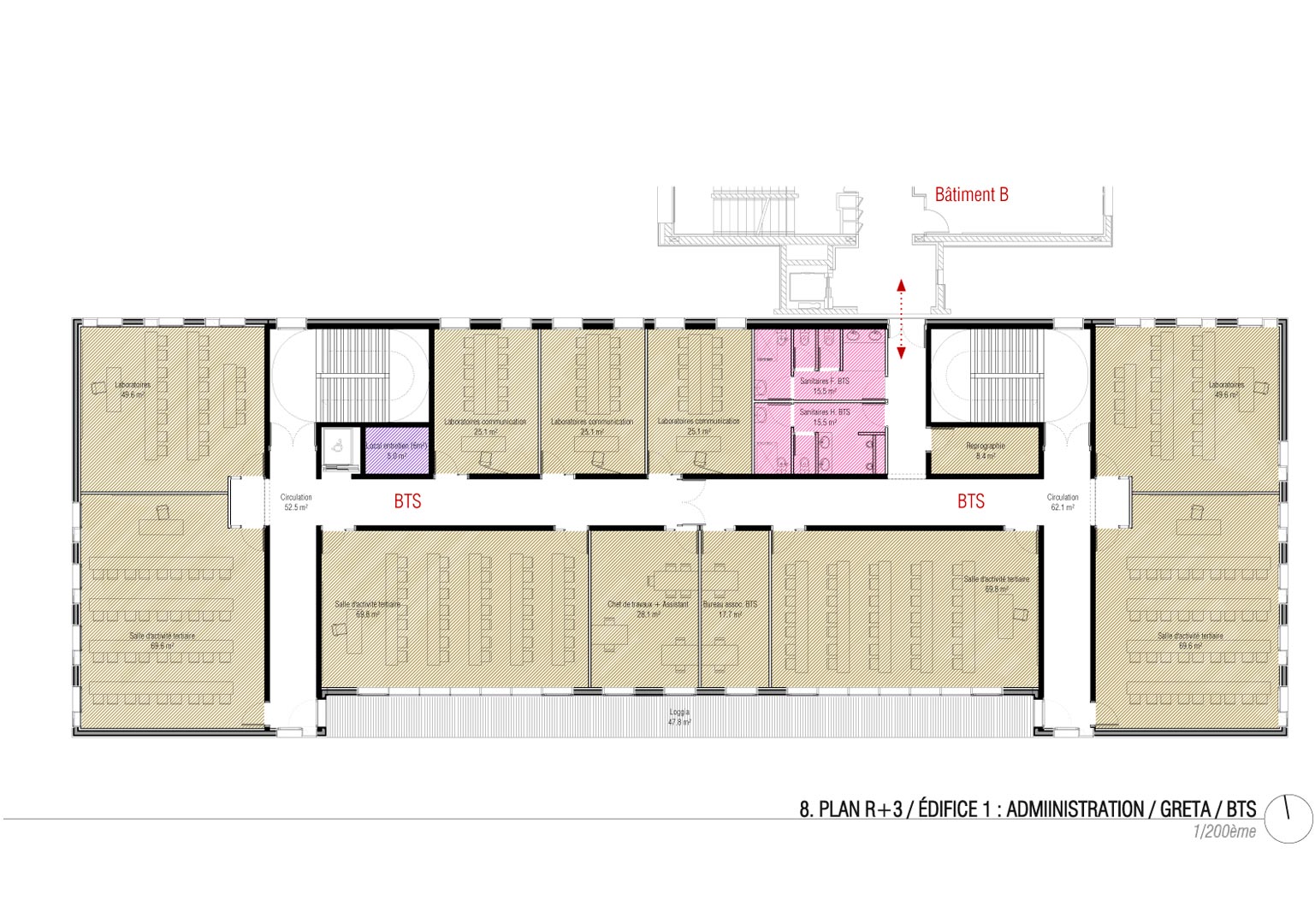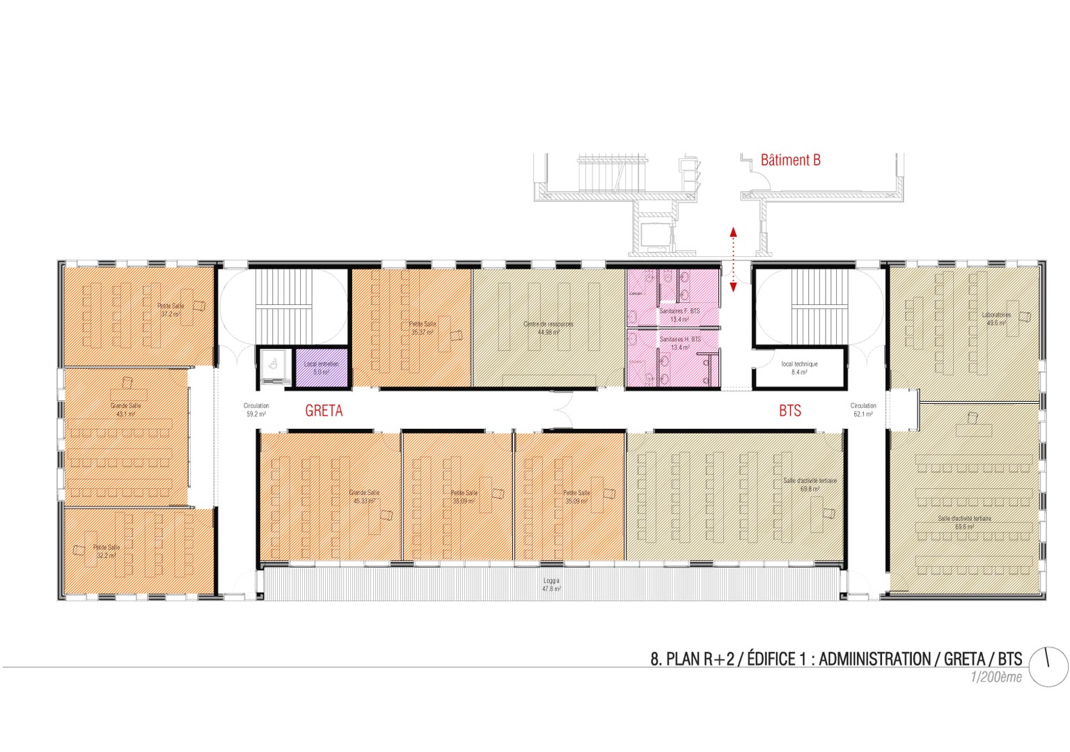 L’édifice 1 regroupe l’administration, le GRETA et les espaces dévolus au BTS. Il est contigu au bâtiment B, considéré comme un tiers du point de vue de la réglementation incendie. Il est implanté orthogonalement au bâtiment B, édifice principal du lycée. Les deux édifices communiquent entre eux pour des questions de commodité : l’ascenseur implanté en pignon du bâtiment B est mutualisé. Toutefois, les portes d’isolement entre les deux bâtiments sont CF 2 heures et à fermeture automatique. Elles ne servent pas à évacuer le public. En effet, chaque édifice dispose de ses propres dégagements pour évacuer les usagers. Les niveaux de plancher de l’édifice sont identiques à ceux du bâtiment B. Située au RDC, l’administration du lycée est accessible facilement depuis l’entrée du lycée. L’entrée de l’administration est précédée d’un porche généreux et constitue l’extrémité Sud de l’esplanade. Le GRETA dispose d’une entrée indépendante en façade Sud. Les bureaux du GRETA sont situés au RDC et sont proches de l’entrée spécifique. Les salles de classe du GRETA se déploient aux deux premiers étages et occupent la partie ouest de l’édifice. Celles du BTS occupent la partie Est au premier et deuxième étage et la totalité du troisième étage. Des loggias se déploient sur la façade Sud, structure habitée proposant un espace extérieur accessible privilégié. Cette structure colonisée par la végétation favorise la protection solaire des salles de classes. Pour des questions de confort d’usage, tous les laboratoires sont orientés au Nord.