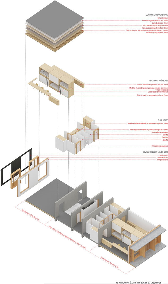Tous orientés plein Sud, les édifices favorisent les apports solaires passifs. Du point de vue structurel, les édifices 1 et 2 assemblent des noyaux en béton et des volumes en bois. L’édifice 3 est également construit en bois. L’architecture massive (en béton) est valorisée par sa pesanteur, sa compacité, son inertie thermique, sa capacité à contreventer les édifices, et sa matérialité. L’architecture filigrane (en bois), quant à elle, recherche la figure contraire : la fabrication d’une lisière artificielle et mouvante ouverte sur le monde. Les structures en bois sont utilisées pour capter le rayonnement solaire et la présence du paysage. Le projet proposé pose la question du devenir des forêts de la région, qui arrivent aujourd’hui à maturité, et de leur exploitation sylvicole. La démarche proposée prend acte de la transformation des paysages et invite à penser que les plantations de la deuxième moitié du XXème siècle, considérées au départ comme un moyen de remplir les vides d’un territoire en perdition, puis comme néfastes pour leur milieu, puissent aujourd’hui être regardées comme une opportunité : opportunité pour construire autrement ; opportunité pour développer une économie locale et exploiter raisonnablement les forêts du territoire ; opportunité pour valoriser le bois d’oeuvre dans la construction, en passant par les activités de première et deuxième transformations du bois récolté. Le projet proposé explore les possibilités offertes par les logiques de circuits courts tant pour ses vertus économiques qu’écologiques.