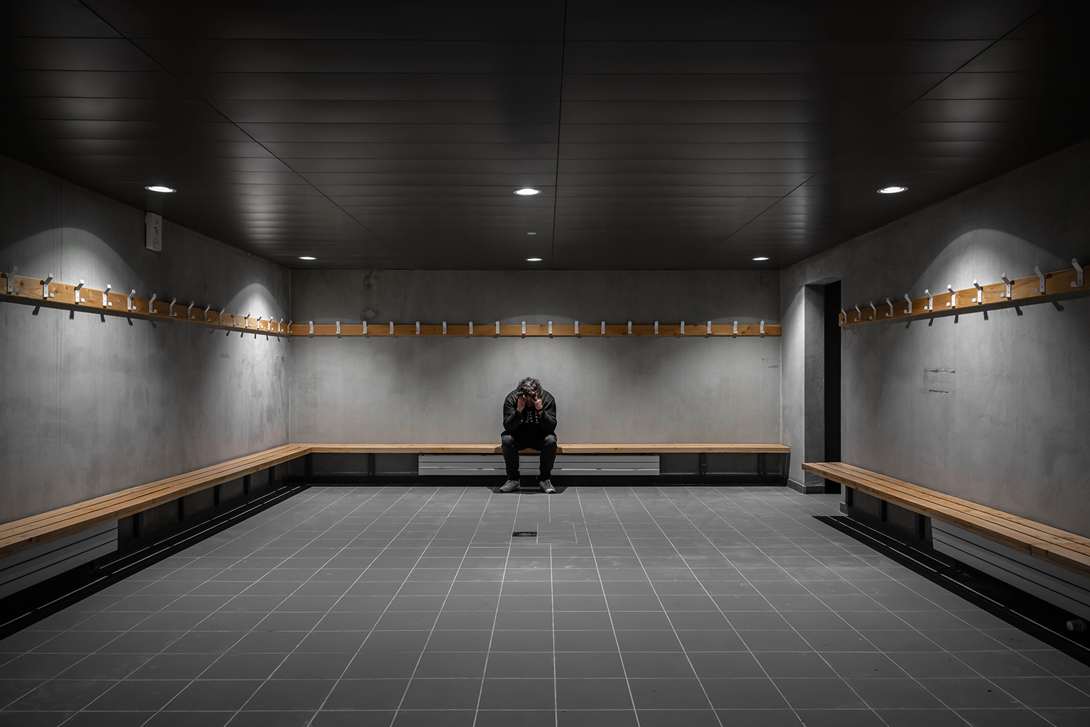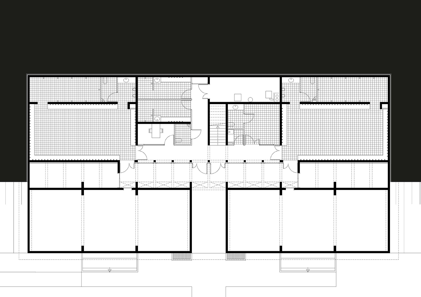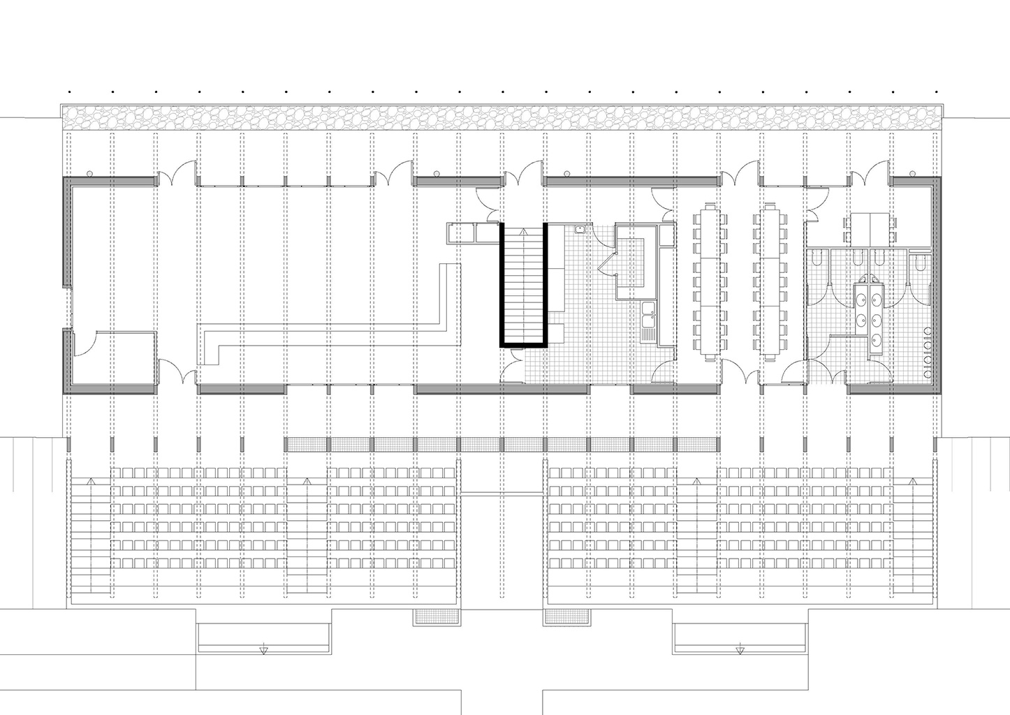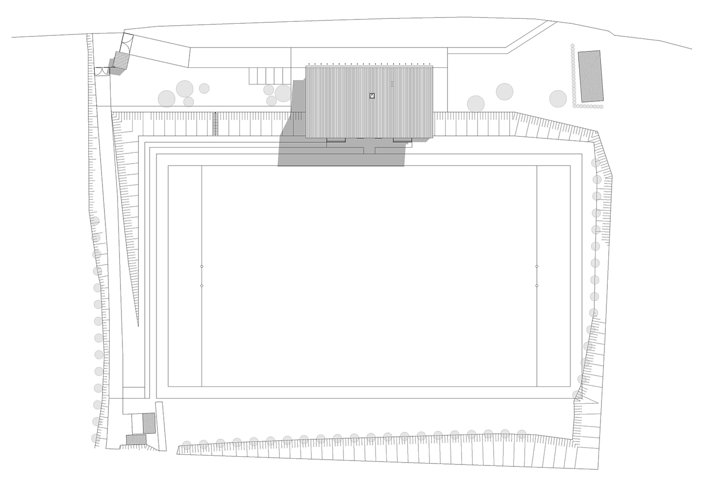 L’édifice est orienté dans le sens des courbes de niveaux, parallèlement au stade. La pente du terrain permet les accès aux deux différents niveaux du bâtiment, au rez-de-chaussée pour l’accès du public aux tribunes et au club-house, et au rez-de-jardin pour les vestiaires et l’accès à la pelouse.