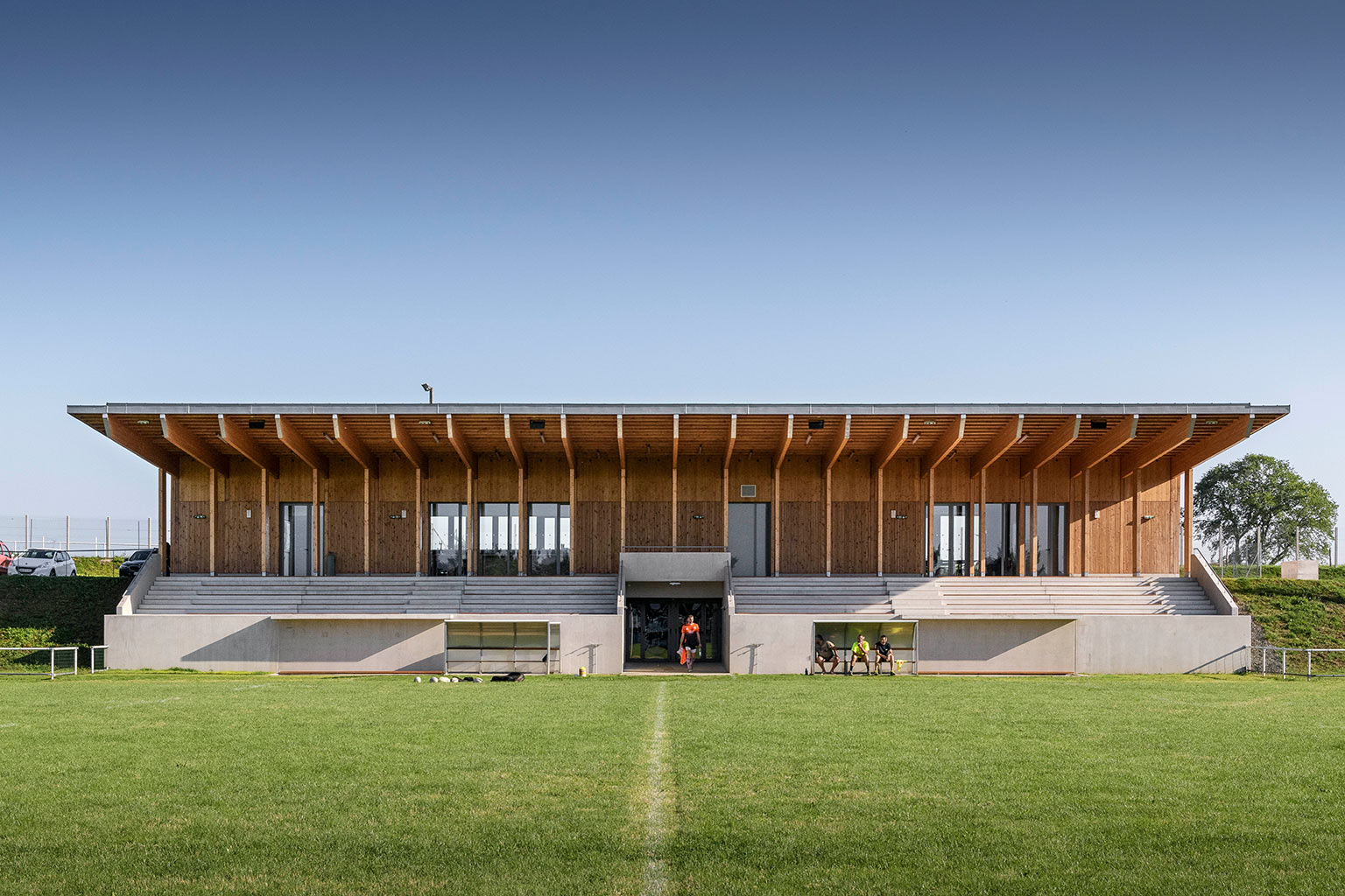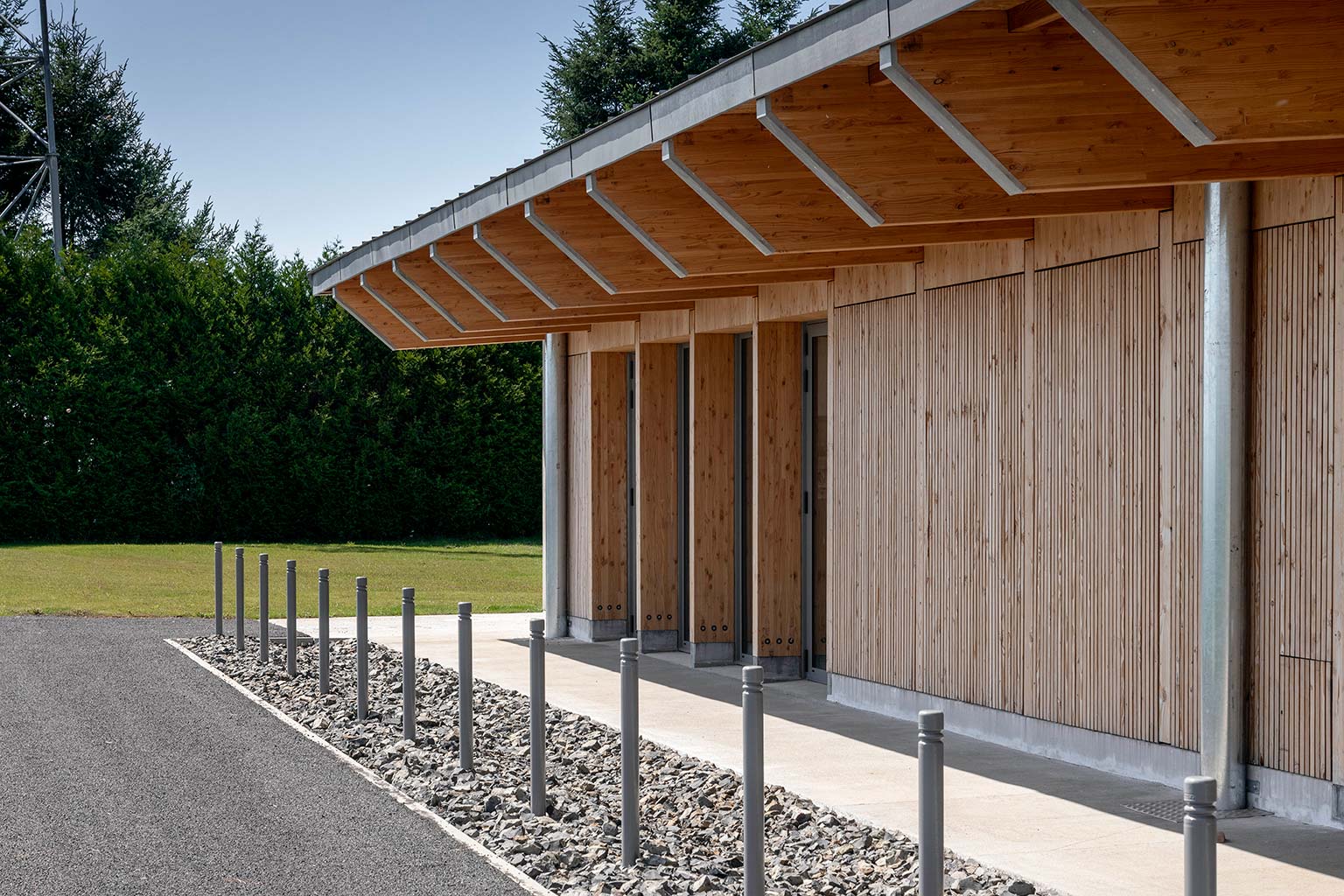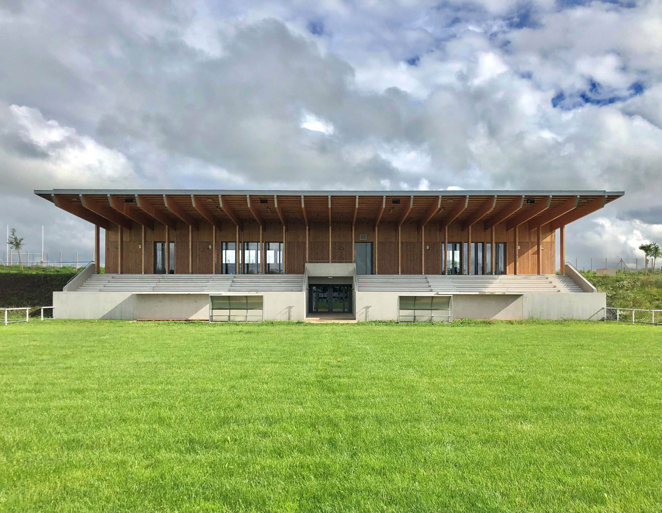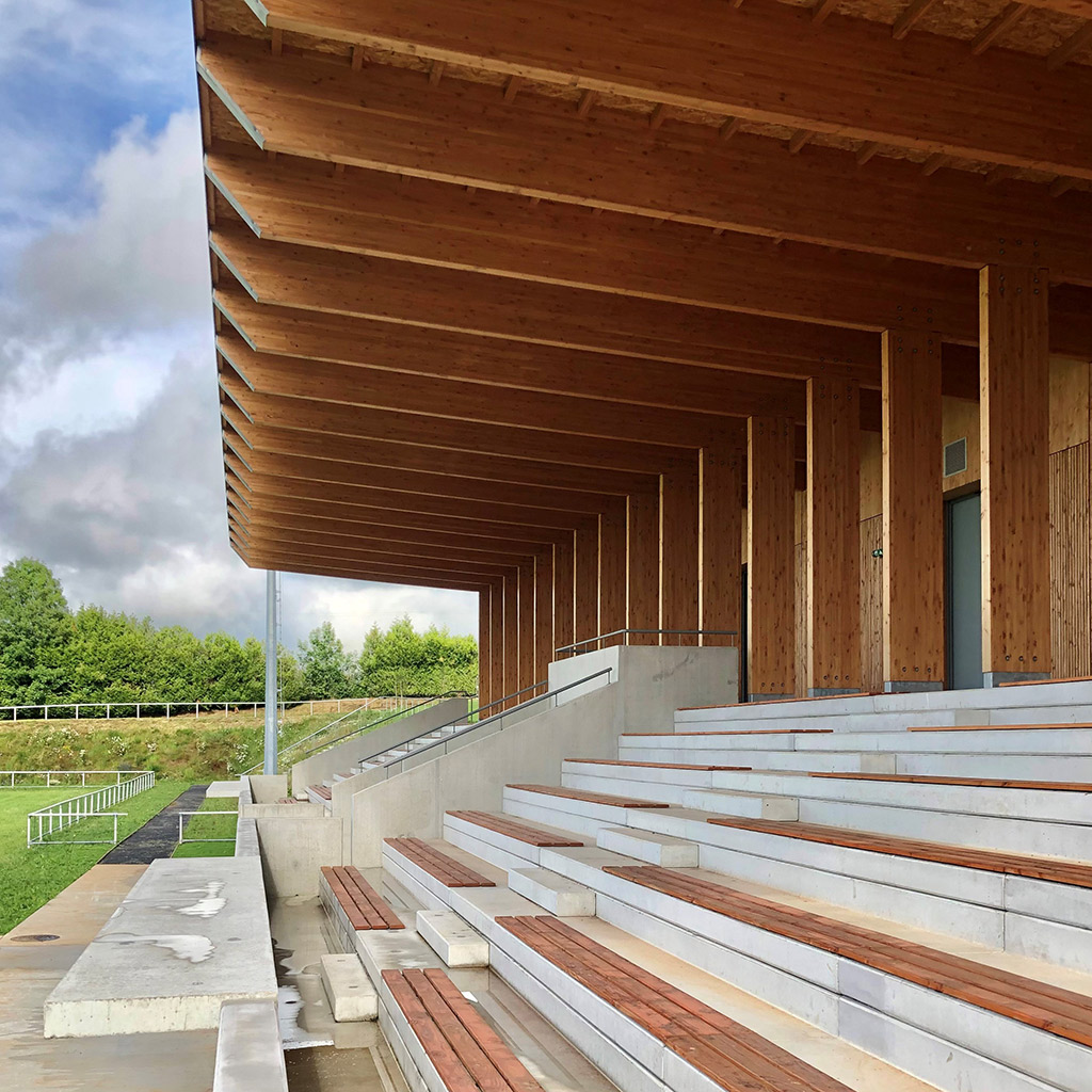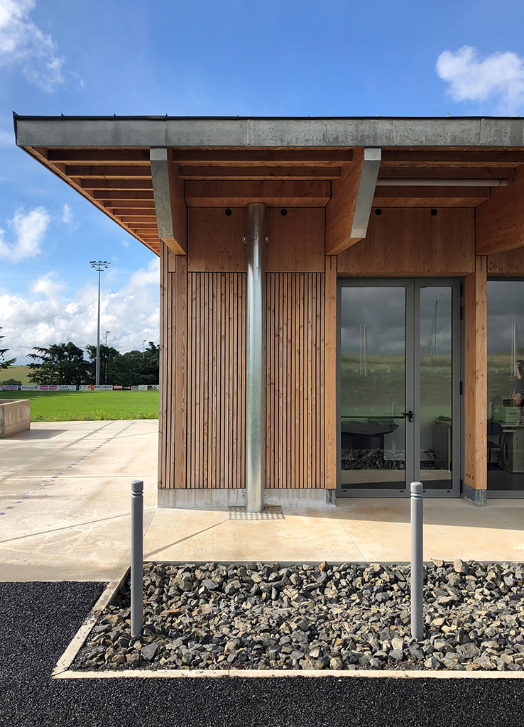La construction est constituée d’un volume simple avec une toiture à un pan débordante pour protéger les tribunes. Les façades du rez-de-chaussée sont couvertes d’un bardage bois ajouré surmonté de panneaux de trois-plis protégé par les débords de toiture. Ces débords permettent l’expression de la trame structurelle du bâtiment en lamellé-collé. Les ouvertures, toutes identiques, suivent les dimensions de cette trame et sont disposées de manière à répondre aux usages intérieurs. Les façades du rez-de-jardin sont construites en béton restant apparent. Ce socle permet un ancrage dans la pente du terrain.