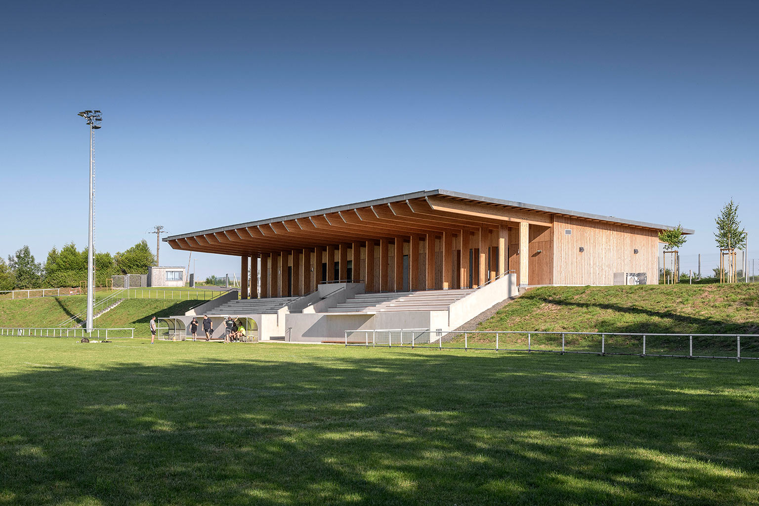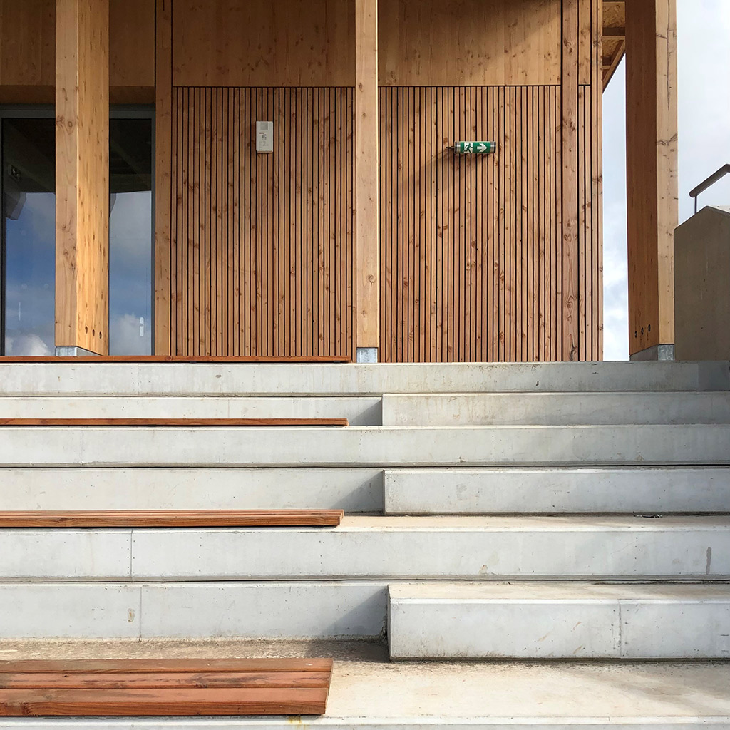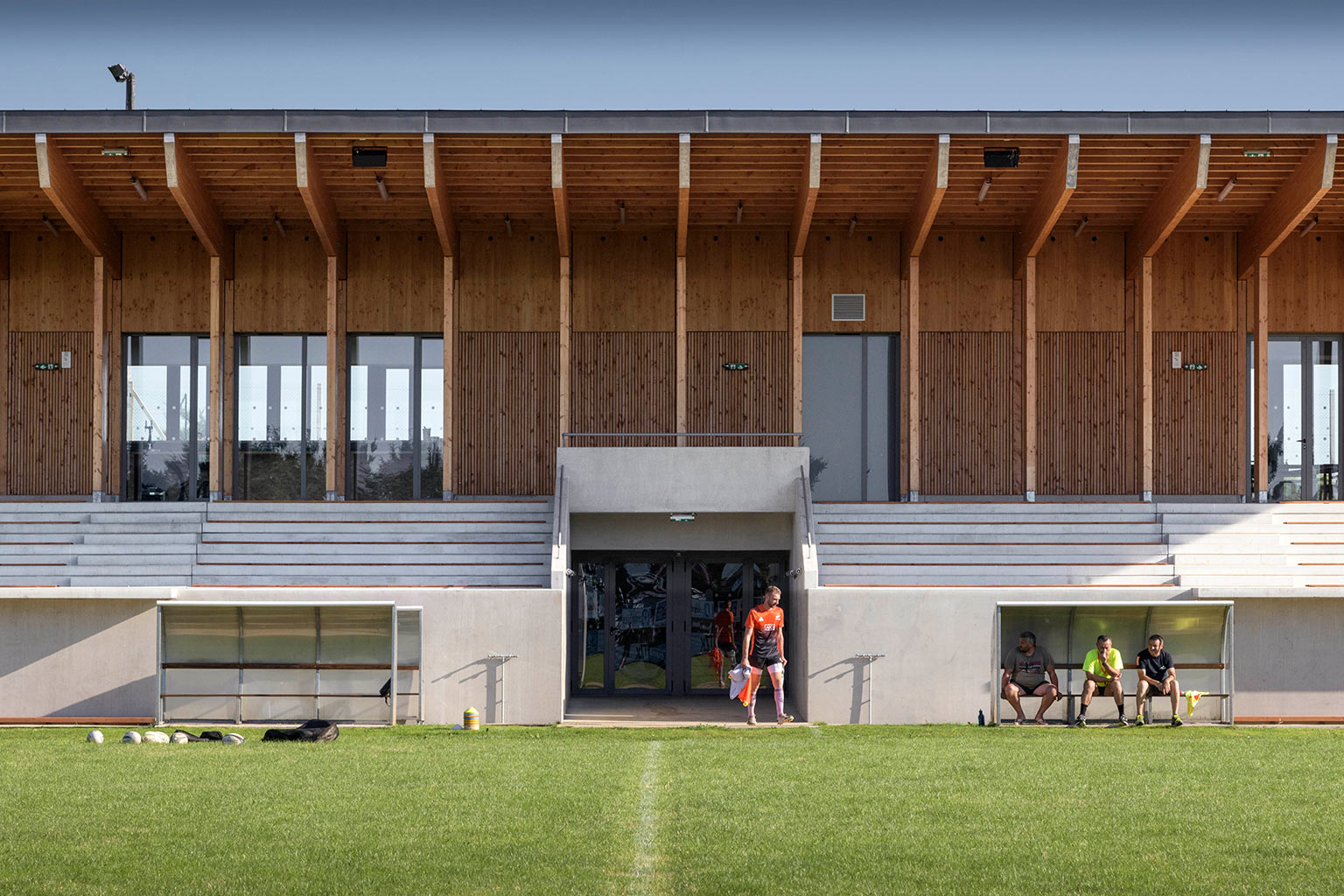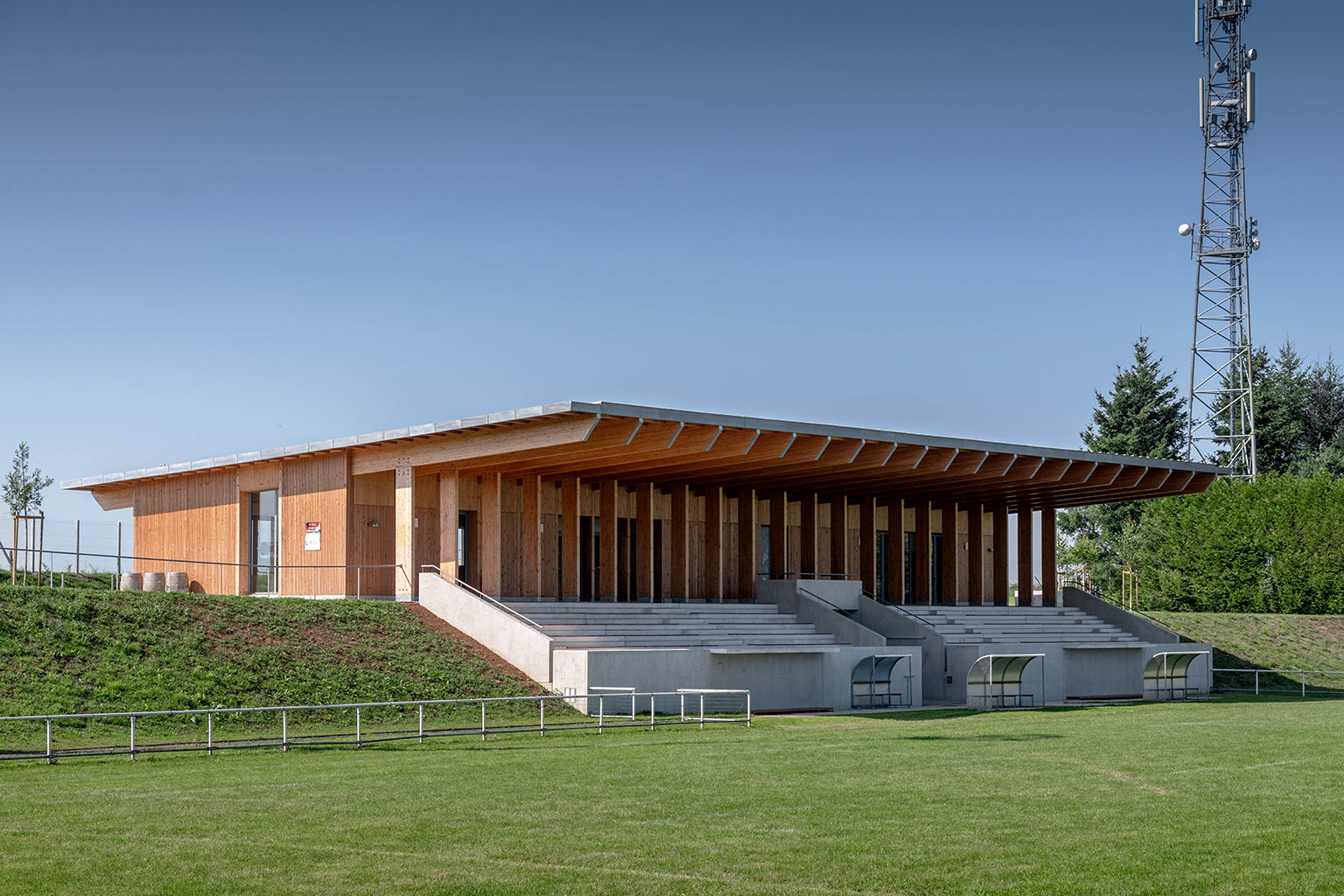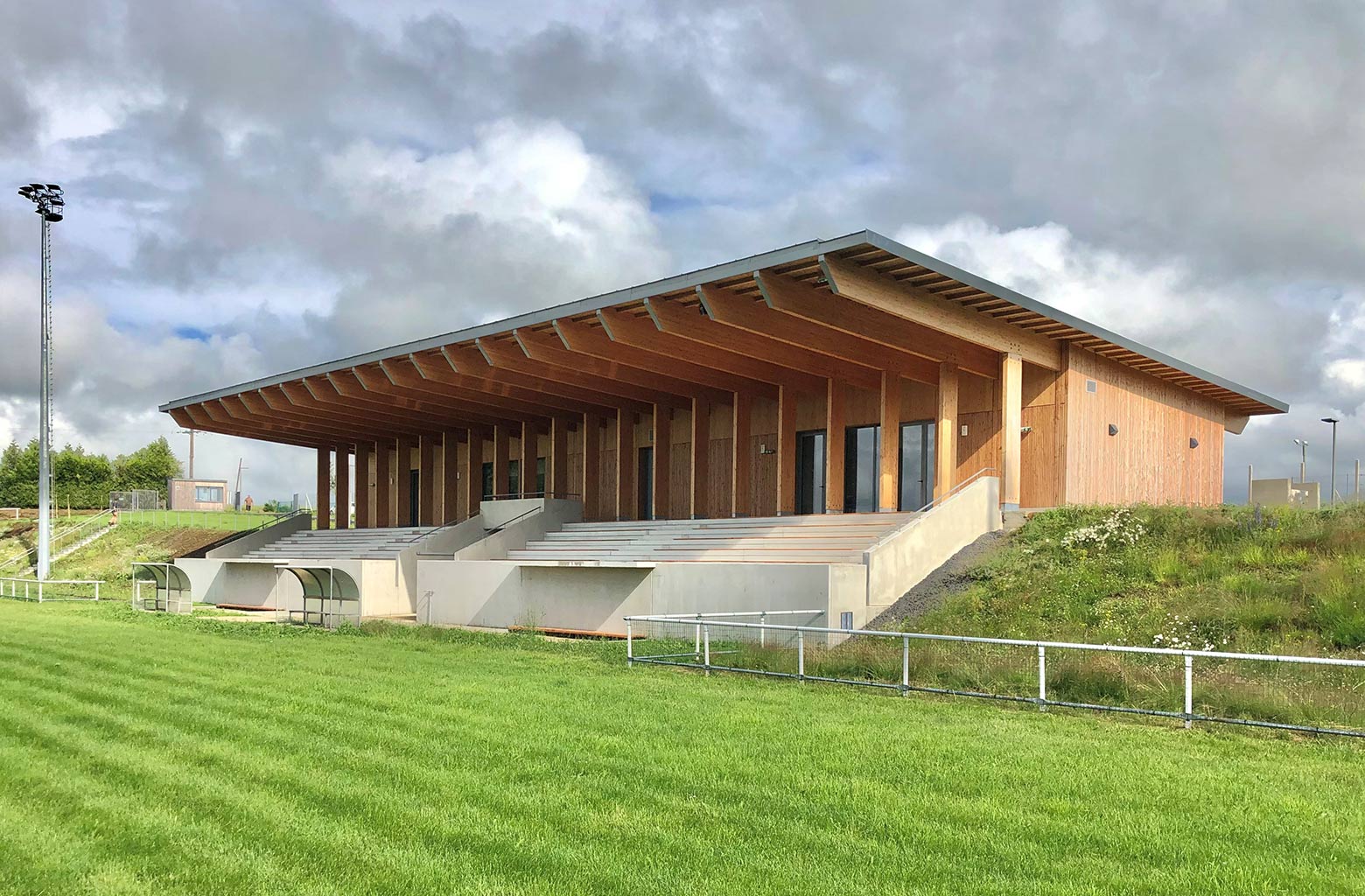 La construction est constituée d’un volume simple avec une toiture à un pan débordante pour protéger les tribunes. Les façades du rez-de-chaussée sont couvertes d’un bardage bois ajouré surmonté de panneaux de trois-plis protégé par les débords de toiture. Ces débords permettent l’expression de la trame structurelle du bâtiment en lamellé-collé. Les ouvertures, toutes identiques, suivent les dimensions de cette trame et sont disposées de manière à répondre aux usages intérieurs. Les façades du rez-de-jardin sont construites en béton restant apparent. Ce socle permet un ancrage dans la pente du terrain.