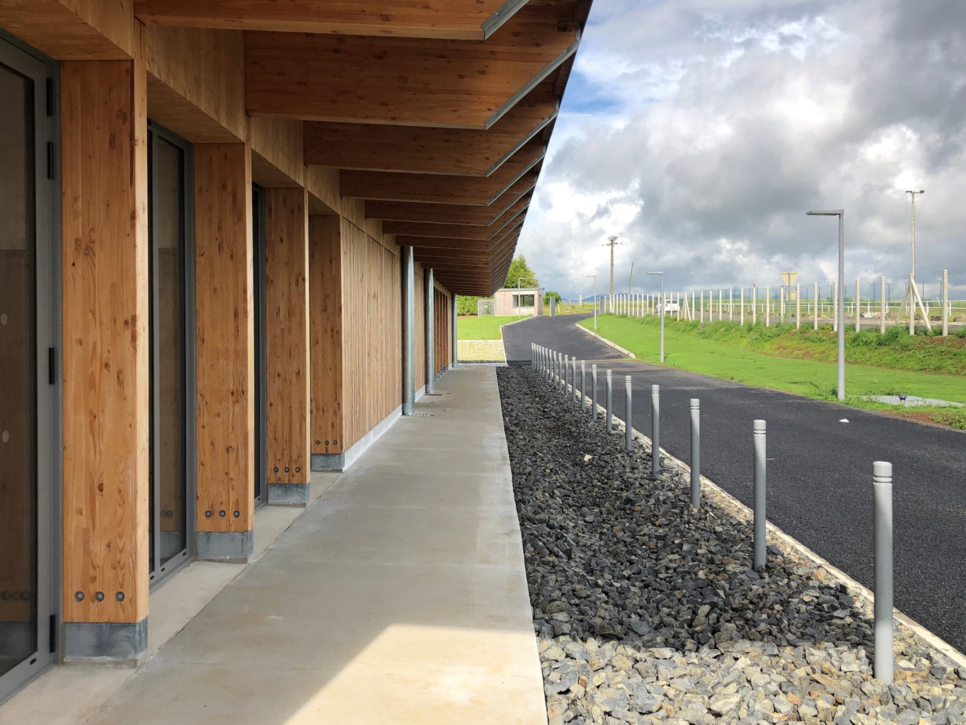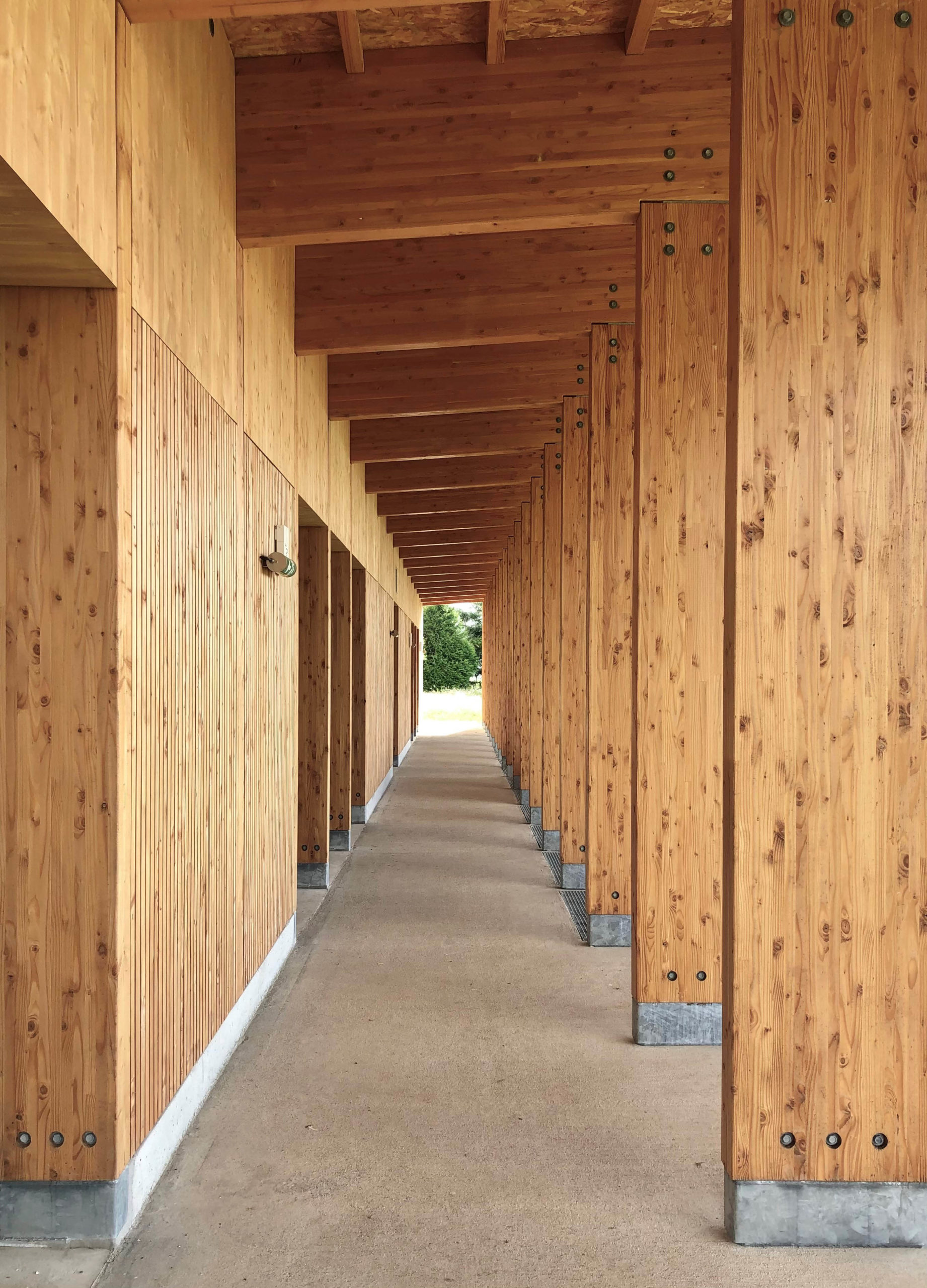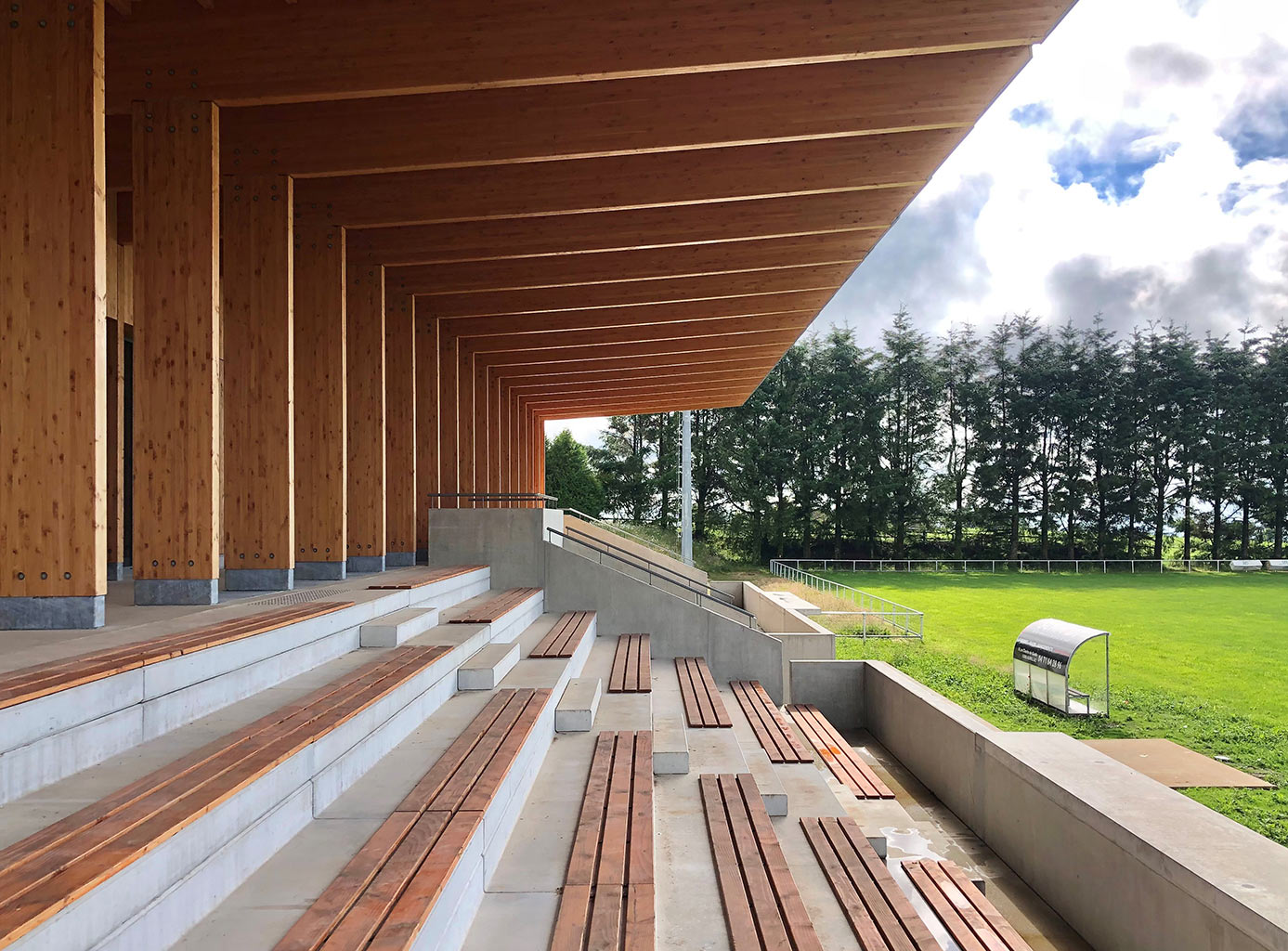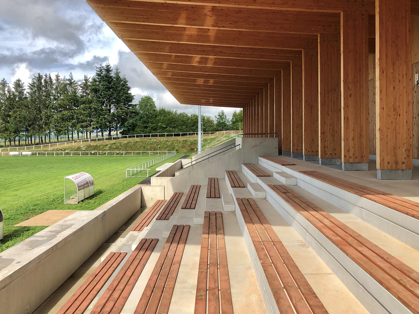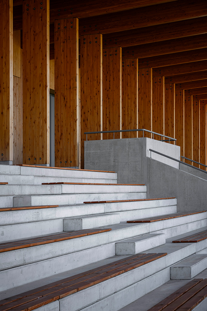 La construction est constituée d’un volume simple avec une toiture à un pan débordante pour protéger les tribunes. Les façades du rez-de-chaussée sont couvertes d’un bardage bois ajouré surmonté de panneaux de trois-plis protégé par les débords de toiture. Ces débords permettent l’expression de la trame structurelle du bâtiment en lamellé-collé. Les ouvertures, toutes identiques, suivent les dimensions de cette trame et sont disposées de manière à répondre aux usages intérieurs. Les façades du rez-de-jardin sont construites en béton restant apparent. Ce socle permet un ancrage dans la pente du terrain.