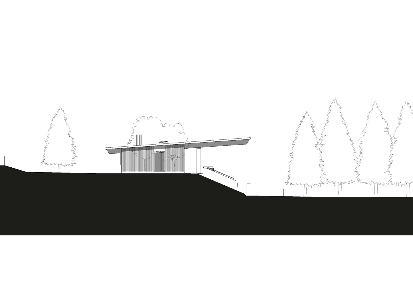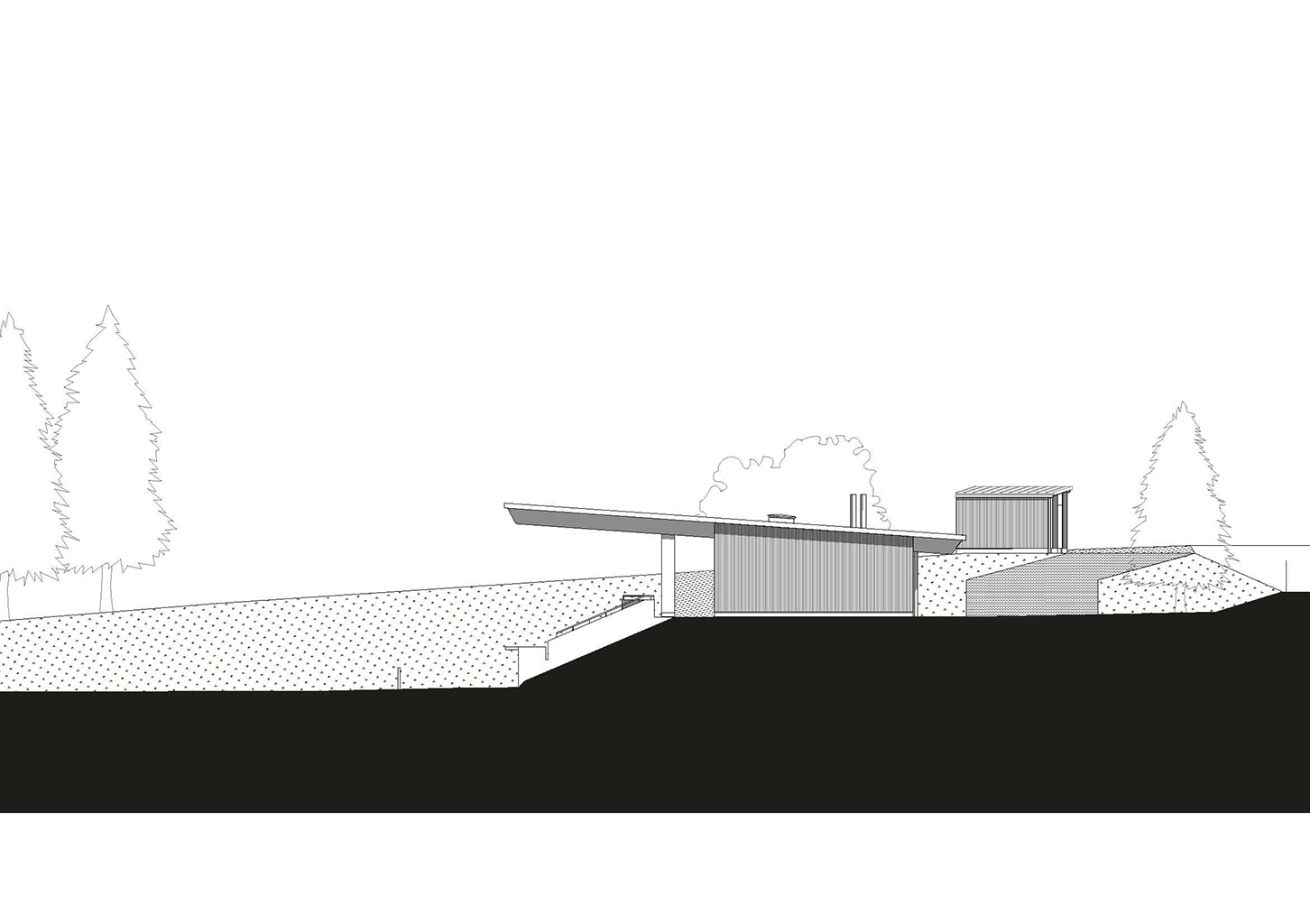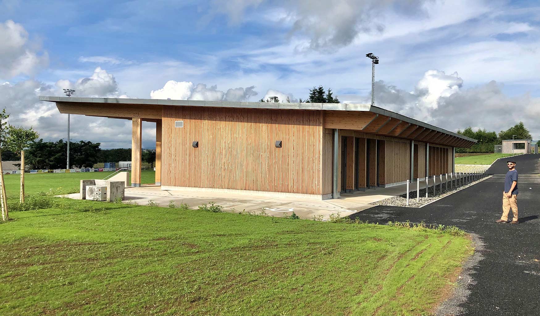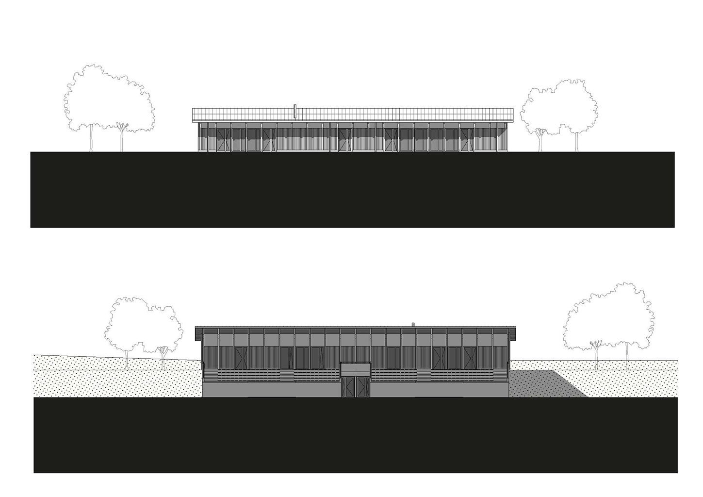 La construction est constituée d’un volume simple avec une toiture à un pan débordante pour protéger les tribunes. Les façades du rez-de-chaussée sont couvertes d’un bardage bois ajouré surmonté de panneaux de trois-plis protégé par les débords de toiture. Ces débords permettent l’expression de la trame structurelle du bâtiment en lamellé-collé. Les ouvertures, toutes identiques, suivent les dimensions de cette trame et sont disposées de manière à répondre aux usages intérieurs. Les façades du rez-de-jardin sont construites en béton restant apparent. Ce socle permet un ancrage dans la pente du terrain.
