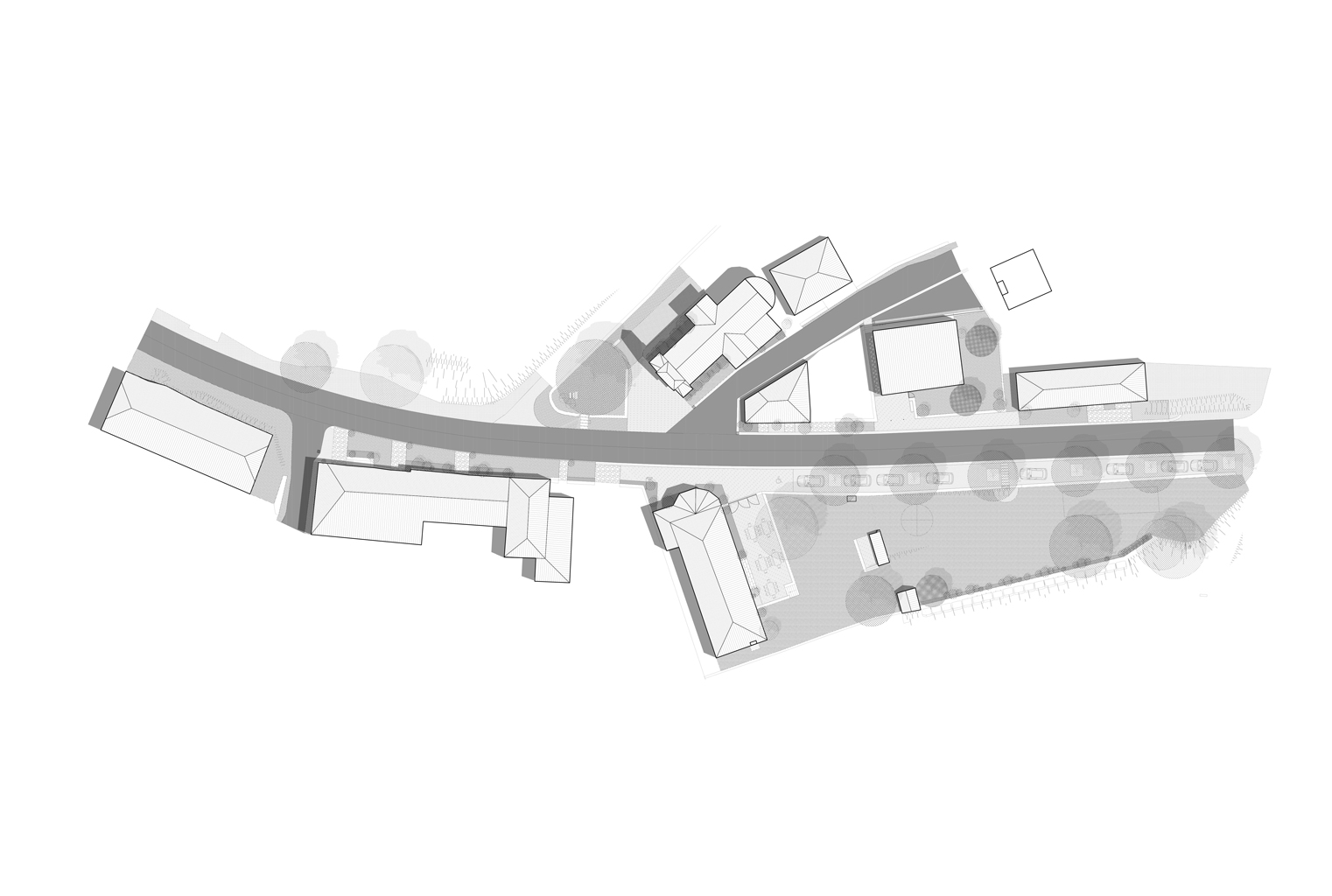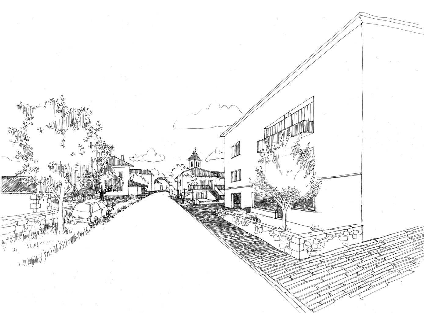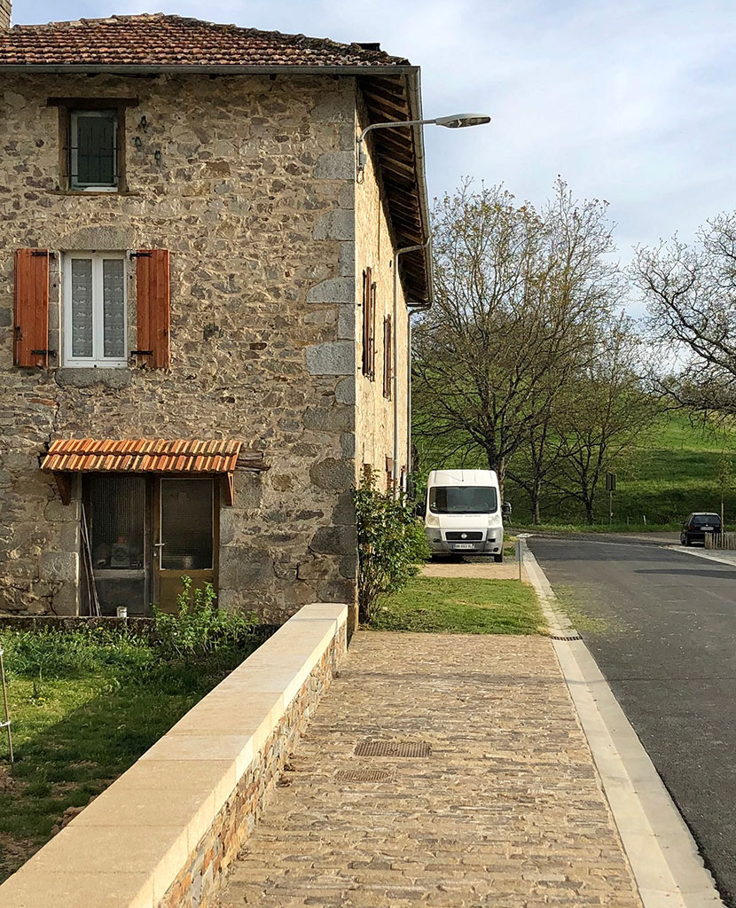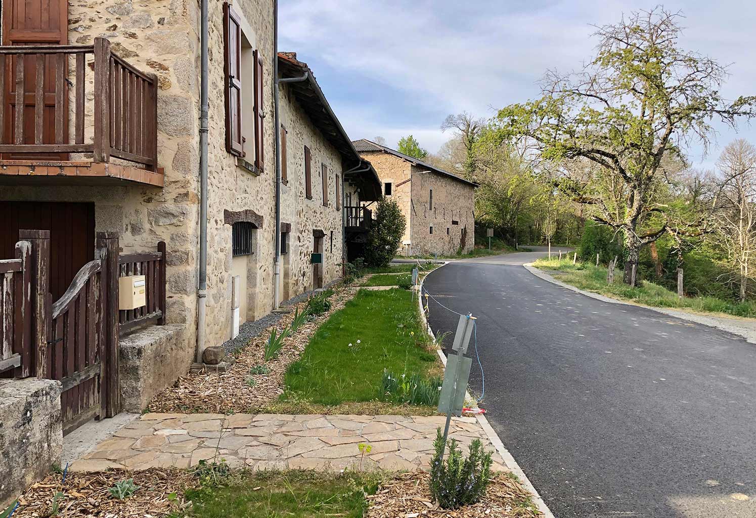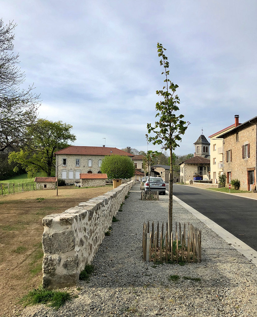 Le projet consiste à redessiner la traverse en réduisant l’emprise de la bande roulante, à qualifier les accotements libérés pour rendre plus attractifs les pieds de façade, à organiser le stationnement des véhicules et à offrir un parvis à l’église, la mairie et l’ancienne école transformée en salle polyvalente. L’aménagement de seuils plantés valorise le bâti, mettant à distance l’espace privé du trafic motorisé, considérablement réduit. Le projet a aussi permis de créer un jardin au pied de l’ancien hôtel-restaurant transformé par la commune en logements locatifs. Sobres, les sols et les murets sont réalisés en granite, schiste et gneiss, matières que l’on retrouve dans le sous-sol de la Chataigneraie cantalienne. Une figure arborée prend place dans la traverse du village sous la forme d’un alignement d’érables.