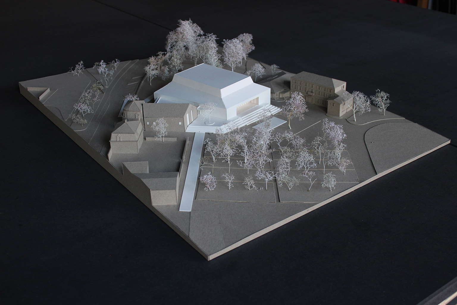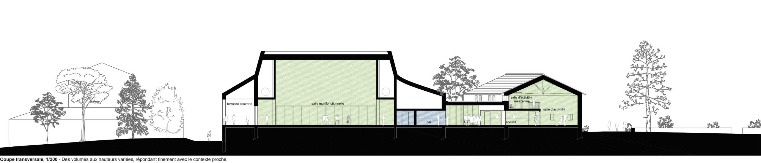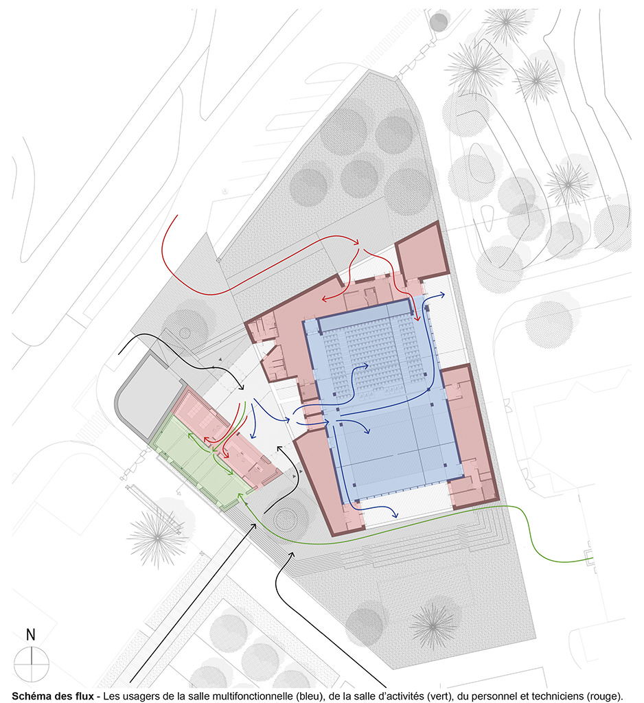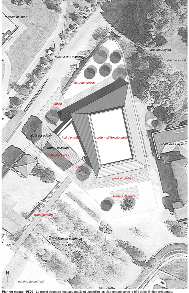 Le projet proposé vise à tirer parti des atouts du site tout en le structurant. L’ensemble bâti se tourne à la fois vers l’avenue du Château et vers le parc qui comprend de nombreux équipements et usages (école, maison de retraite, piscine, terrains de pétanque). L’enjeu consiste à ce que ce nouvel équipement, structurant à l’échelle de la commune, puisse contribuer à l’animation des deux. Par ailleurs, le double adressage est cohérent avec les flux des futurs usagers. Les flux extérieurs sont distingués pour éviter les conflits d’usages. Ainsi, les enfants de l’école peuvent se rendre directement depuis l’école vers la salle d’activité sans croiser le moindre véhicule motorisé. Au nord, une cour de service permet de cantonner les manœuvres des véhicules de service en dehors du périmètre strict du parvis.
