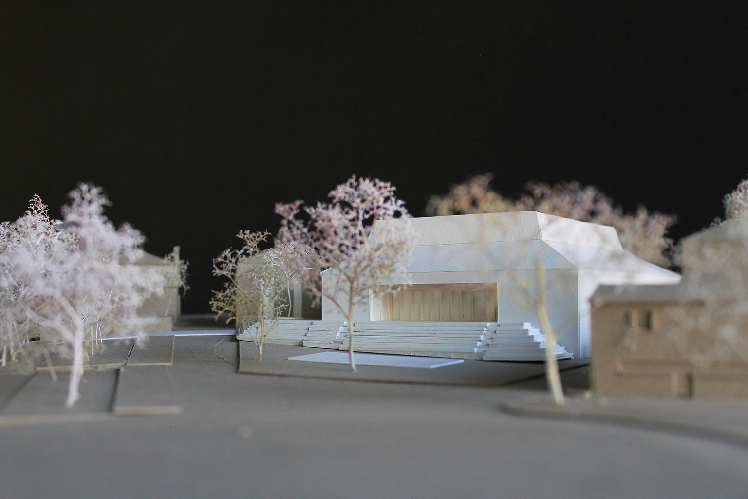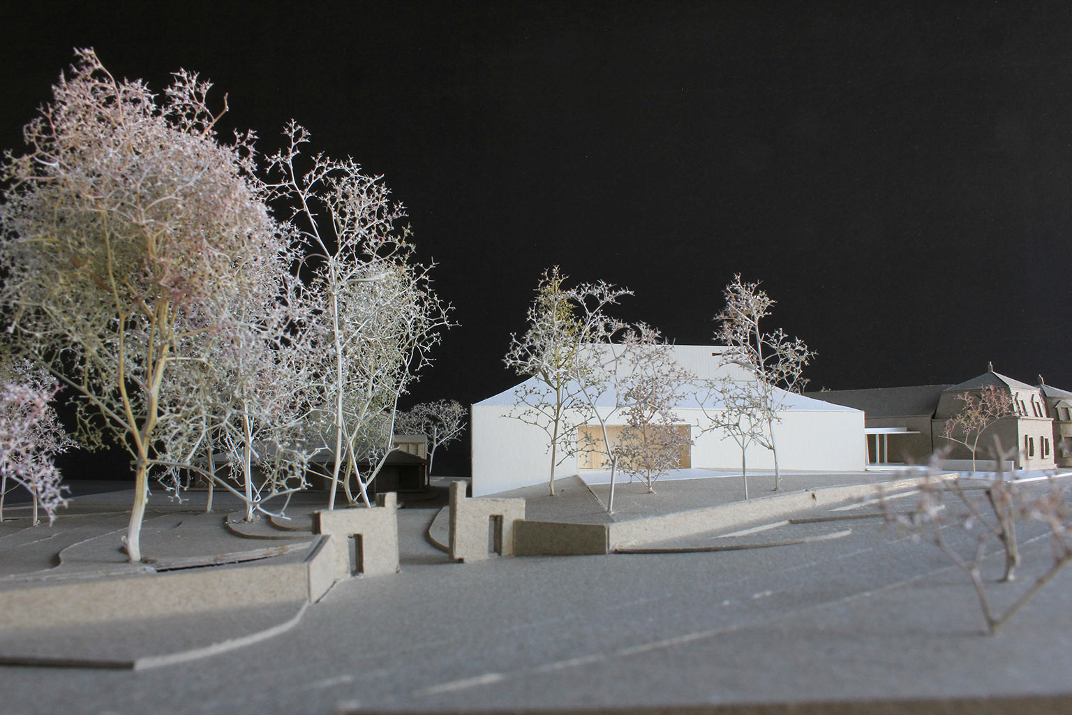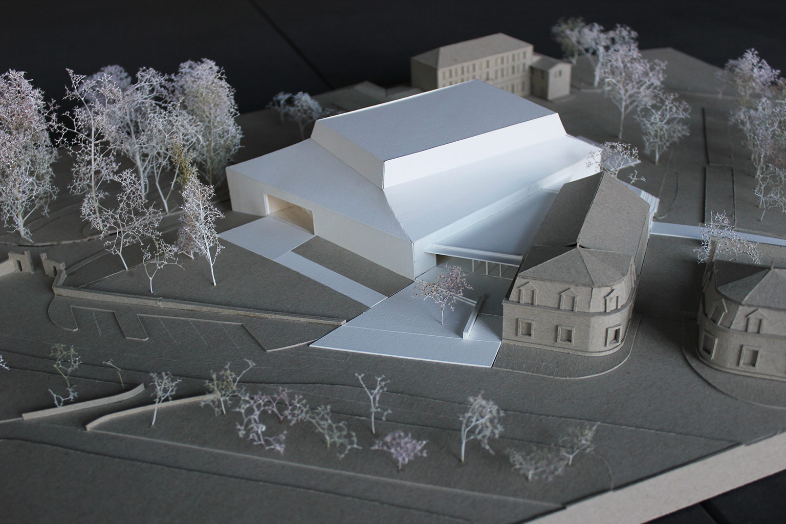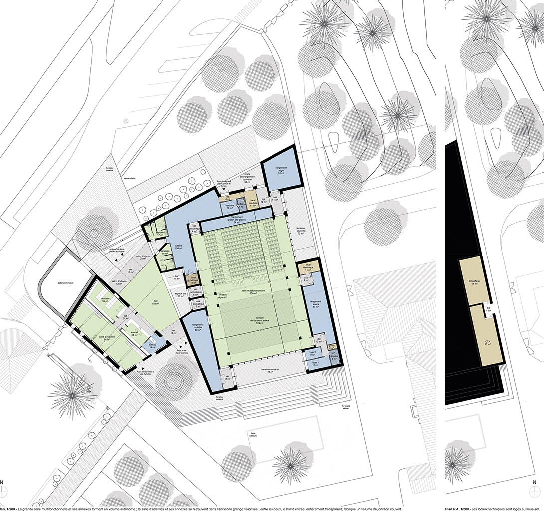 La répartition du programme est immédiatement lisible en plan et en volume. La grande salle multifonctionnelle et ses annexes forment un volume autonome, sa toiture fait référence aux deux pavillons d’entrée du parc, symétriques, lesquels sont caractérises par des toitures mansardées originellement couvertes en ardoises.