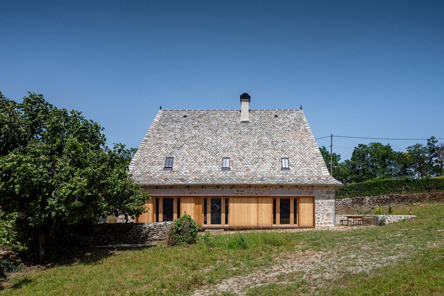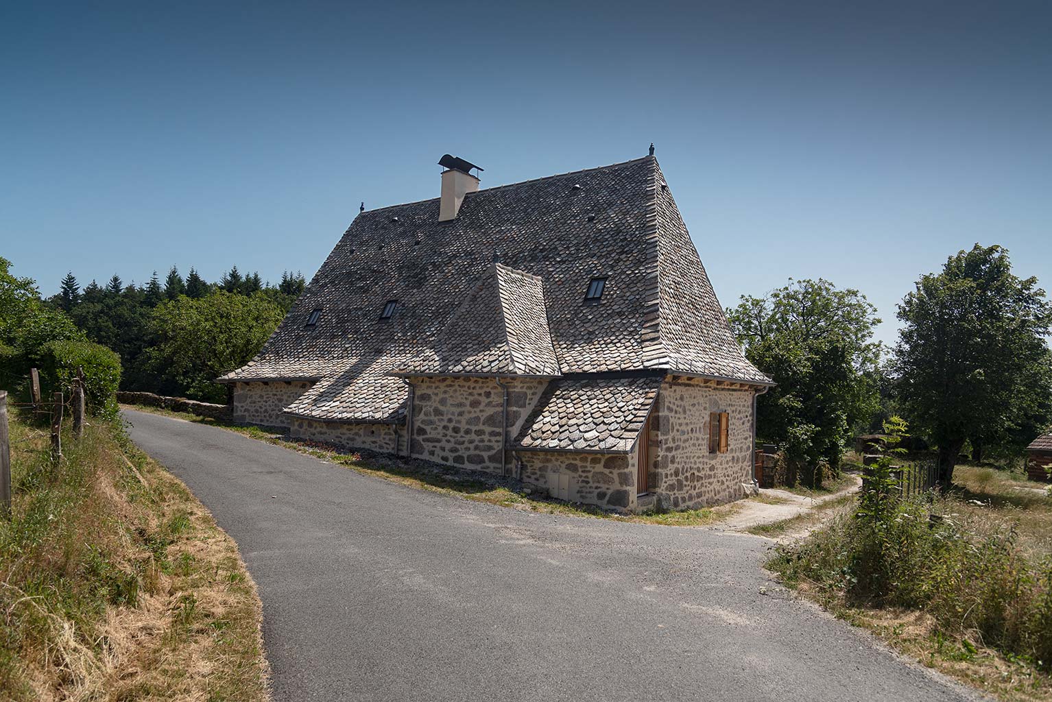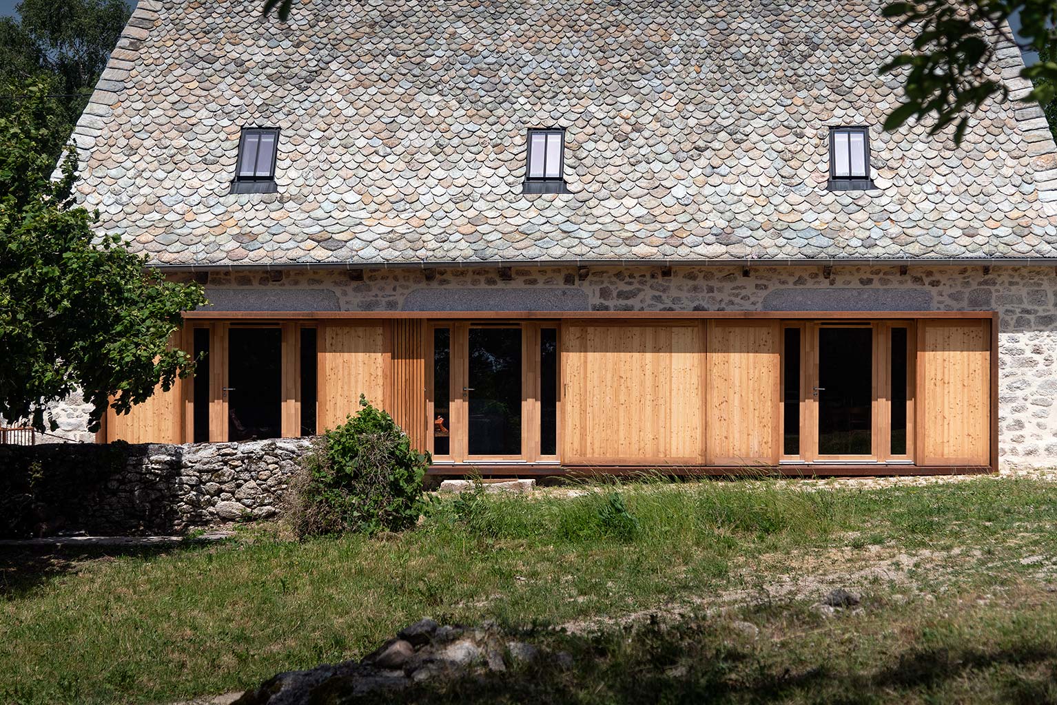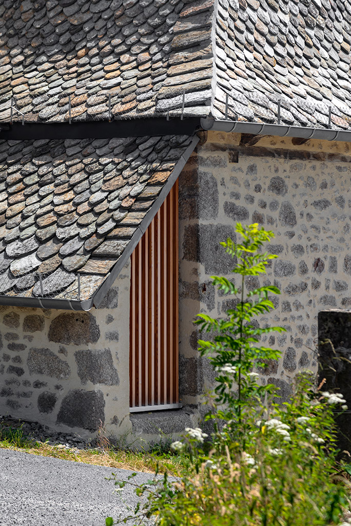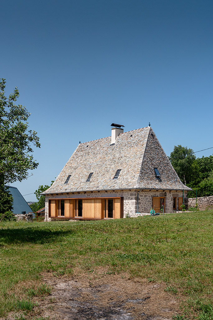 Le projet consiste en la réhabilitation d’une maison traditionnelle de la Chataigneraie Cantalienne. Dépourvue de tout confort, la maison a fait l’objet d’une transformation lourde. La toiture traditionnelle en lauzes de schiste a été entièrement déposée et refaite selon les savoir-faire locaux, encore très vivaces. Plutôt que de percer le toit pour trouver de nouveaux apports en lumière naturelle, nous avons choisi de percer la façade sud généreusement. Un cadre en acier recompose la façade et regroupe en un seul dispositif plusieurs baies ainsi que des volets coulissants en mélèze. A l’intérieur, les planchers en bois ont été consolidés selon un assemblage moisé de solives en chêne. Les anciens parquets en chêne ont été conservés en place et constituent aujourd’hui le plafond des pièces du rez-de-chaussée. Les nouveaux parquets sur lambourdes ont été réalisé en châtaignier, essence locale par excellence. Une isolation en ouate de cellulose, interposée entre les deux parquets, améliore la performance acoustique entre les niveaux. Les murs intérieurs ont été doublé avec un enduit épais en chanvre et chaux. A l’extérieur, les façades en moellons de granite ont été rejointoyées avec un enduit traditionnel à la chaux de Saint Astier. Ainsi la perspirance des murs est-elle garantie. La charpente existante et les cloisons sont isolés avec des isolants biosourcés en fibre de bois et chanvre. Les techniques traditionnelles et alternatives ont été mises au service des enjeux contemporains : performance de l’enveloppe, confort thermique et hygrométrique, confort visuel, valorisation des ressources et des savoir-faire locaux, logiques de circuits-courts.