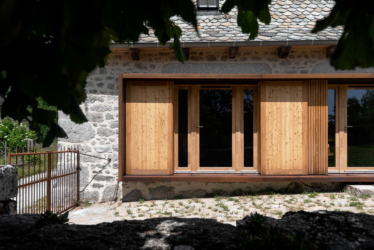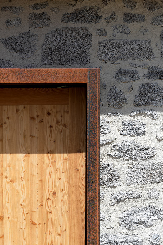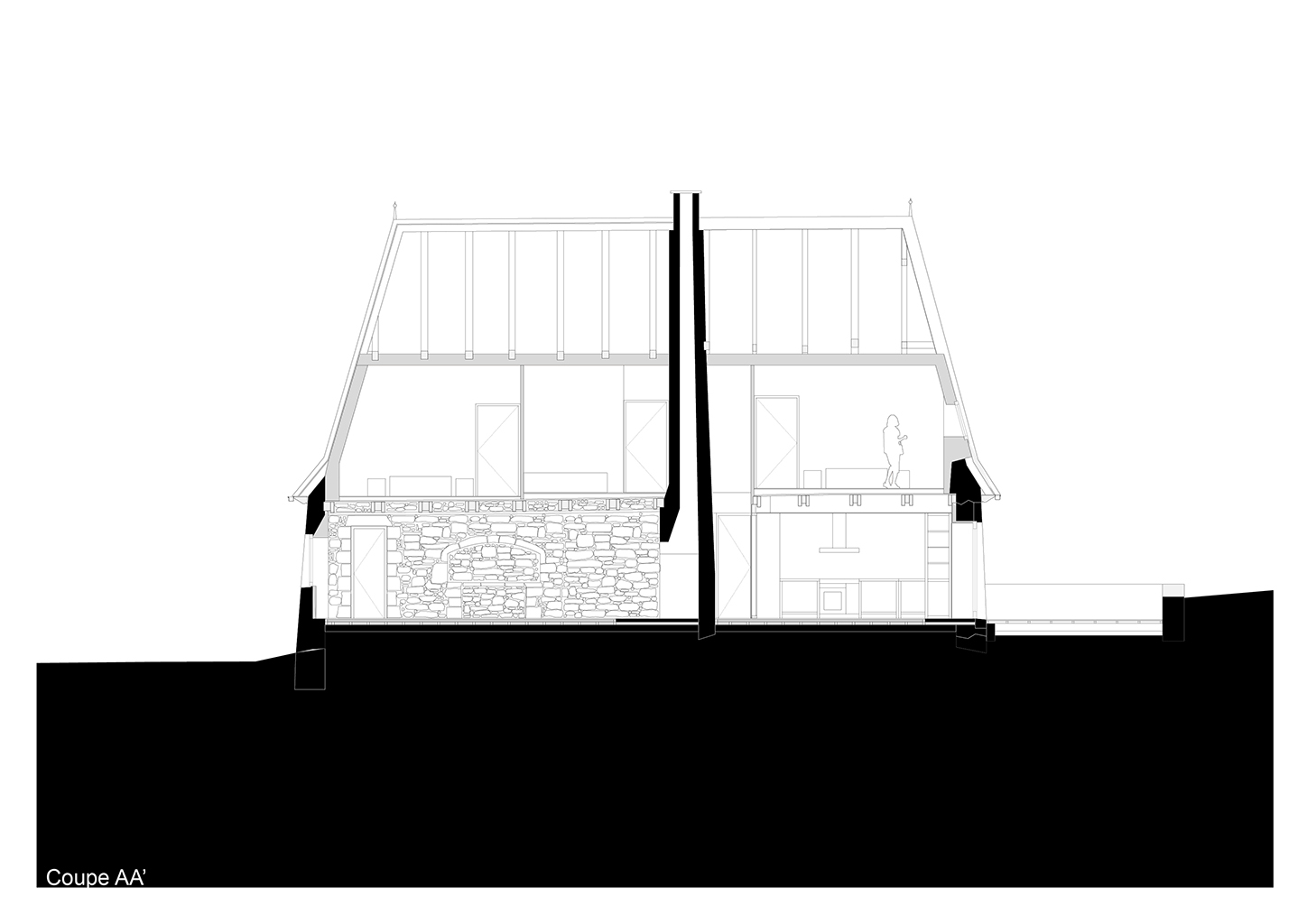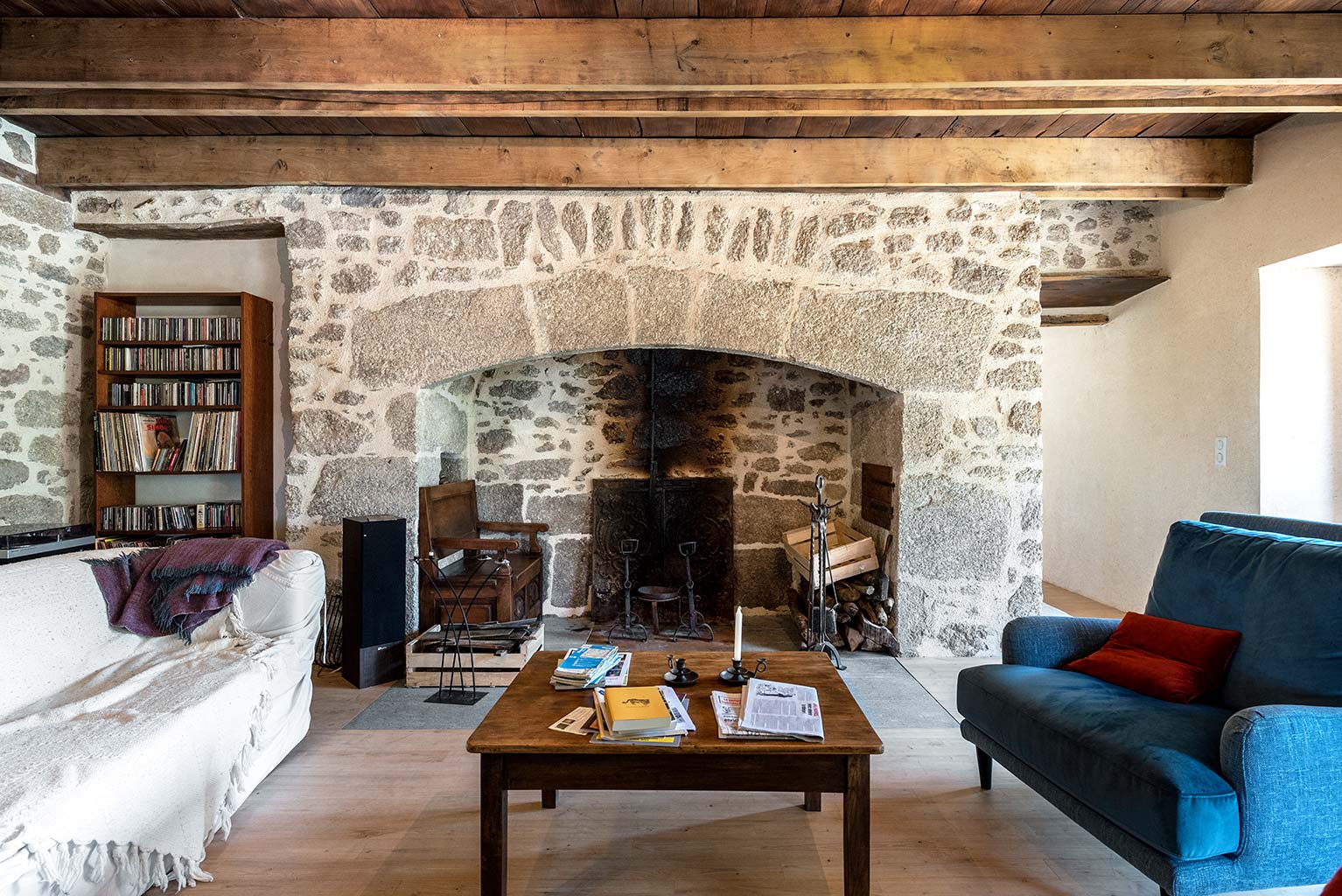 Le projet consiste en la réhabilitation d’une maison traditionnelle de la Chataigneraie Cantalienne. Dépourvue de tout confort, la maison a fait l’objet d’une transformation lourde. La toiture traditionnelle en lauzes de schiste a été entièrement déposée et refaite selon les savoir-faire locaux, encore très vivaces. Plutôt que de percer le toit pour trouver de nouveaux apports en lumière naturelle, nous avons choisi de percer la façade sud généreusement. Un cadre en acier recompose la façade et regroupe en un seul dispositif plusieurs baies ainsi que des volets coulissants en mélèze. A l’intérieur, les planchers en bois ont été consolidés selon un assemblage moisé de solives en chêne. Les anciens parquets en chêne ont été conservés en place et constituent aujourd’hui le plafond des pièces du rez-de-chaussée. Les nouveaux parquets sur lambourdes ont été réalisé en châtaignier, essence locale par excellence. Une isolation en ouate de cellulose, interposée entre les deux parquets, améliore la performance acoustique entre les niveaux. Les murs intérieurs ont été doublé avec un enduit épais en chanvre et chaux. A l’extérieur, les façades en moellons de granite ont été rejointoyées avec un enduit traditionnel à la chaux de Saint Astier. Ainsi la perspirance des murs est-elle garantie. La charpente existante et les cloisons sont isolés avec des isolants biosourcés en fibre de bois et chanvre. Les techniques traditionnelles et alternatives ont été mises au service des enjeux contemporains : performance de l’enveloppe, confort thermique et hygrométrique, confort visuel, valorisation des ressources et des savoir-faire locaux, logiques de circuits-courts.