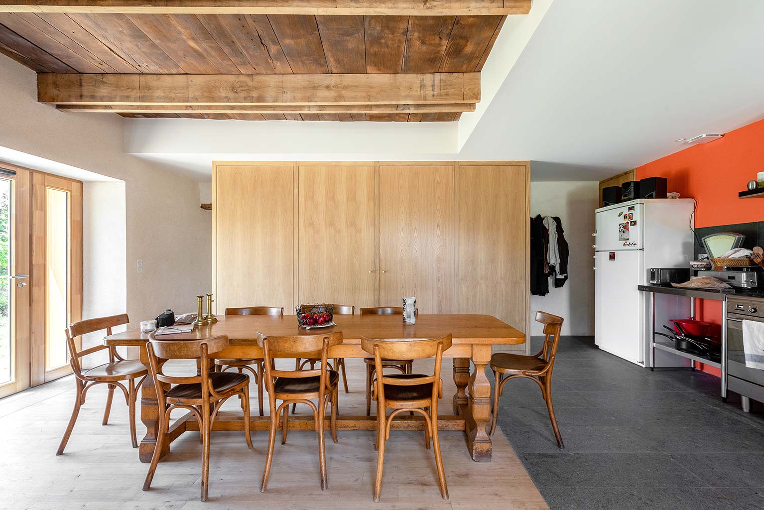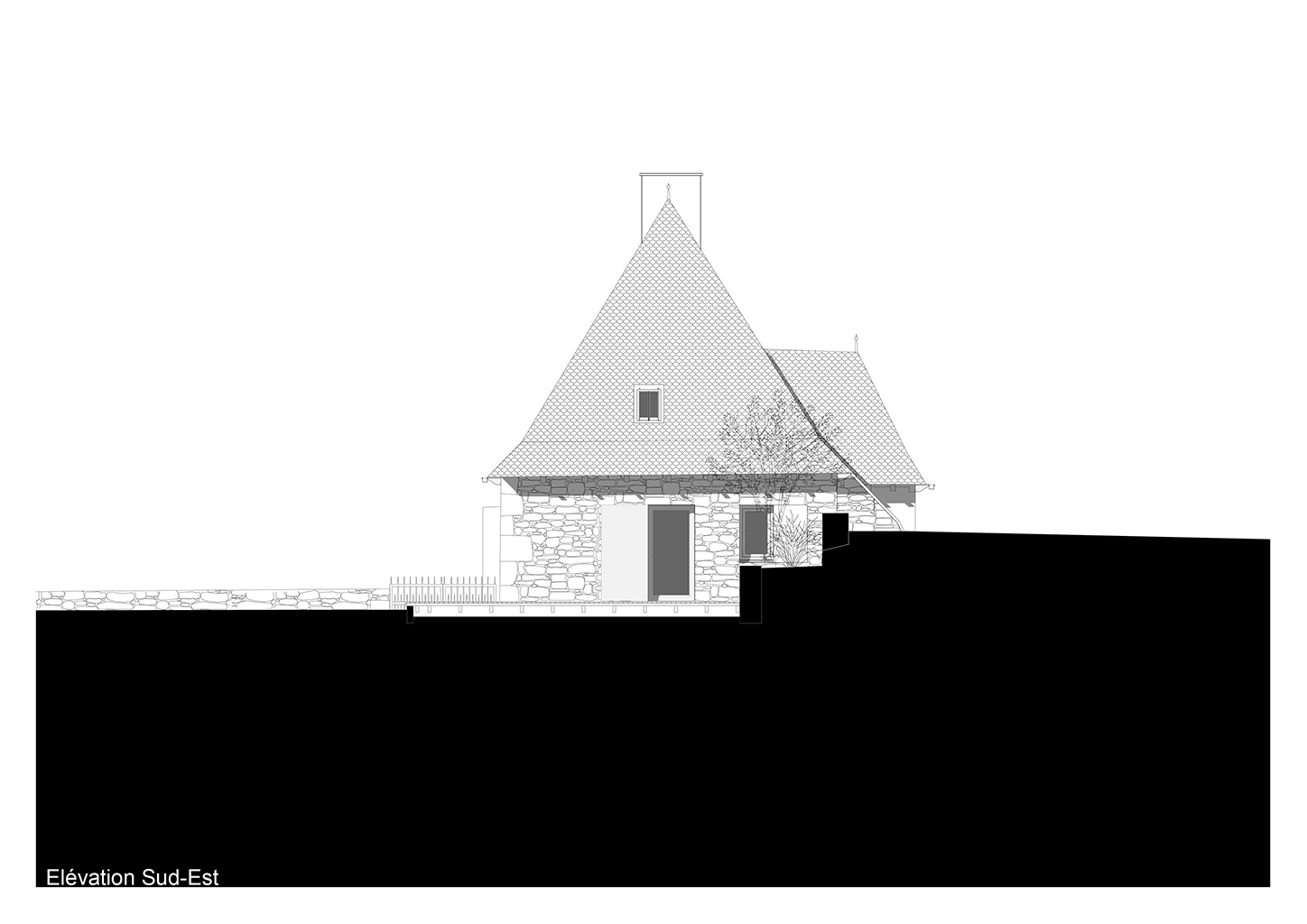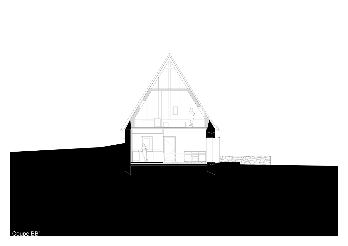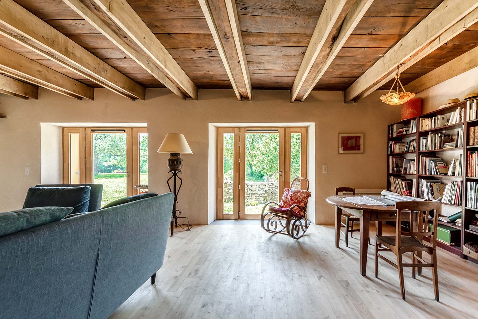 Le projet consiste en la réhabilitation d’une maison traditionnelle de la Chataigneraie Cantalienne. Dépourvue de tout confort, la maison a fait l’objet d’une transformation lourde. La toiture traditionnelle en lauzes de schiste a été entièrement déposée et refaite selon les savoir-faire locaux, encore très vivaces. Plutôt que de percer le toit pour trouver de nouveaux apports en lumière naturelle, nous avons choisi de percer la façade sud généreusement. Un cadre en acier recompose la façade et regroupe en un seul dispositif plusieurs baies ainsi que des volets coulissants en mélèze. A l’intérieur, les planchers en bois ont été consolidés selon un assemblage moisé de solives en chêne. Les anciens parquets en chêne ont été conservés en place et constituent aujourd’hui le plafond des pièces du rez-de-chaussée. Les nouveaux parquets sur lambourdes ont été réalisé en châtaignier, essence locale par excellence. Une isolation en ouate de cellulose, interposée entre les deux parquets, améliore la performance acoustique entre les niveaux. Les murs intérieurs ont été doublé avec un enduit épais en chanvre et chaux. A l’extérieur, les façades en moellons de granite ont été rejointoyées avec un enduit traditionnel à la chaux de Saint Astier. Ainsi la perspirance des murs est-elle garantie. La charpente existante et les cloisons sont isolés avec des isolants biosourcés en fibre de bois et chanvre. Les techniques traditionnelles et alternatives ont été mises au service des enjeux contemporains : performance de l’enveloppe, confort thermique et hygrométrique, confort visuel, valorisation des ressources et des savoir-faire locaux, logiques de circuits-courts.