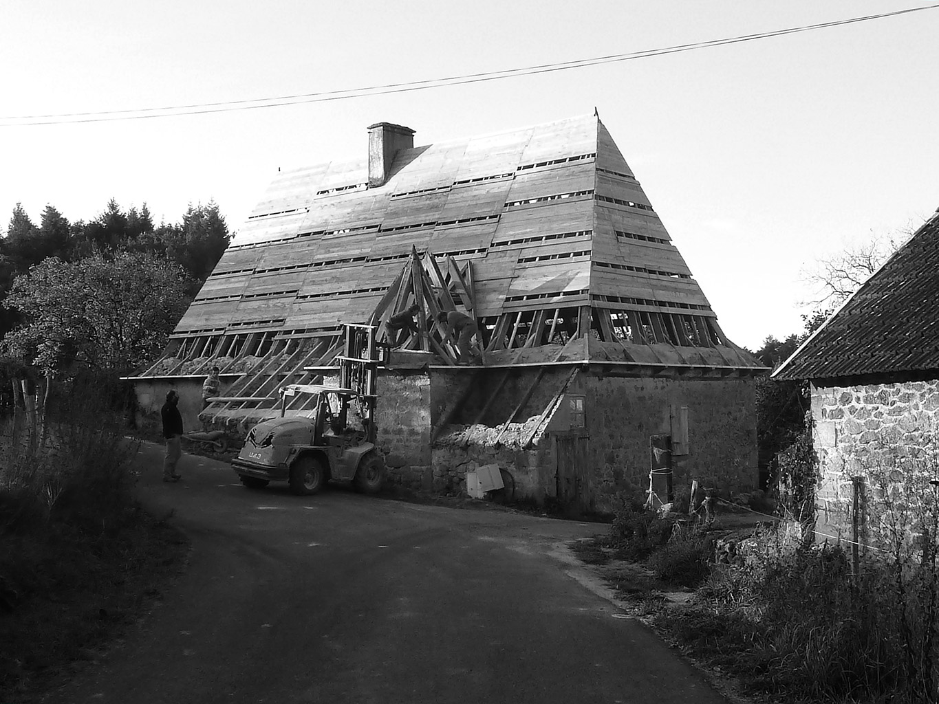 Le projet consiste en la réhabilitation d’une maison traditionnelle de la Chataigneraie Cantalienne. Dépourvue de tout confort, la maison a fait l’objet d’une transformation lourde. La toiture traditionnelle en lauzes de schiste a été entièrement déposée et refaite selon les savoir-faire locaux, encore très vivaces. Plutôt que de percer le toit pour trouver de nouveaux apports en lumière naturelle, nous avons choisi de percer la façade sud généreusement. Un cadre en acier recompose la façade et regroupe en un seul dispositif plusieurs baies ainsi que des volets coulissants en mélèze. A l’intérieur, les planchers en bois ont été consolidés selon un assemblage moisé de solives en chêne. Les anciens parquets en chêne ont été conservés en place et constituent aujourd’hui le plafond des pièces du rez-de-chaussée. Les nouveaux parquets sur lambourdes ont été réalisé en châtaignier, essence locale par excellence. Une isolation en ouate de cellulose, interposée entre les deux parquets, améliore la performance acoustique entre les niveaux. Les murs intérieurs ont été doublé avec un enduit épais en chanvre et chaux. A l’extérieur, les façades en moellons de granite ont été rejointoyées avec un enduit traditionnel à la chaux de Saint Astier. Ainsi la perspirance des murs est-elle garantie. La charpente existante et les cloisons sont isolés avec des isolants biosourcés en fibre de bois et chanvre. Les techniques traditionnelles et alternatives ont été mises au service des enjeux contemporains : performance de l’enveloppe, confort thermique et hygrométrique, confort visuel, valorisation des ressources et des savoir-faire locaux, logiques de circuits-courts.