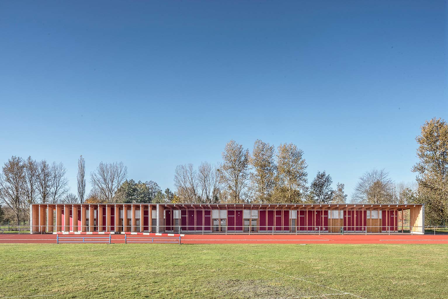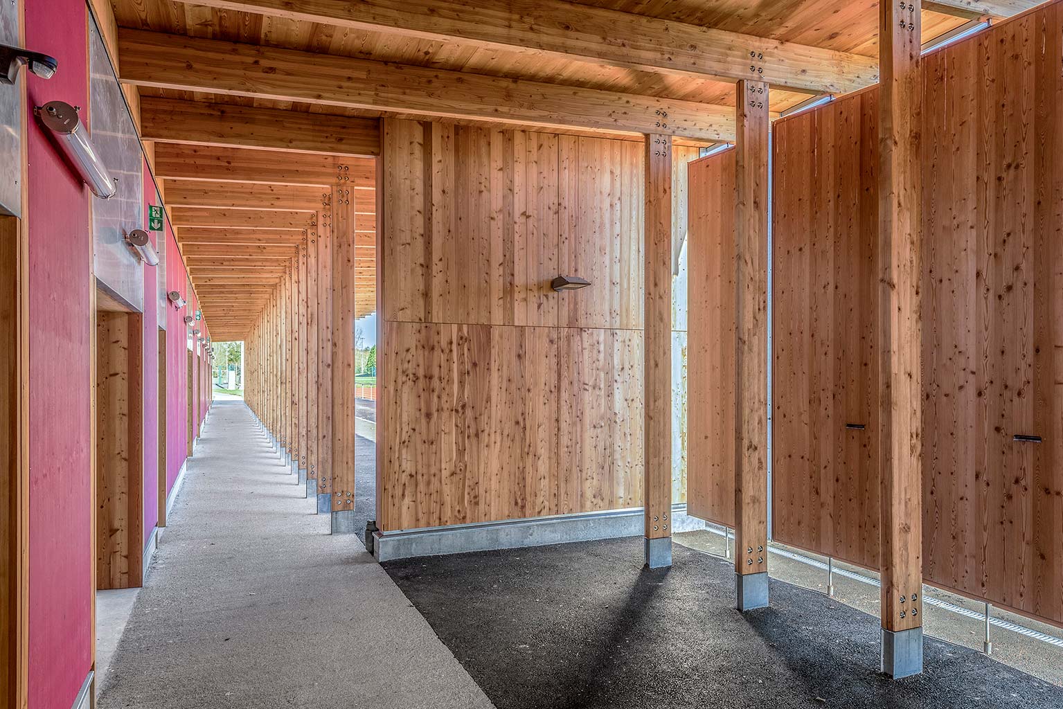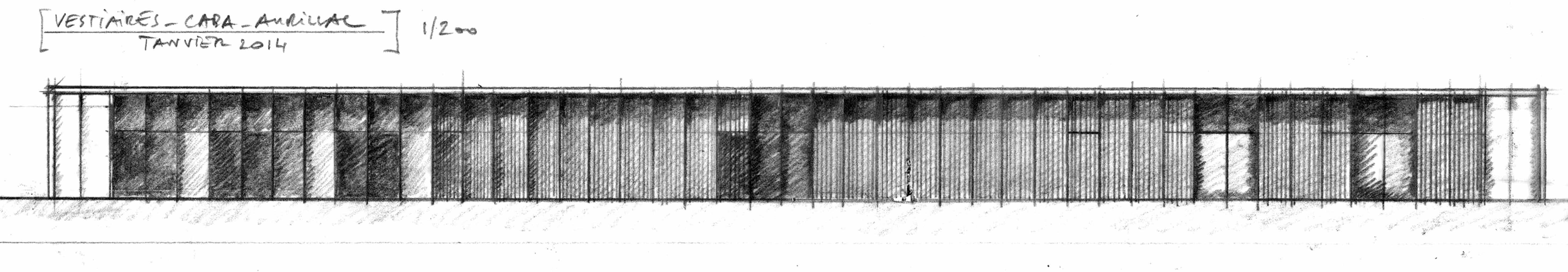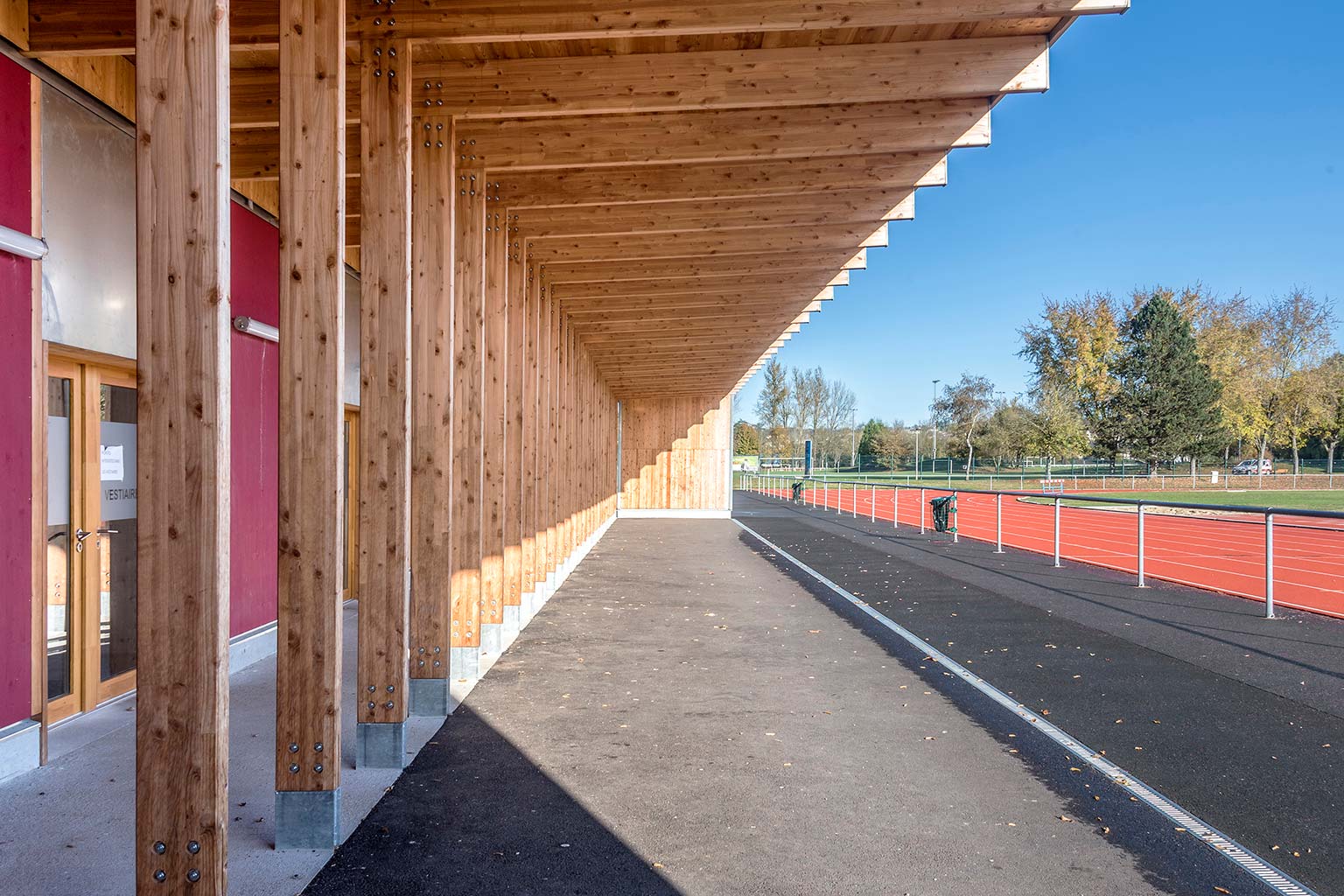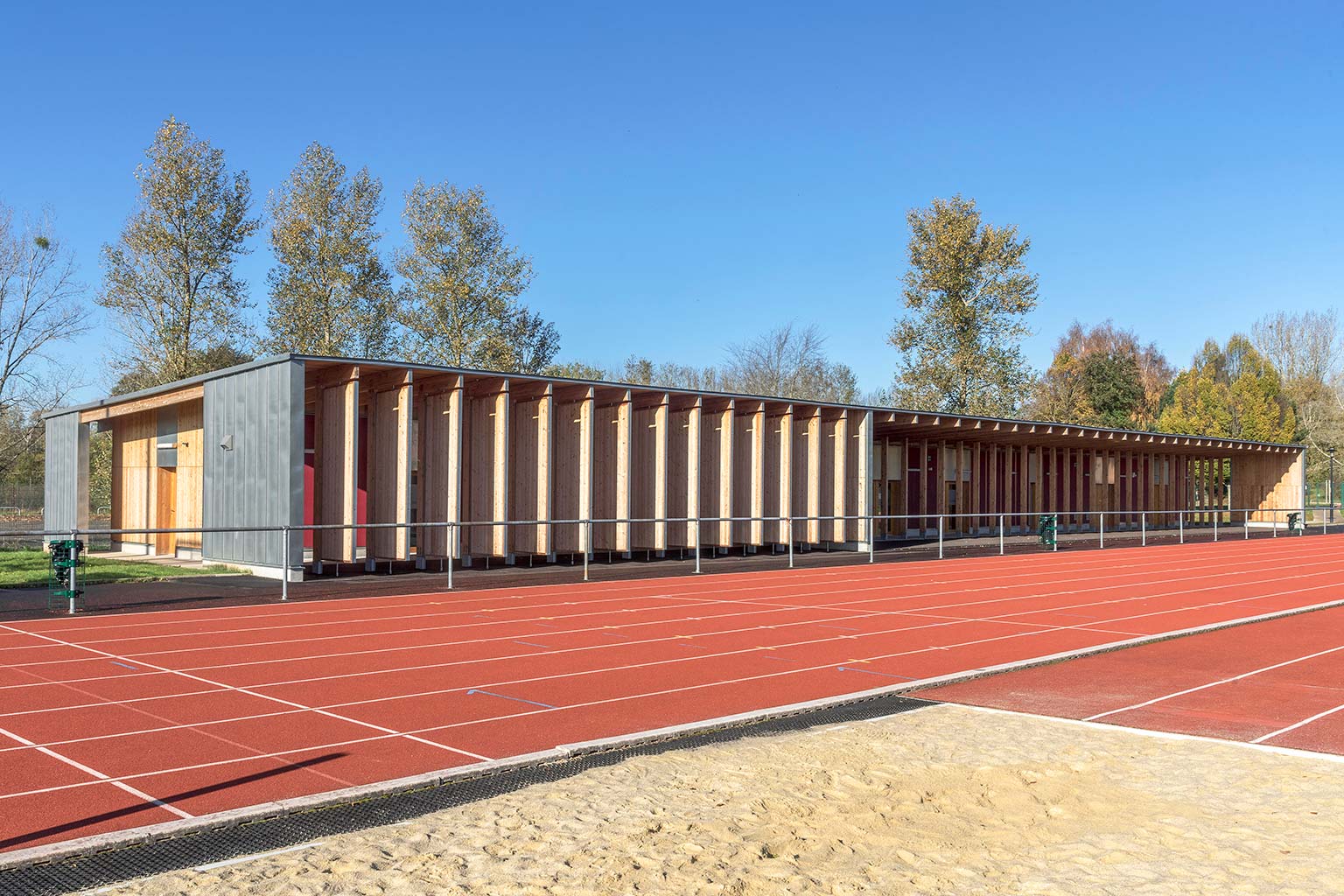 L’équipement sportif du stade d’athlétisme de la CABA comprend des vestiaires, un rangement pour le matériel, des bureaux, un auvent abritant le public et un espace d’échauffement pour les coureurs. L’édifice implanté le long de la piste est conçu comme une halle sous laquelle se glisse un volume linéaire comprenant le programme hors d’air. La halle est composée de portiques resserrés en douglas qui produisent un rythme cinétique le long de la piste. La conception des portiques permet la réalisation d’une large toiture en porte-à-faux abritant les gradins amovibles et l’espace d’échauffement lequel est muni de volets brise-vent montés sur pivots. Pour des questions de pérennité et d’entretien des matériaux de façades, l’enveloppe de l’édifice exposée aux intempéries est revêtue de zinc naturel tandis que les murs abrités sous la halle sont en panneaux trois plis mélèze.